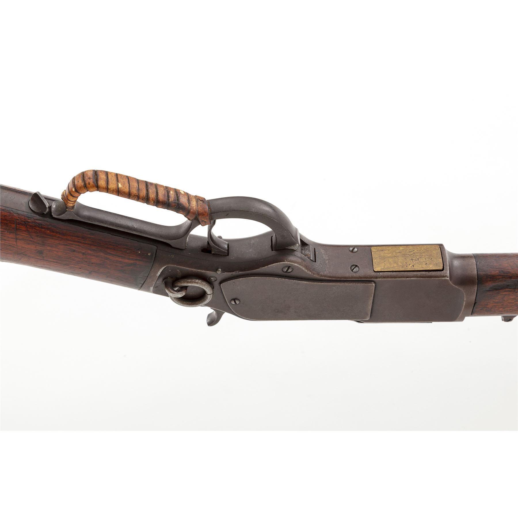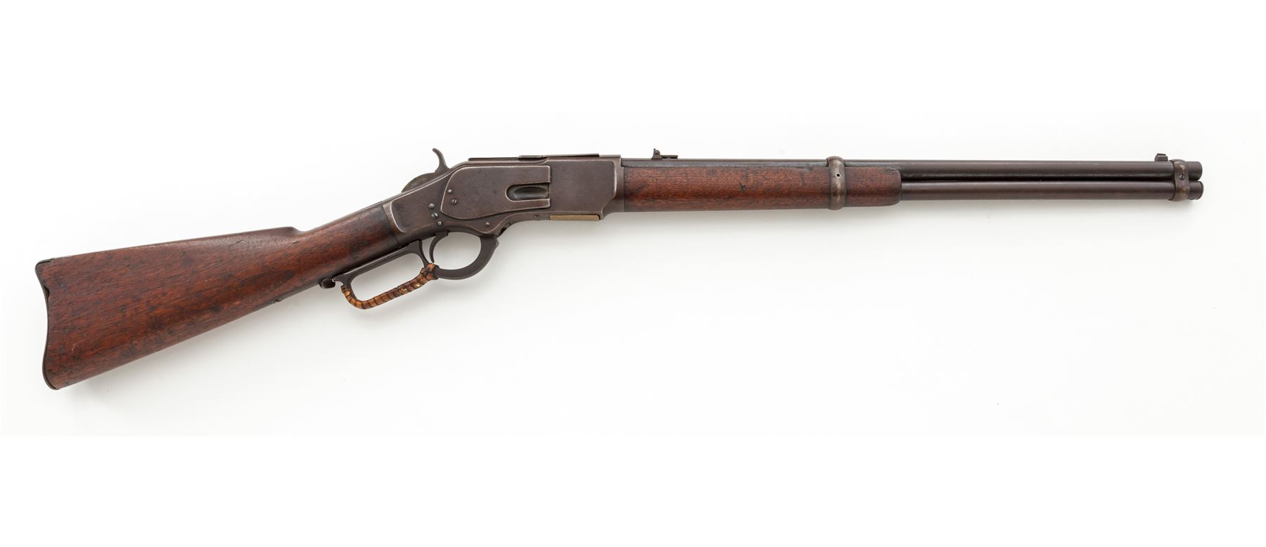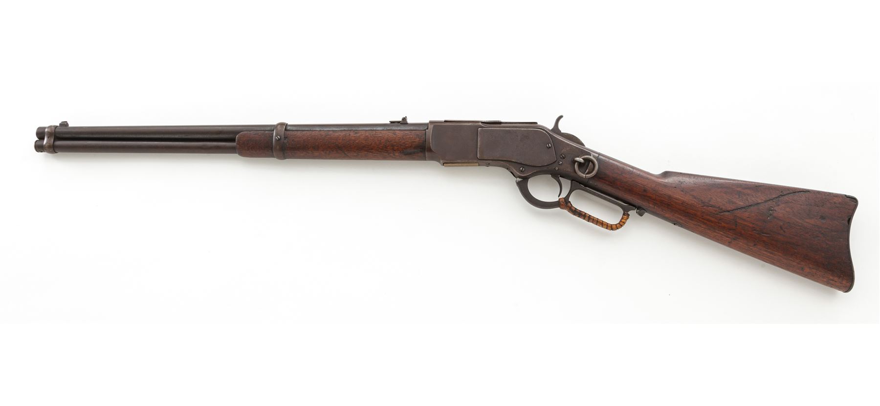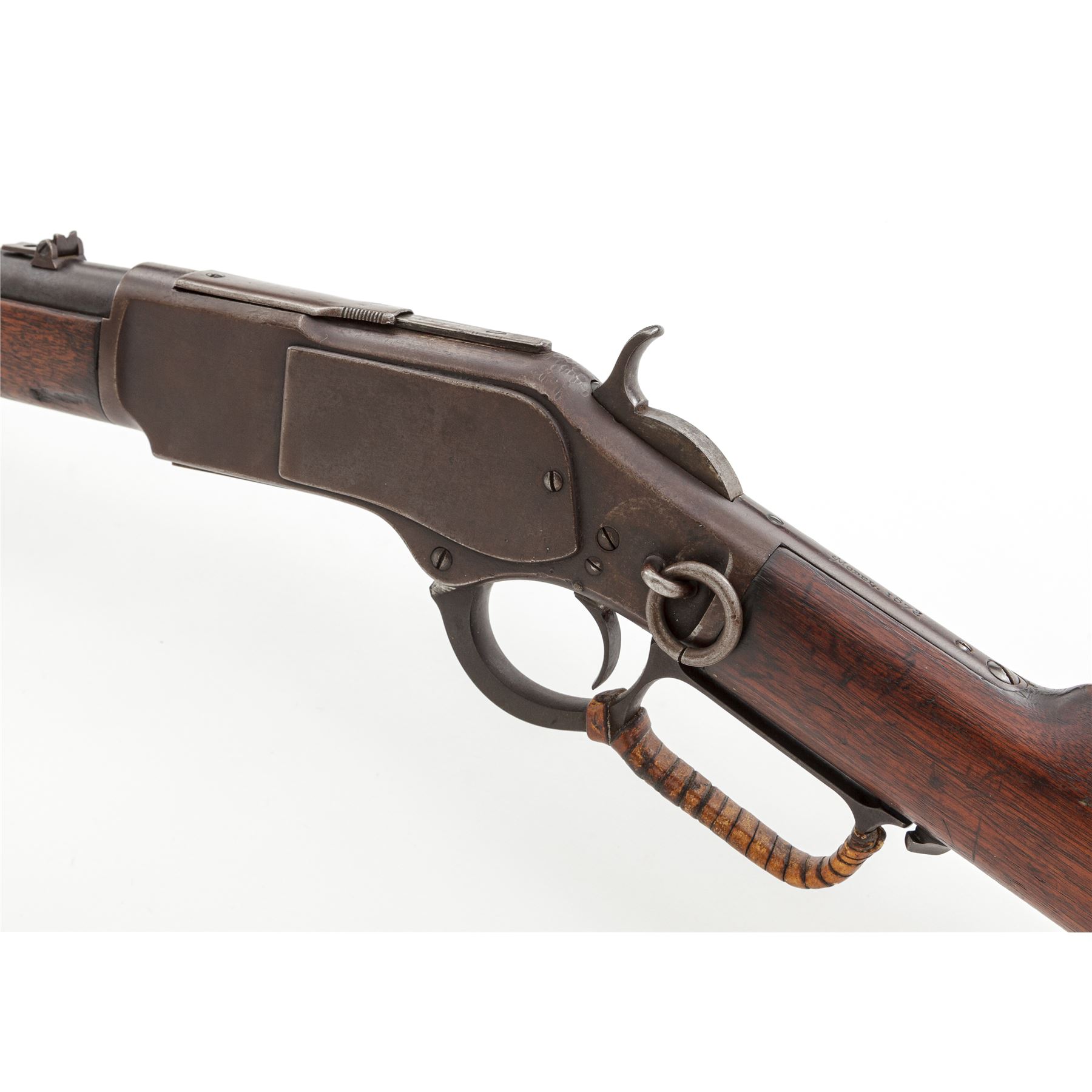 Antique Winchester Model 1873 Lever Action Saddle Ring Carbine, Late 2nd Model, #62824, .44-40 CF cal., 20'' barrel with block-blade front and single-leaf rear sights marked with the Winchester name, address and King's Improvement patent dates in two lines; full-length magazine tube; steel receiver with sliding ejection port dustcover and left-side saddle ring, marked ''Model 1873'' on top tang and serial number on lower tang; steel operating lever (with old rawhide wrapping), two barrel bands and carbine buttplate with sliding cover opening to butt trap for jointed cleaning rod (not present); oil-stained walnut forend and buttstock. Mfg'd ca. 1879-80. Condition is very good. Metal is a smooth dark bluish-brown (having traces of blue in protected areas); markings are legible (caliber markings lacking on barrel and cartridge lifter). Stocks are solid (1'' gouge on left side of forearm; 5'' scrape on left side of buttstock). Action is smooth; bore is clean with deep rifling. A desirable early '73 carbine. Est.: $1,200-$1,800. (Antique)