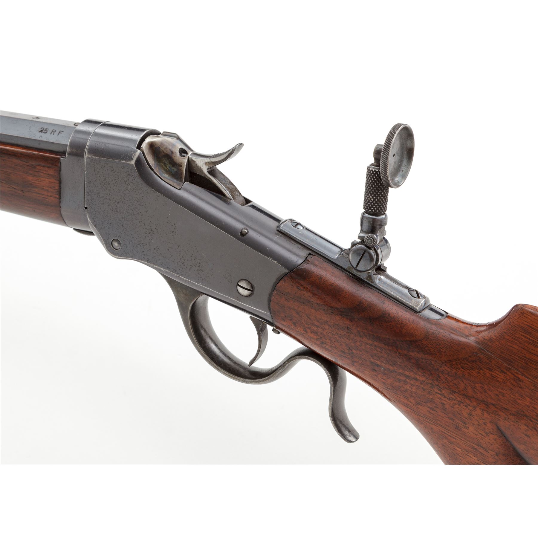 Lovely Winchester Model 1885 Takedown ''Low-Wall'' Scheutzen-Style Single Shot Sporting Rifle, #114592, .25 RF cal., blued 26'' octagonal barrel with dovetailed hooded Beach-type front sight, two sets of screw-filled holes for rear sights, and folding adjustable peep tang sight, marked with the Winchester name, address and 1879-1907 patent dates on left angled flat, ''25 RF'' and an oval ''W'' proofmark at breech, and ''1'' underneath (denoting weight of the barrel); blued ''Thickside'' frame with takedown button at bottom-front, case hardened serpentine operating lever, dropping-block action, and hammer; varnished pistol-grip buttstock with oval hard rubber gripcap having ''Winchester Repeating Arms Co.'' on its circumference and a nickeled Swiss-style buttplate, matching forearm with buffalo horn inlay at Schnabel tip. Mfg'd ca. 1919, with full-blued finish. Condition is excellent+. Blued parts retain approx. 96% original deep glossy finish (minor wear at muzzle/front sight area), case hardening with strong mottling and colors. Stocks with 85% original varnish (fit ''proud'' to the metal, have a dent at top of wrist on right side) and very minor handling marks, buttplate with most of its bright original nickel. Action is smooth and light; bore is clean, shiny and with defined rifling. This rifle, with its uncommon varnished, pistol-grip Schuetzen-style stocks, tang sight, takedown feature, and .25 rimfire caliber is a rare find, indeed. Est.: $2,500-$3,500. (C&R)