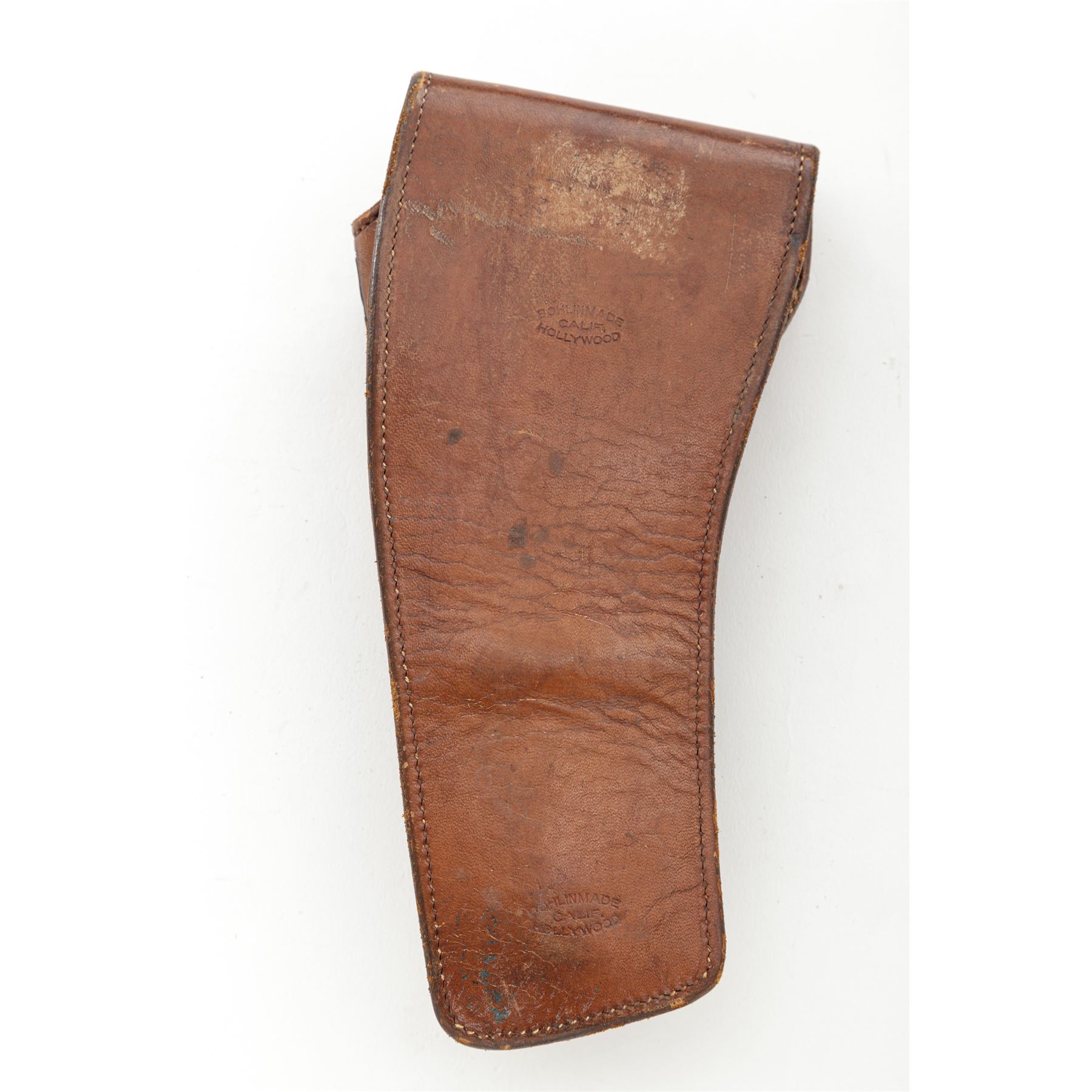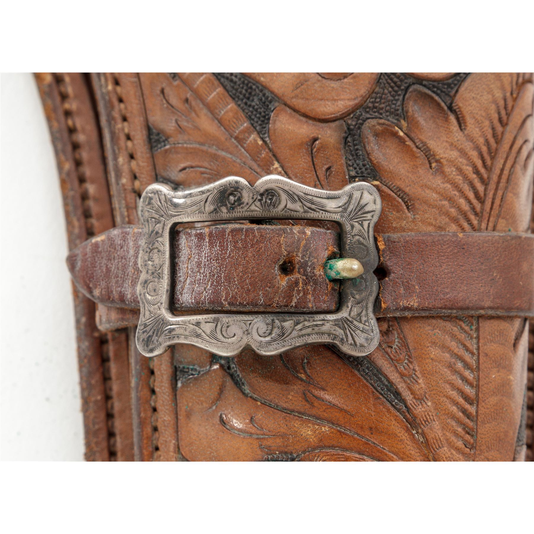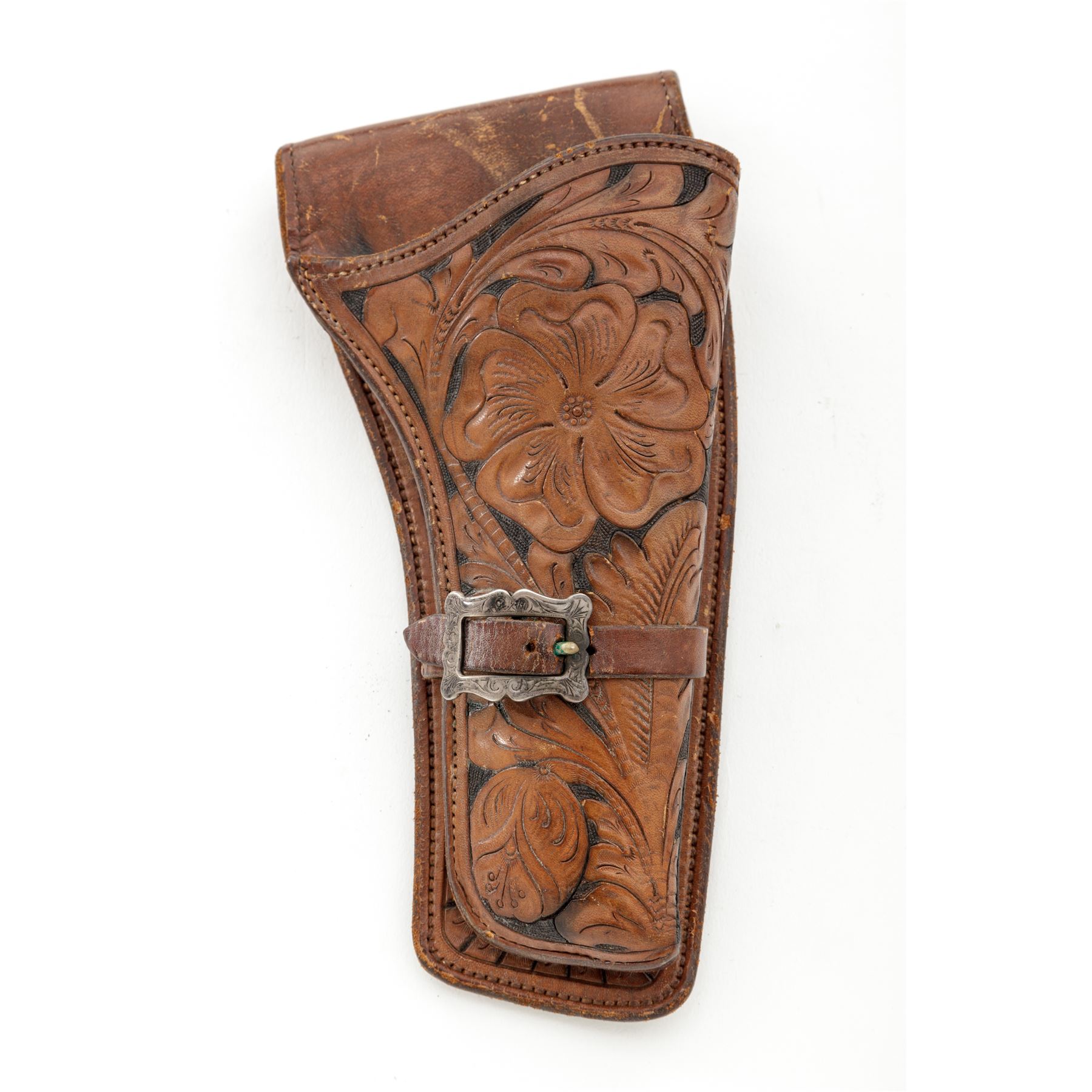 Hand-Tooled Russet Leather ''Mexican Loop'' Western Holster, by Edward Bohlin, with engraved sterling silver buckle, c. 1930s-50s, made to fit a small frame revolver with barrel length up to about 4-3/4''. The holster body is completely hand-tooled in the old-time ''California'' pattern of large flowers and leaves against a stippled background tinted a dark brown-black color to accentuate the deep relief of the carving. Even the back flap is border tooled with the same dark background. This style of holster, which supposedly originated in northern Mexico, features a full-length ''skirt'' turned behind the body to form a loop that could easily slip over a bulky cartridge belt; the rear flap also kept the holster from riding up when the gun was drawn. Edward H. Bohlin ran away from his Swedish home at age 15 for the U.S., where he roamed the West before settling in Hollywood in the 1920s. There he became ''Saddlemaker to the Stars'' during Tinseltown's Golden Age of Western films, and gained fame for his elaborate (and expensive) gold- and silver-decorated saddles used in the legendary Pasadena Rose Parade. Condition of the holster is fine, being a smooth light russet color with bold details, and marked ''Bohlinmade/Calif./Hollywood'' in an oval on the reverse side of the skirt. Silver buckle has light tarnish; stitching is sound throughout; leather shows just light handling, age and use. Est.: $700-$900.