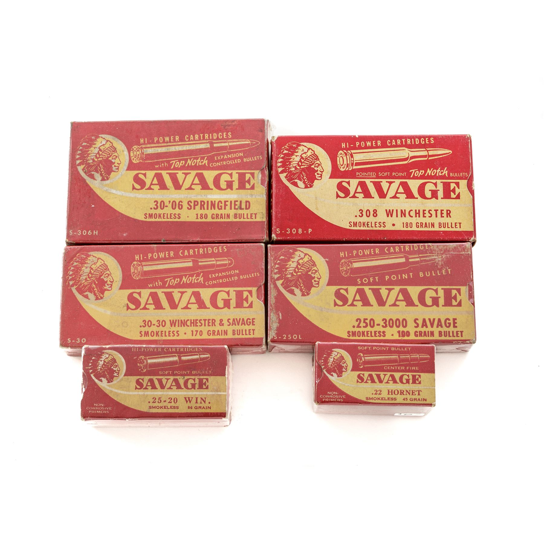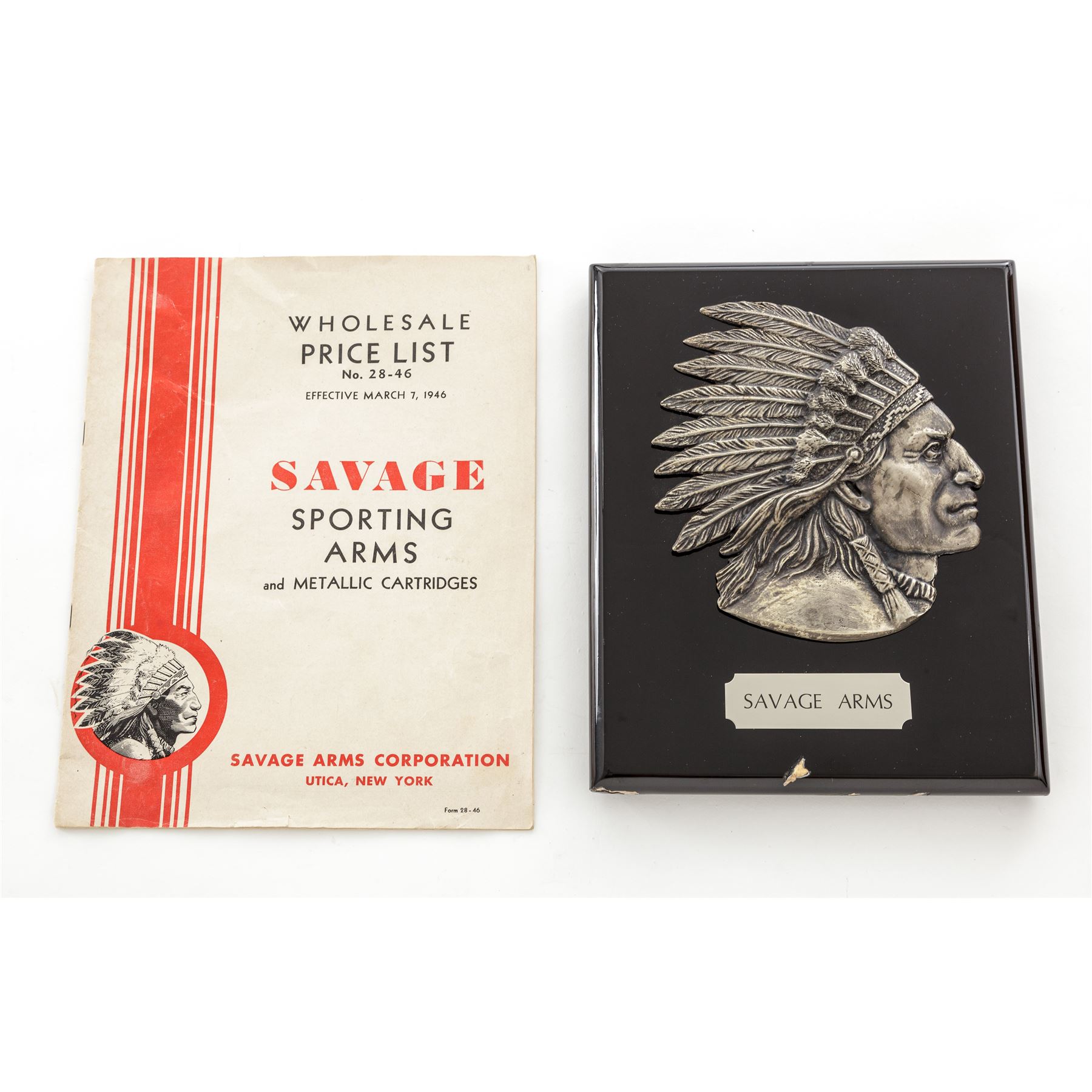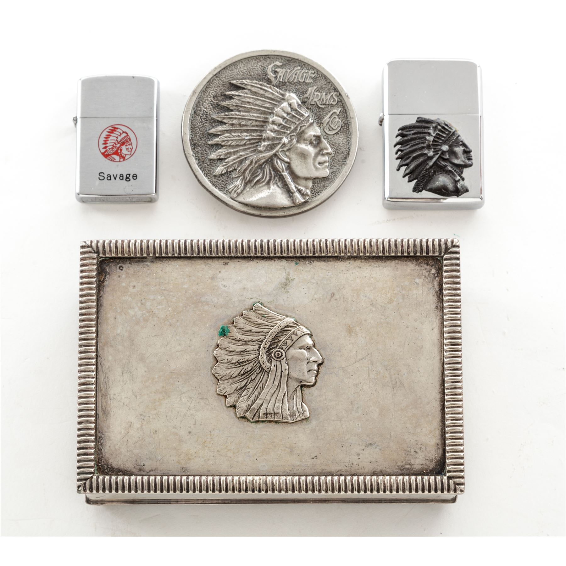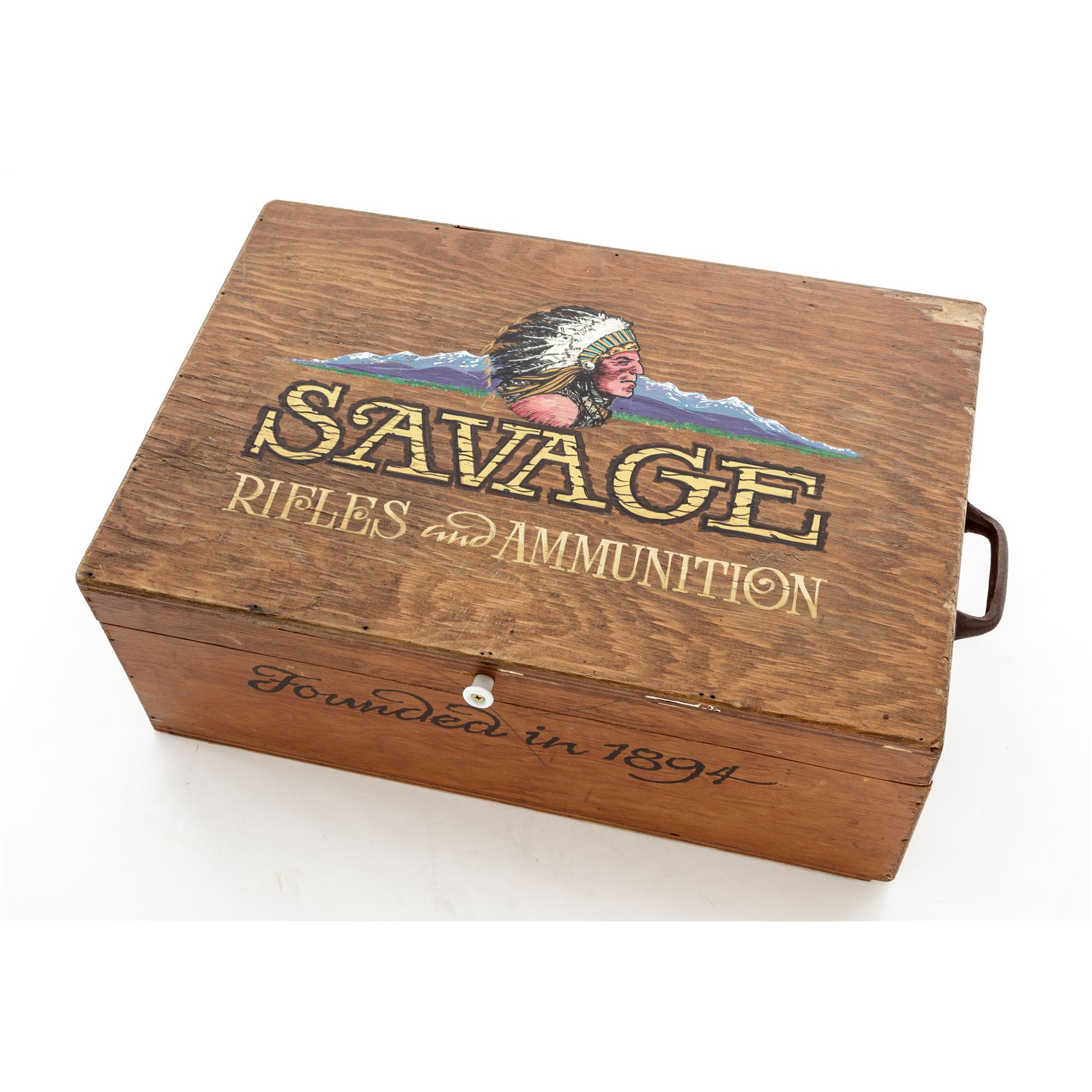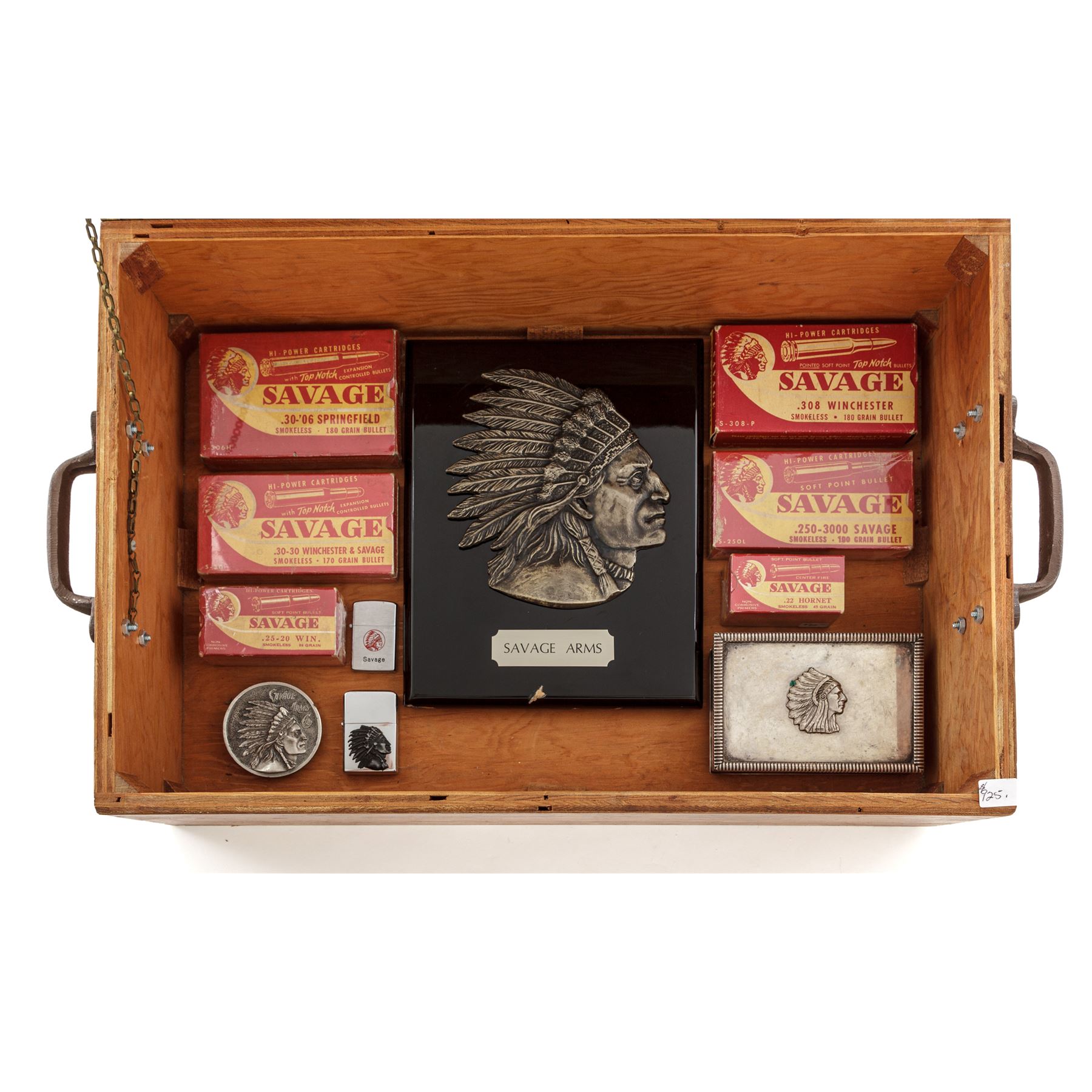 Savage Arms Memorabilia Lot: Hand-Painted Wood Box, Ammo, Plaque, etc. Lot consists of a vintage wood box that measures approx. 21''x14''x8'' with a nicely done hand-painted Savage Rifles & Ammunition logo on the lid; front edge reads ''Founded in 1894''. Contents includes the following collectible Savage ammunition in the original red and yellow boxes: empty box of .308 Winchester; .250-3000 Savage with 18-fired rounds; full box of .30-30 Win; full box of .30-06; full box of .22 Hornet; full box of .25-20. Also included is a Savage Arms Wholesale Price List dated 1946; black plaque with cast Savage Indian Head logo and reads ''Savage Arms''; belt buckle; Savage lighter with red Indian Head logo; lighter with added ''Indian Head'' medallion; silver cigarette case with ''sterling'' marked Indian Chiefs Head, bottom with hallmarks. Cigarette case is not directly Savage Arms related but the logo is similar and displays well with the other items. Conditions vary but most items rate as very good and show normal signs of moderate age and wear. Most of the ammo boxes are complete, a few are missing an inside flap or two; the glue on one of the seams on the .22 Hornet has dried and broken loose but could be repaired. Brass cartridges are generally very good showing normal toning and a few have small spots of verdigris and staining. Modern black plaque with some chipping to the surface, cast Indian head is in nice condition and could easily be mounted to a new backing. Overall a good variety of Savage-related memorabilia. Est.: $600-$800/lot.