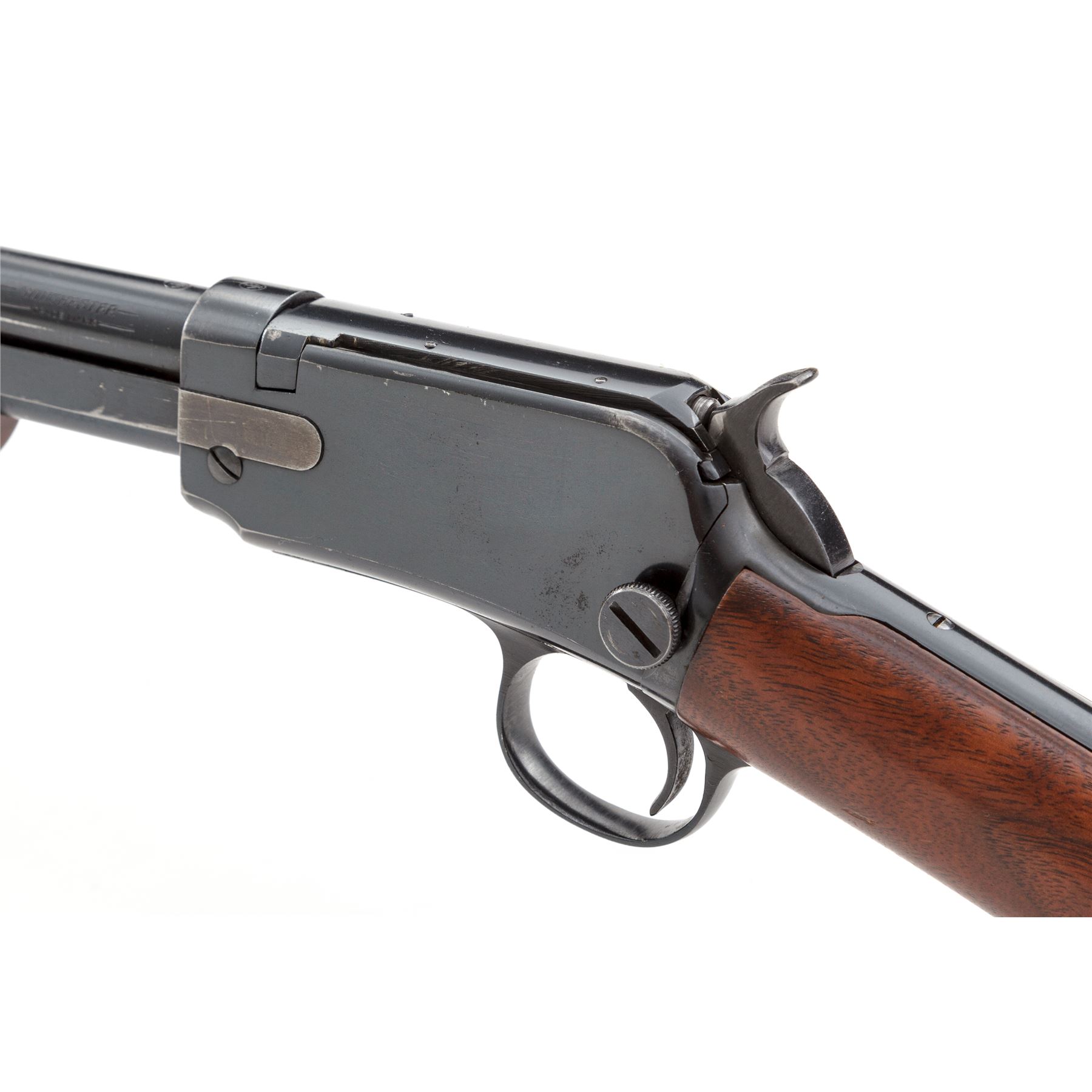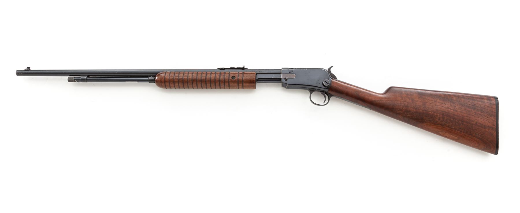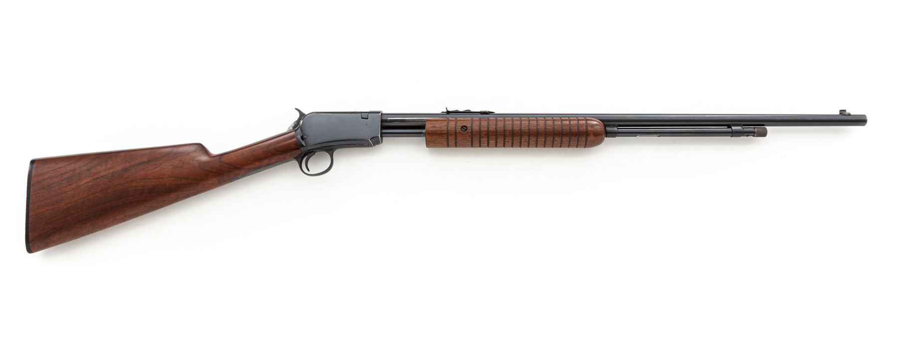 Winchester Model 62A Slide-Action Rifle, #123274, .22 S-L-LR cal., 23'' barrel, blue finish, walnut stock, 17-groove round forend. Mfg'd 1941. Condition is excellent retaining approx. 97% thinning bright blue. Stock with just the lightest impressions and is slightly reddish brown in appearance. Good action, bright bore. Est.: $750-$1,000. (C&R)