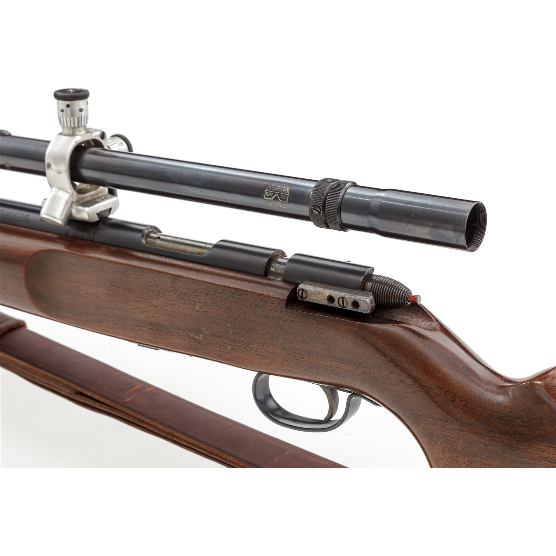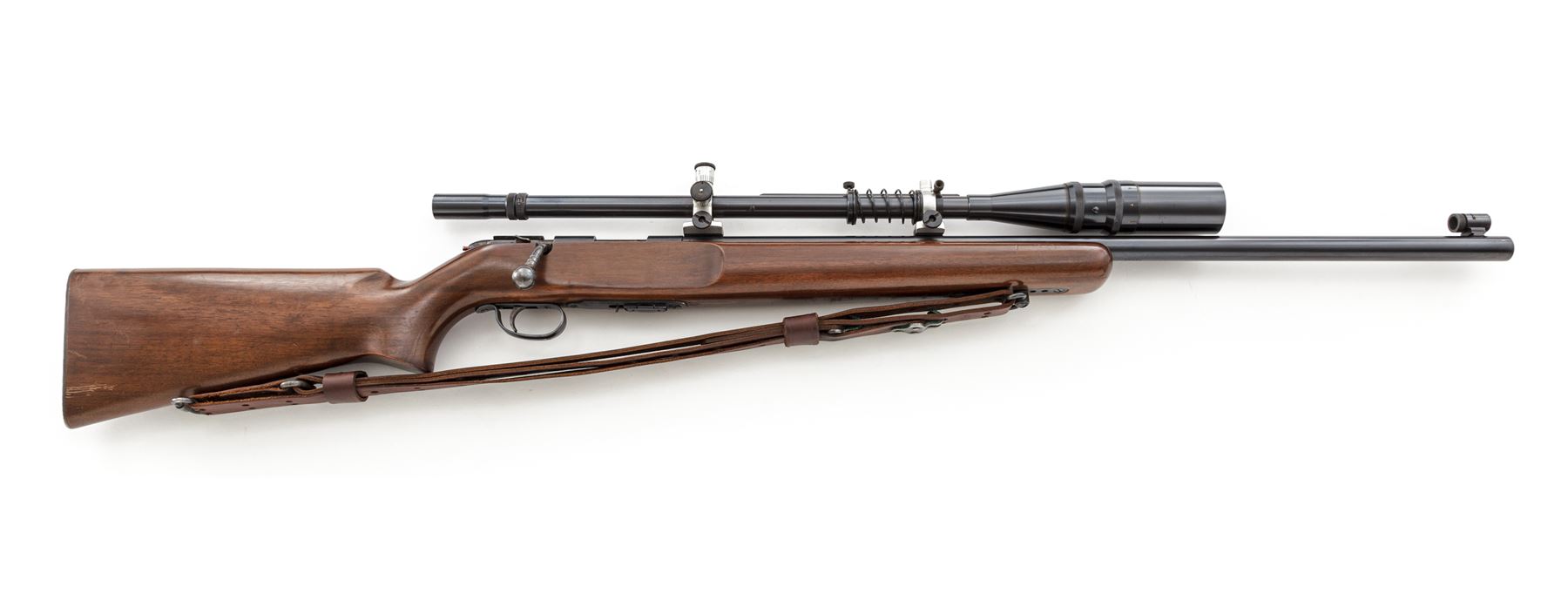 Remington 513-T Matchmaster Bolt Action Rifle, with Unertl Target Scope, #74226, .22 S-L-LR cal., 27'' barrel, blue finish, color case hardened bolt and receiver sight block; one-piece smooth pistol-grip walnut target stock, checkered steel buttplate, sling swivels, 1-1/4'' brown leather sling, globe front sight, with one factory magazine. Topped with a Unertl 10X target scope and adjustable aluminum Unertl mounts with recoil spring, threaded lens covers; scope is #21190 with fine crosshair reticle, blue finish, 25-1/8'' overall with a 3/4'' tube. Rifle with standard markings and ''XPP'' date code, mfg'd 1945. Metal is excellent retaining approx. 97% original blue finish, a little thinning on the triggerguard and magazine well accounts for most of the finish loss. Barrel address and other factory lettering is crisp and clear. Stock is very good retaining a majority of its varnish with some thinning and finish loss at the wrist and forend; wood with general small impressions and shallow scratches, all are pretty normal signs of handling and range wear; used but not abused. Bolt, scope block, and trigger retain most of their case colors. Very good smooth action, excellent clean bore. Scope is also excellent with only intermittent minor marks to the exterior, aluminum rings with a little dark spotting, optics are clean and clear. Est.: $800-$1,200. (C&R)