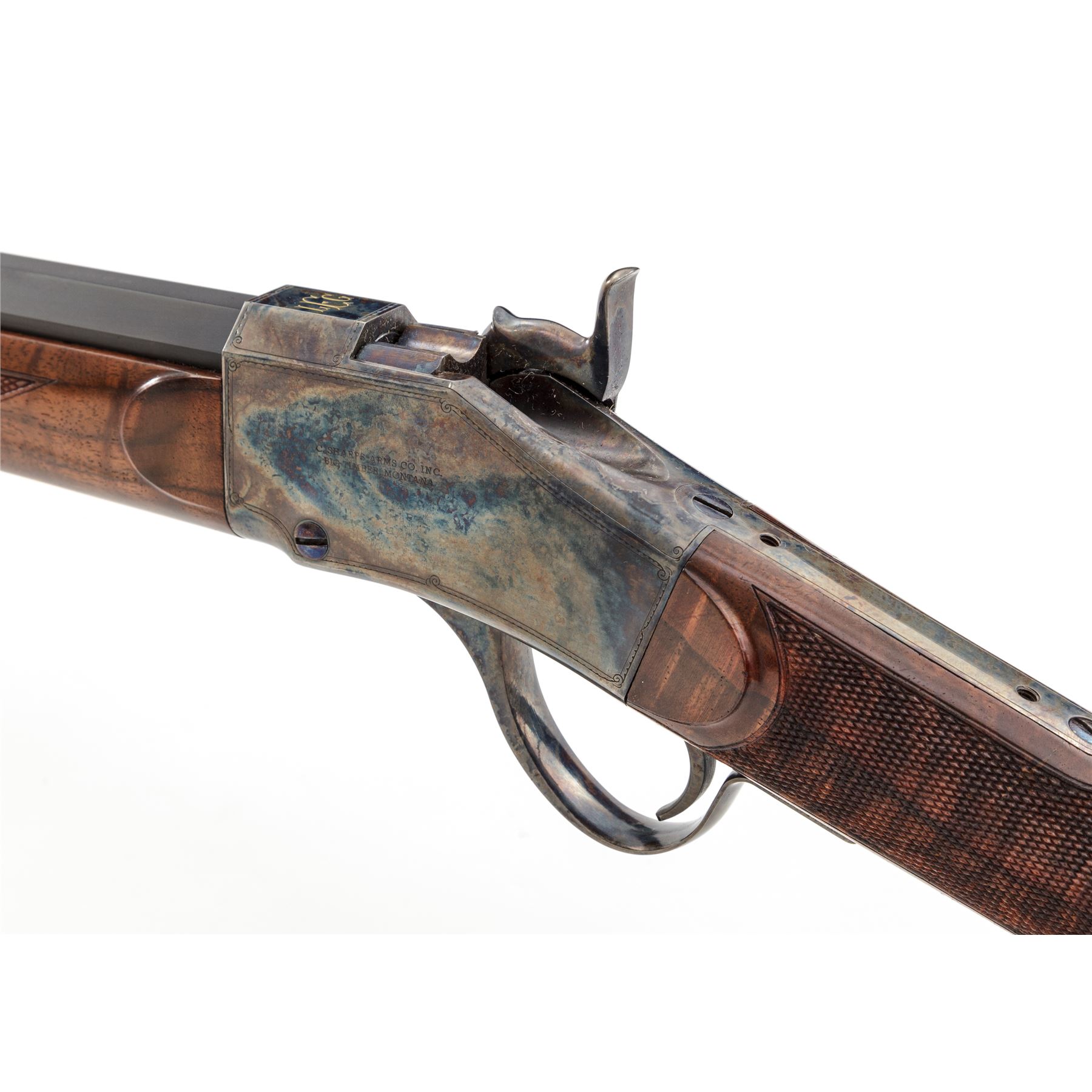 C. Sharps Arms Co. Classic Sporting Rifle, #0-264, .40-70 - 2-1/4 bottleneck cal., 30'' blue octagonal barrel; beautiful color case hardened receiver, lever, and hammer. Deluxe checkered straight grip stock and forend, with German silver forend cap, color case hardened crescent buttplate. Silver blade front sight, buckhorn rear sight. Edges of the receiver are decorated with fine engraving, as well as the initials '''LEG'' in gold to the octagon top receiver. Top of barrel marked ''Old Reliable''. Drilled and tapped for tang sight, missing the plug screws. Metal rates excellent overall retaining approx. 99% blue with vivid case coloring; German silver forend cap with some fine micro-scratching and a few moderate impressions. Nicely figured stock is very good+ with a fair amount of light scratches and light to moderate impressions, checkering is sharp. Smooth action, bright bore with excellent rifling. Est.: $900-$1,200. (Modern)