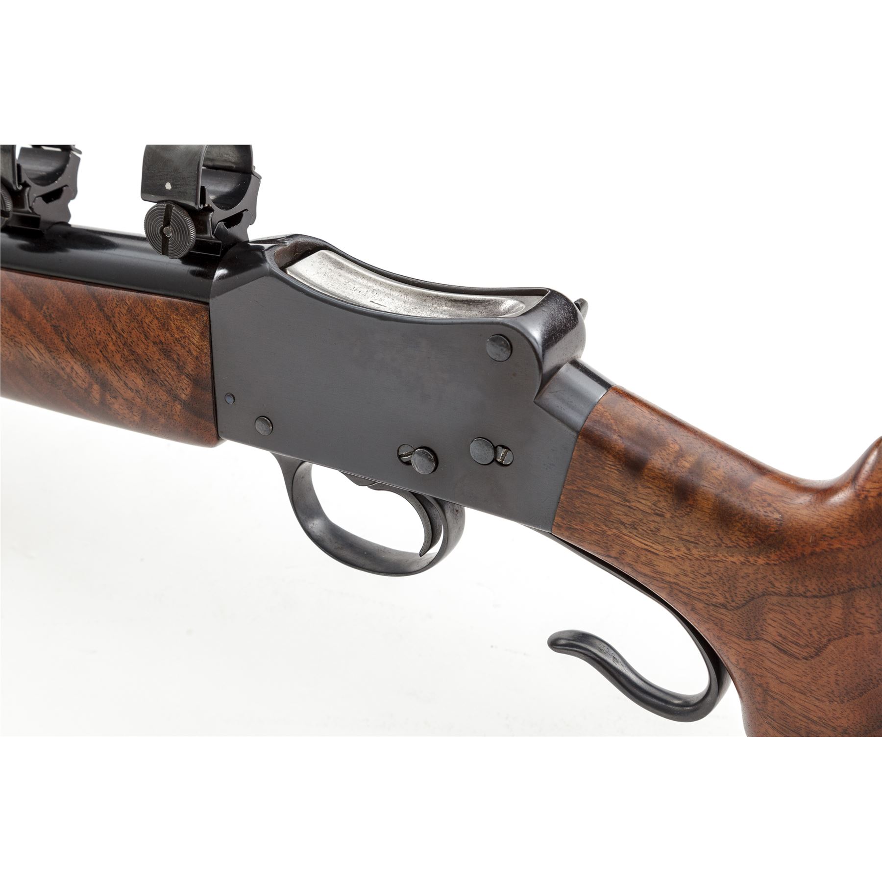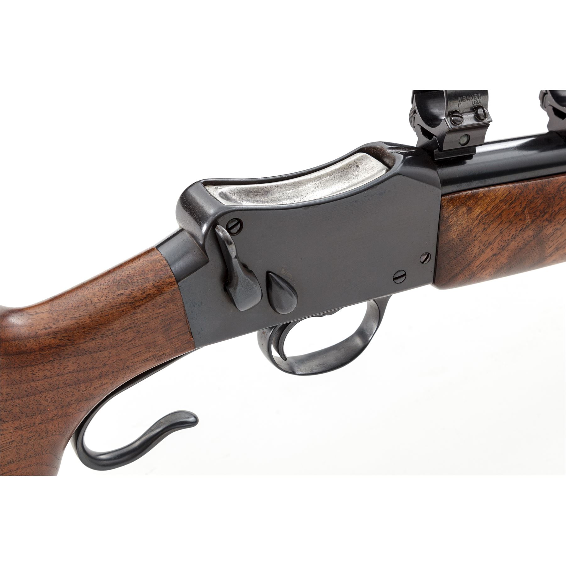 Custom W.W. Greener Single Shot Rifle, #5602, .38-55 cal., 20.5'' heavy barrel, blue finish, custom fancy pistol-grip cheekpiece walnut stock, with Weaver rings and mounts to rear portion of barrel. Hooked cocking lever, thumb safety, and cocking indicator are present. Condition is excellent as modified and refinished, showing approx. 98% thinning immersion blue. Stock and forend are excellent. Action is crisp, bore is bright. Est.: $500-$750. (Modern)
