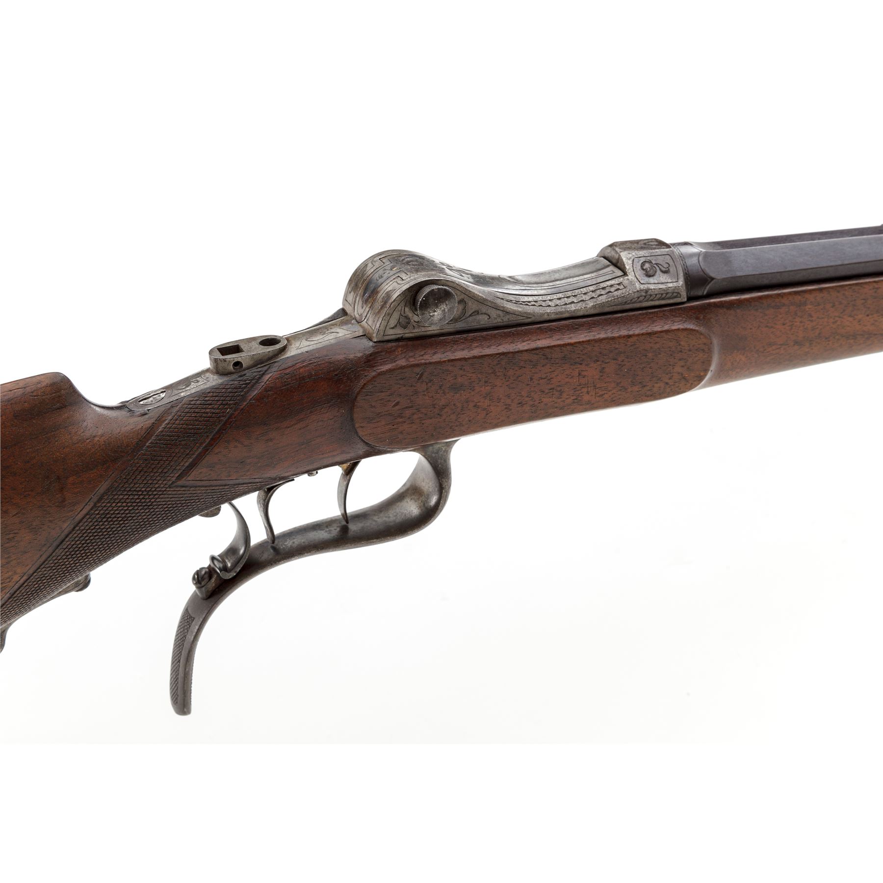 Deluxe European (likely German or Swiss) Semi-Schuetzen Single-Shot Sporting Rifle, NVSN, 8.5x46R CF cal., blued 29.25'' teardrop-octagonal barrel, with dovetailed adjustable front sight and no rear sight; barrel unmarked as to maker, has a 6'' raised flat located 4.25'' ahead of breech (doubtless for a clamp-type scope mount), and two blued ferrules underneath (lower with a sling swivel) for a cleaning rod (now missing); case hardened receiver is floral engraved and has an elevated mount for a rear tang sight (now missing), a serpentine operating lever (with external spring catch) that actuates the dropping-block action with automatic extraction, and a rear under-lever that releases the action from the stock; double set triggers; varnished European walnut halfstock is checkered at wrist, has raised aprons on either side of lock, a semi-Schnabel forend tip, carved left-side cheekpiece, sling swivel underneath, and steel buttplate. Condition is near fine. Barrel retains approx. 95% smooth blue, receiver with lovely muted case colors. Stock with use and handling marks, a few dings on cheekpiece, and a 4.25'' grain crack to forend tip. Action is smooth; bore is brilliant with deep rifling. Est.: $800-$1,200. (C&R)