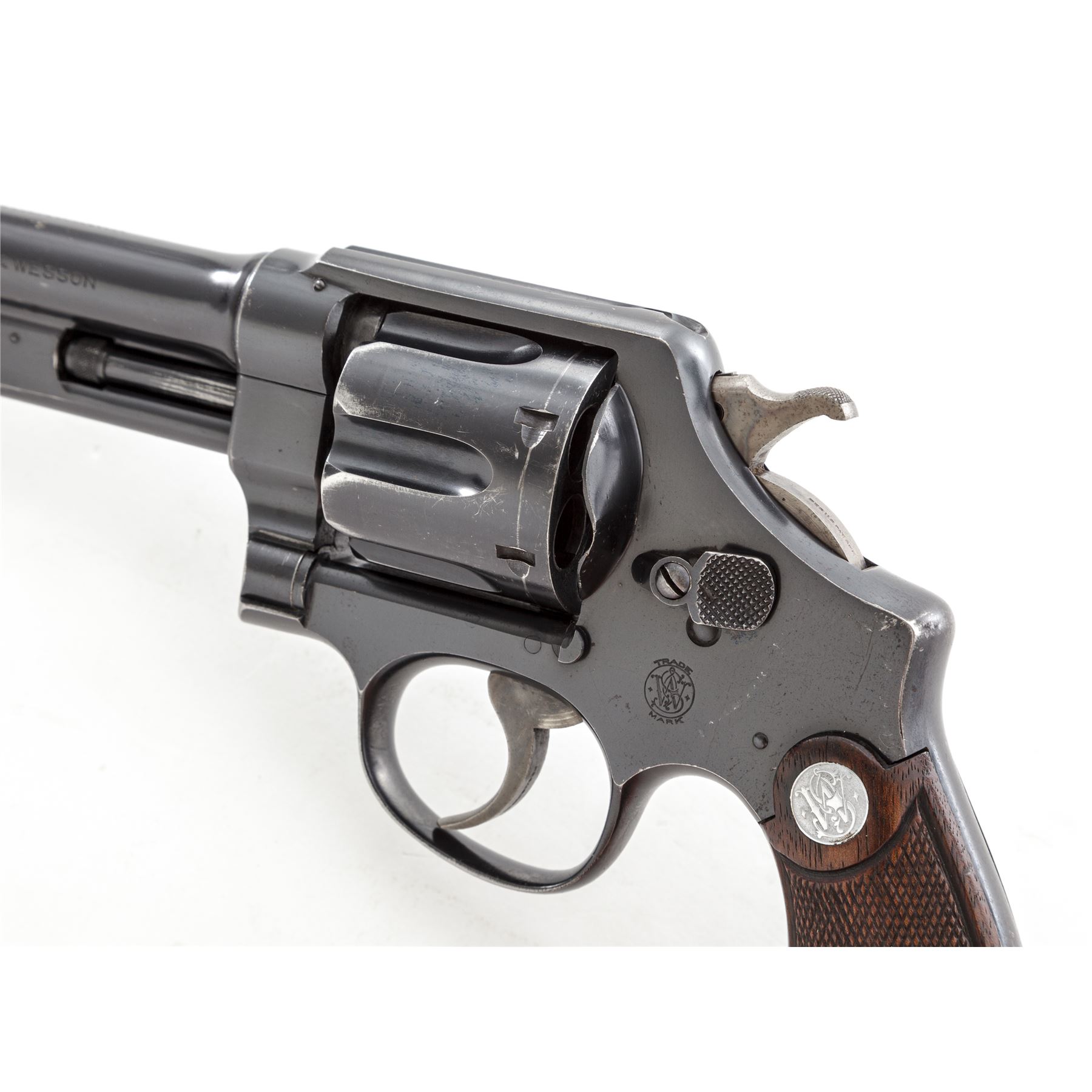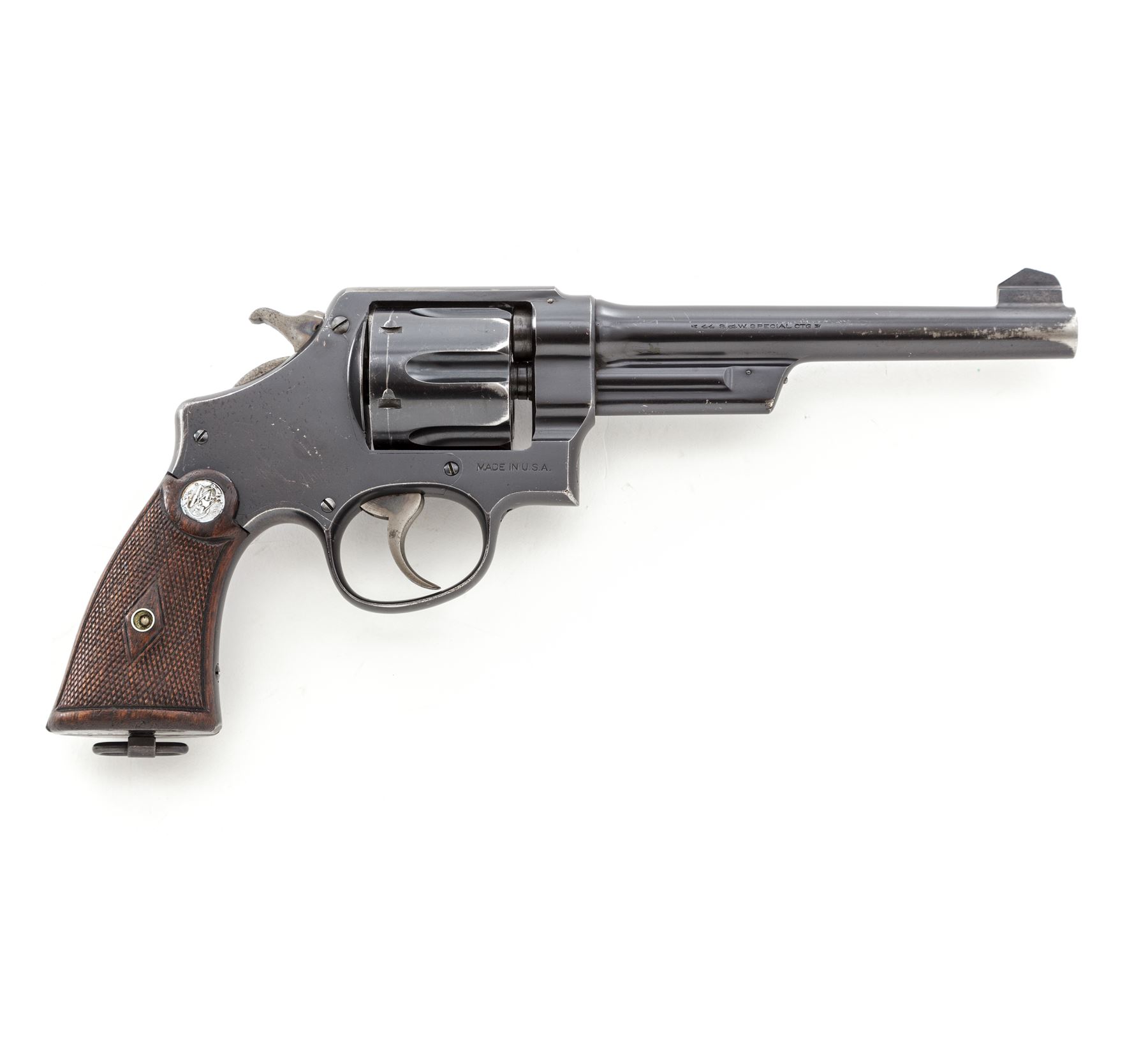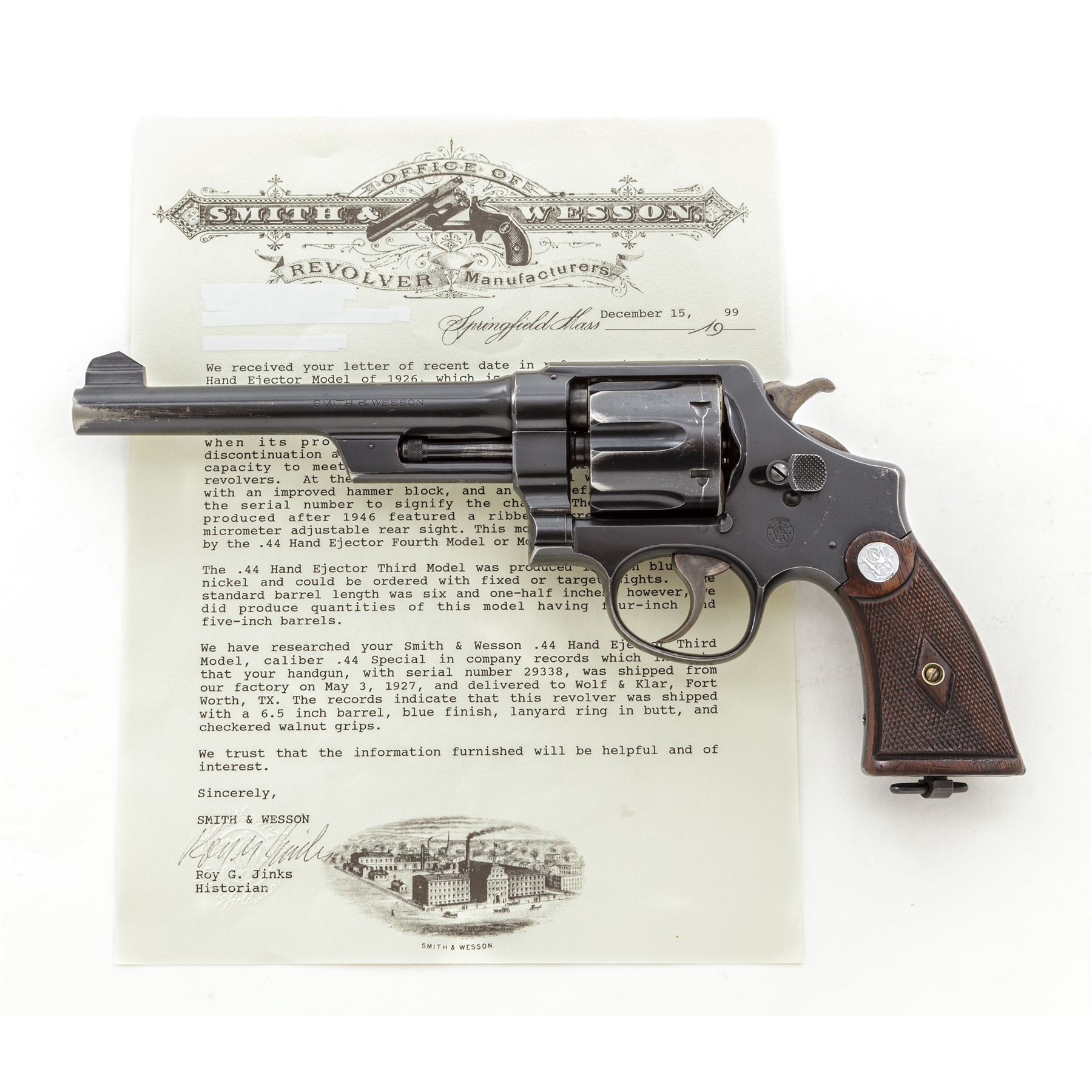 Smith & Wesson Third Model Hand Ejector Wolf & Klar Double Action Revolver, #29338, .44 S&W Spec. cal., 6.5'' barrel, blue finish, non-matching checkered walnut grips with bright S&W medallions, and lanyard loop in butt. Shipped May 3, 1927, to Wolf & Klar, Ft. Worth, TX, with factory letter signed by S&W Historian Roy G. Jinks. Condition is near excellent retaining approx. 92% original thinning blue, with most of the losses to muzzle and forward and high edges of cylinder. Grips show light flattening, somewhat more pronounced to right panel. Good action, bright bore. Est.: $1,500-$2,000. (C&R/PPT)