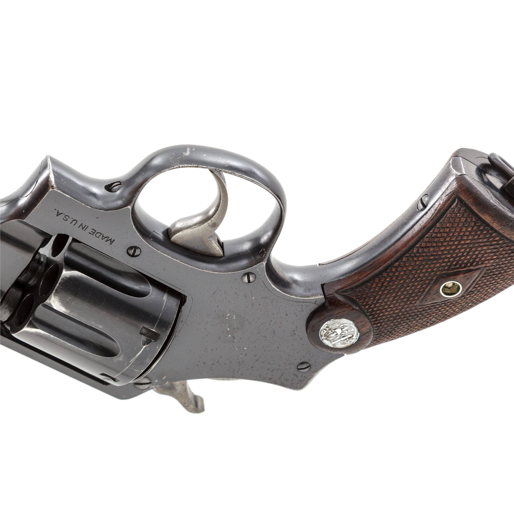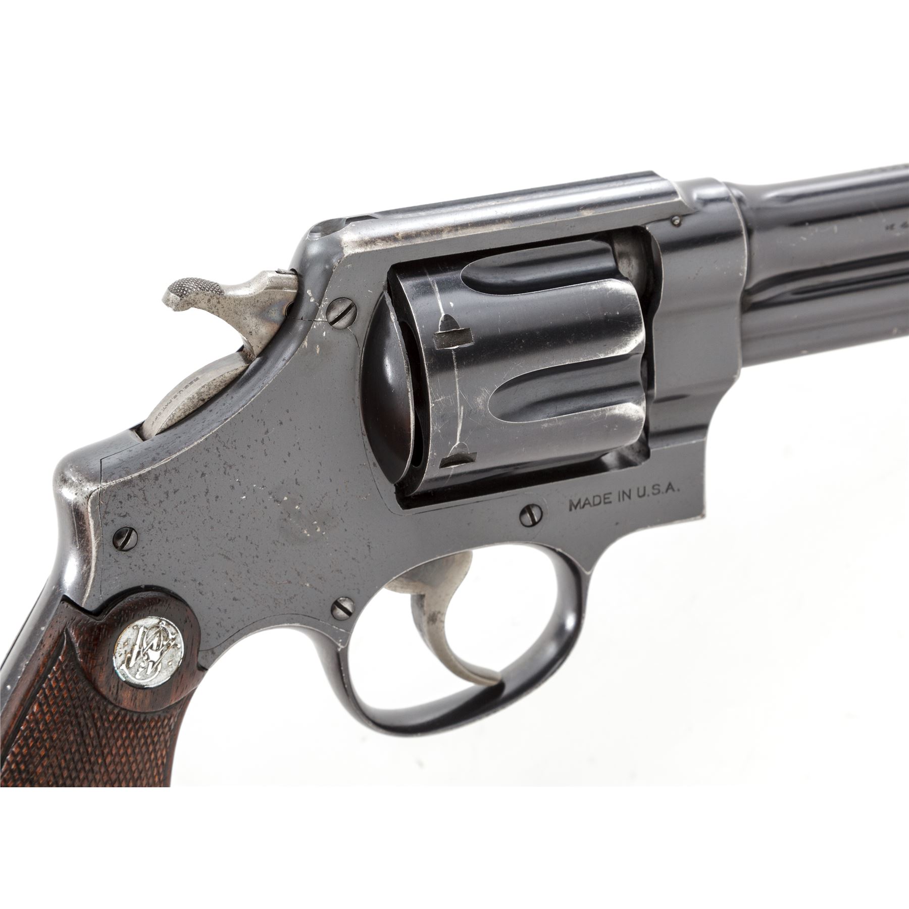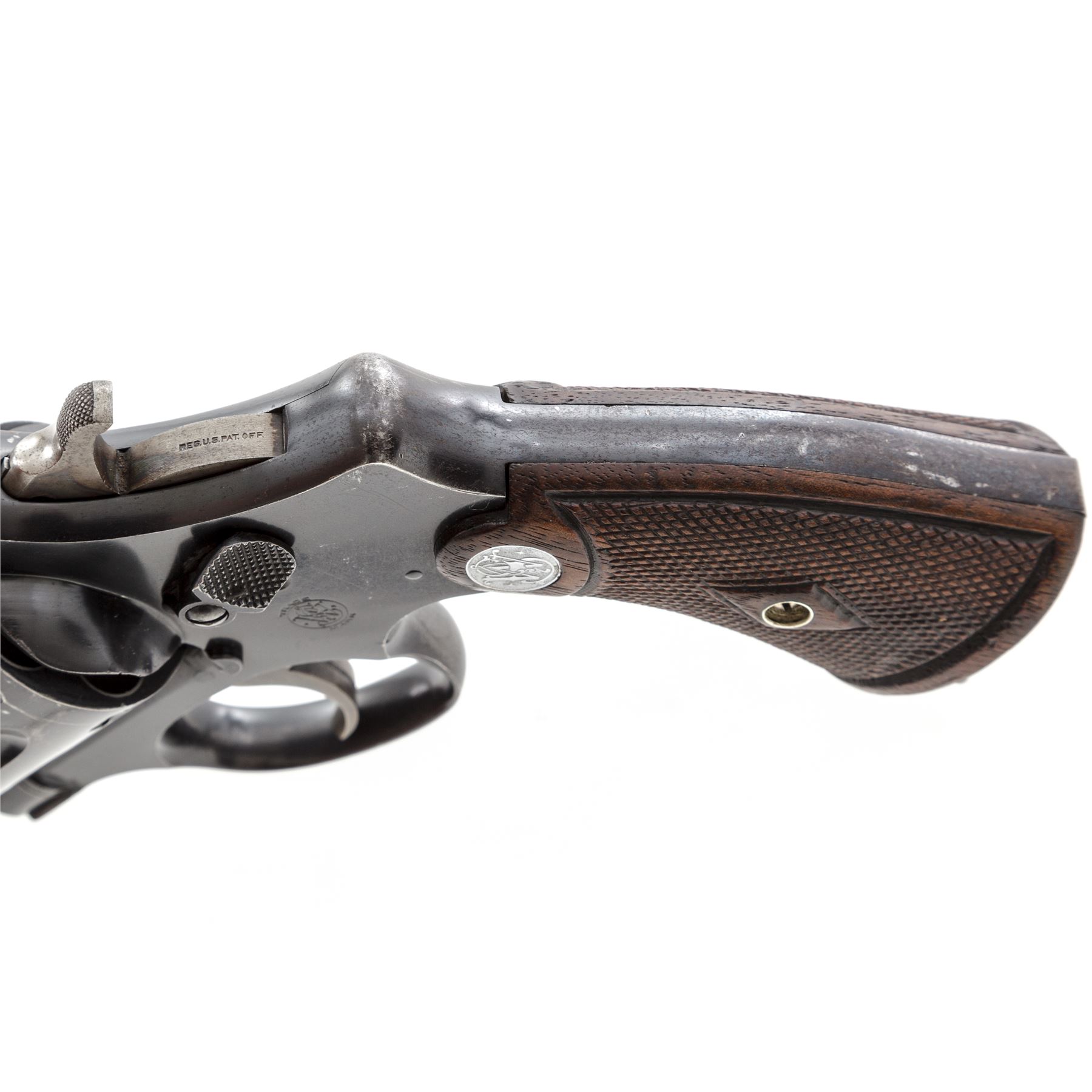Smith & Wesson Third Model Hand Ejector Wolf & Klar Double Action Revolver, #29338, .44 S&W Spec. cal., 6.5'' barrel, blue finish, non-matching checkered walnut grips with bright S&W medallions, and lanyard loop in butt. Shipped May 3, 1927, to Wolf & Klar, Ft. Worth, TX, with factory letter signed by S&W Historian Roy G. Jinks. Condition is near excellent retaining approx. 92% original thinning blue, with most of the losses to muzzle and forward and high edges of cylinder. Grips show light flattening, somewhat more pronounced to right panel. Good action, bright bore. Est.: $1,500-$2,000. (C&R/PPT)
