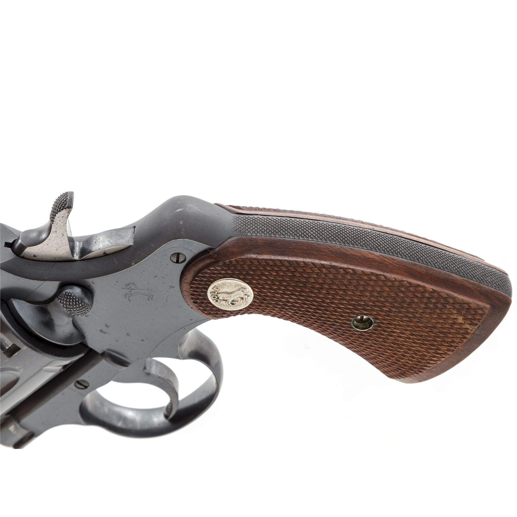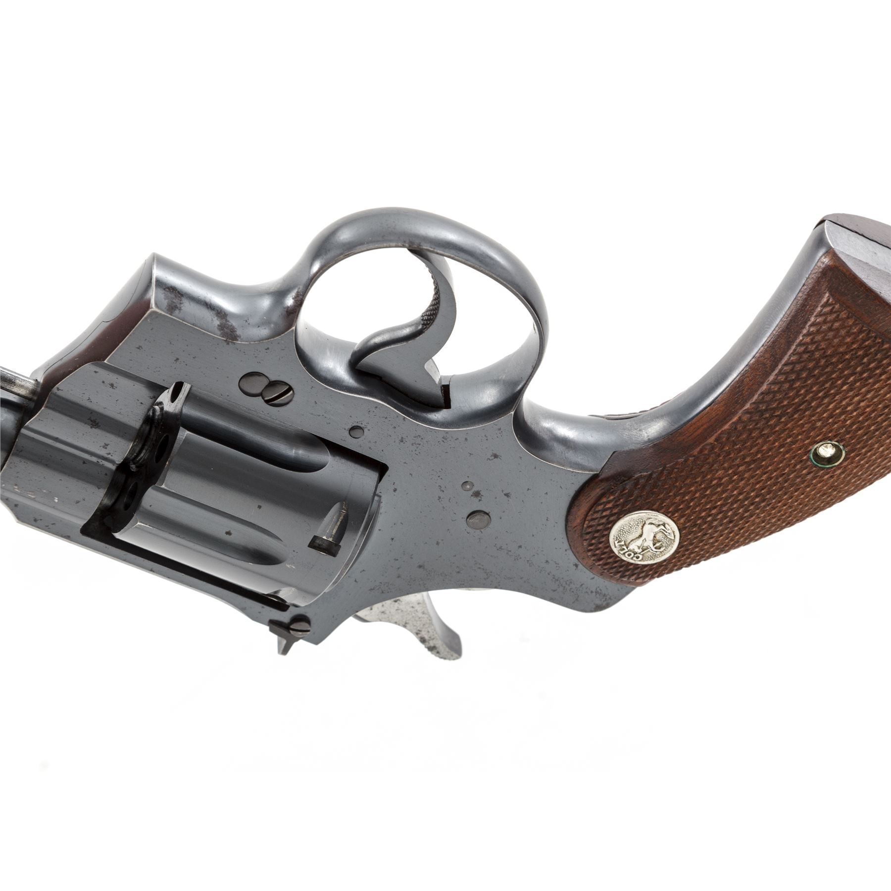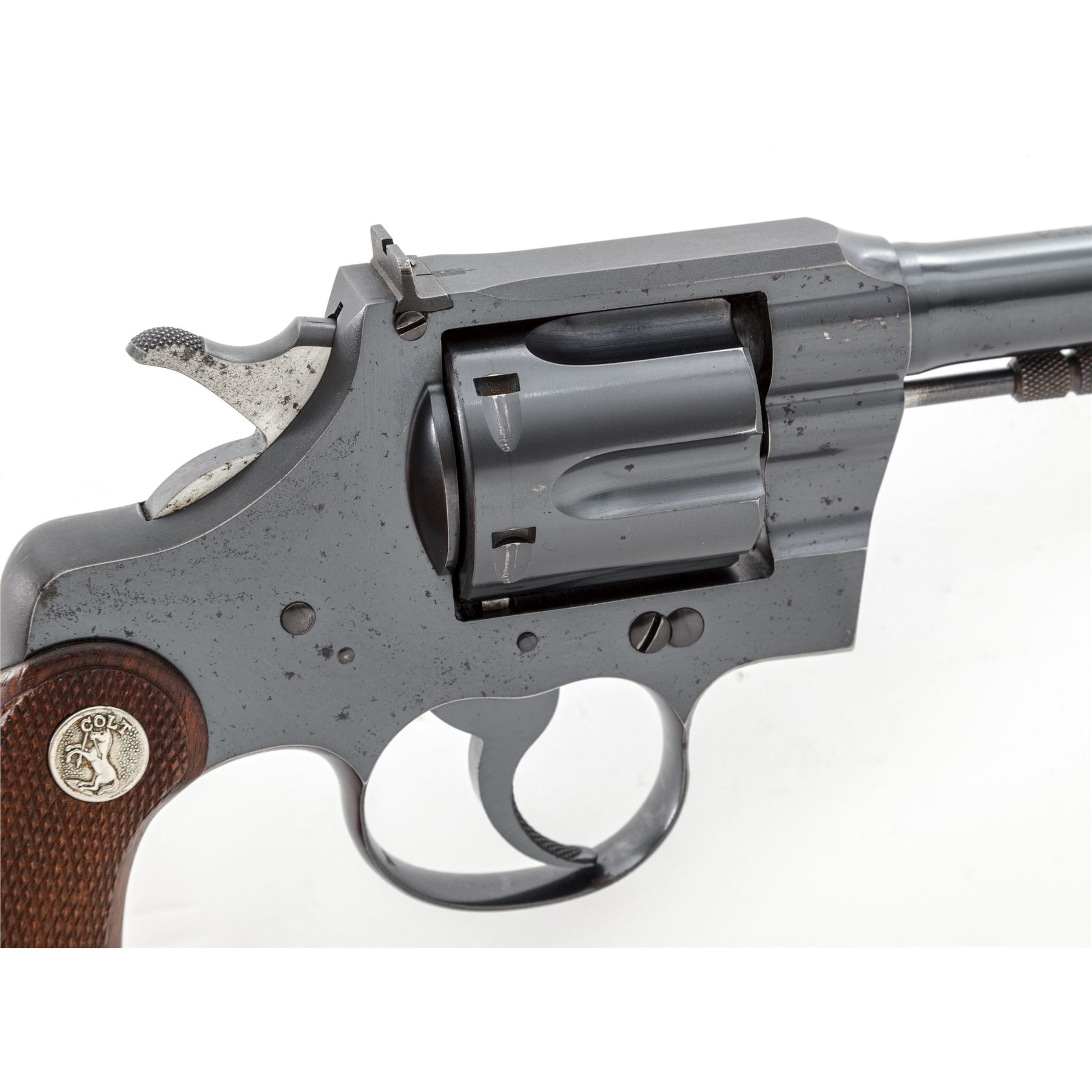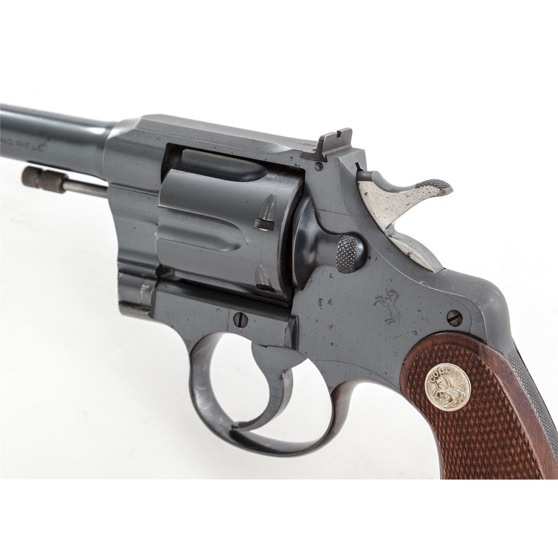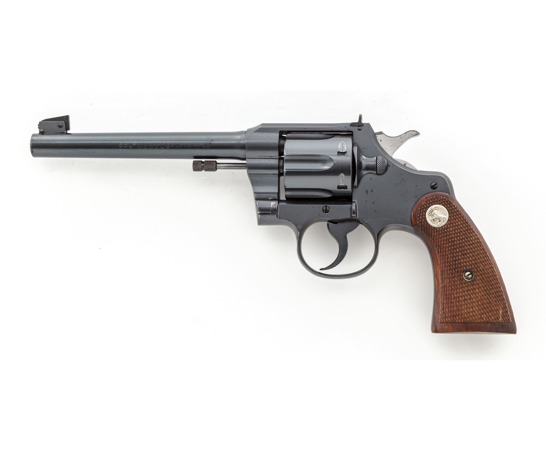 Colt Official Police Target Double Action Revolver, #23706, .22 LR cal., 6'' barrel, blue finish, factory checkered walnut grips with Colt medallions, and factory adjustable target sights. Mfg'd 1941. Condition is near excellent retaining approx. 96% factory blue with light spotting to sideplate and right side receiver flat, as well as carbon spotting to bright sides of hammer. Grips and action are excellent, bore is bright. Est.: $650-$850. (C&R)