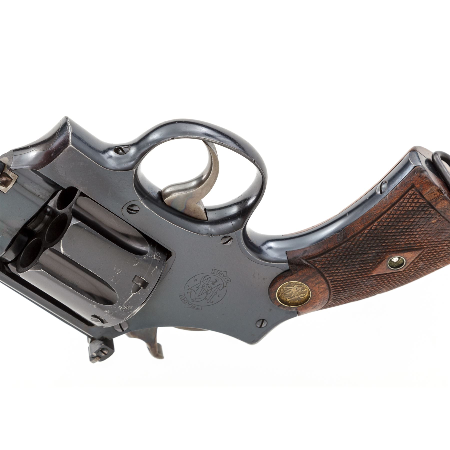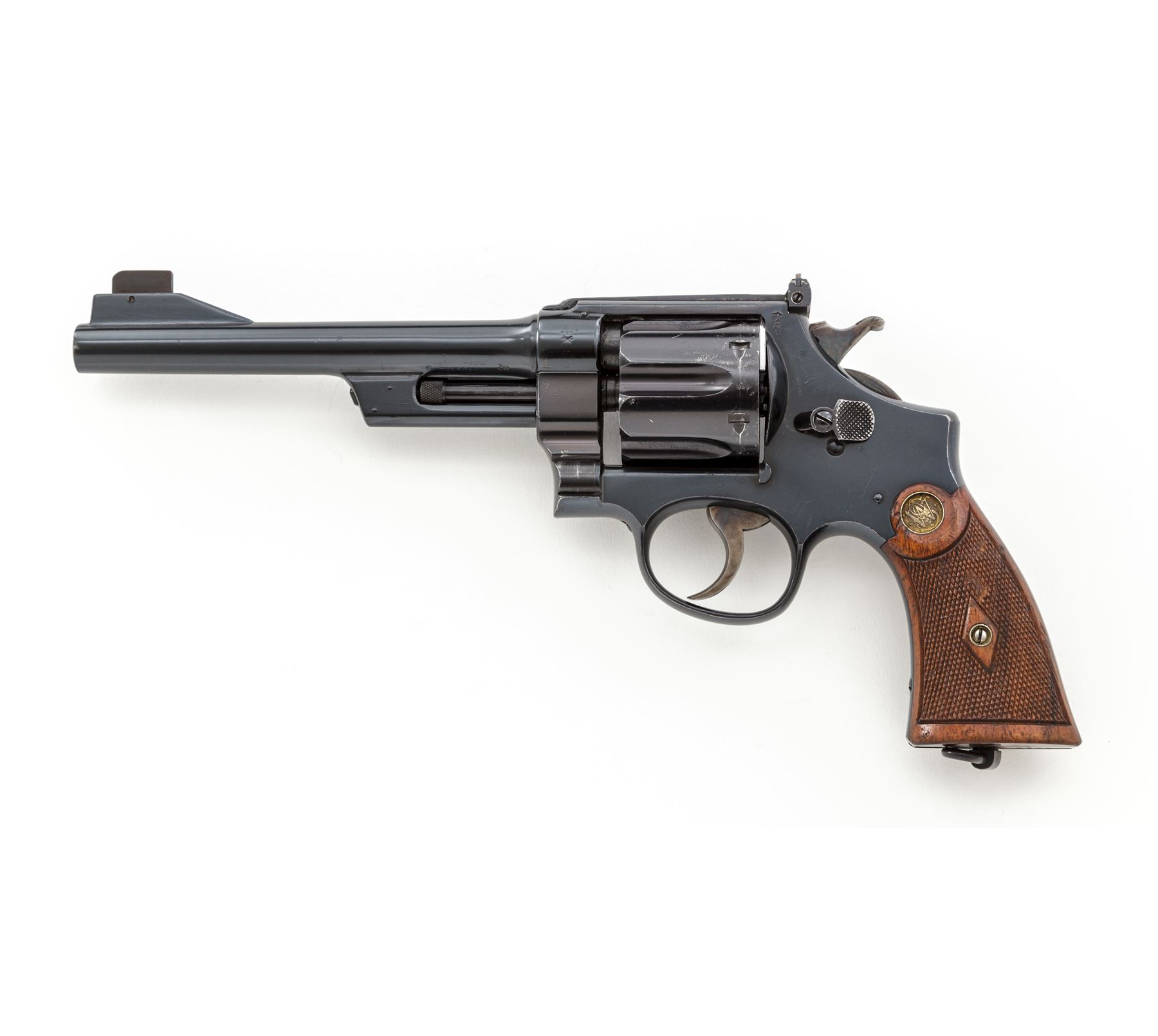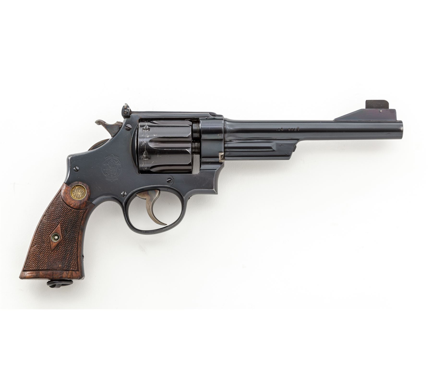 Smith & Wesson First Model Hand Ejector Double Action Revolver, #3983, .45 Colt cal., 6.5'' barrel, blue finish, factory checkered matching numbered walnut grips with S&W medallions, added adjustable rear sight and high ramp Patridge type front sight. Revolver appears to have originally been chambered in .455 MK II, as it is extensively English proofed. Revolver was later modified as a target pistol, re-barreled and chambered in .45 Colt. Rear part of frame appears to be original finish, as does cylinder. Forward portion of frame and barrel assembly look to have been refinished at some point. Grips with minor pressure dings and small losses near butt to right panel. Good crisp action with tight lockup, and bright bore. Est.: $800-$1,200. (C&R)