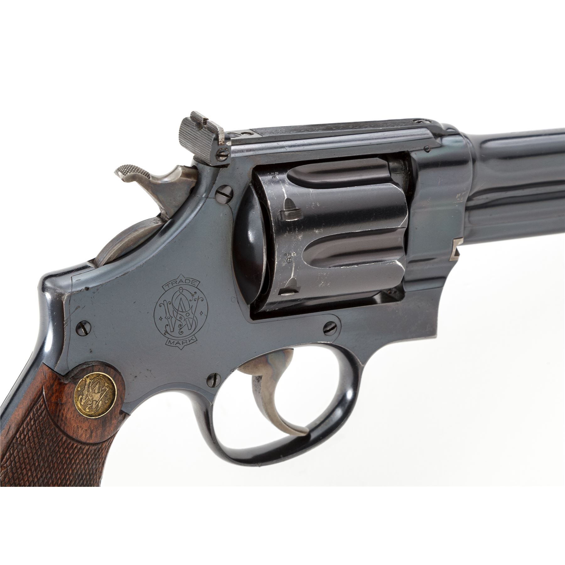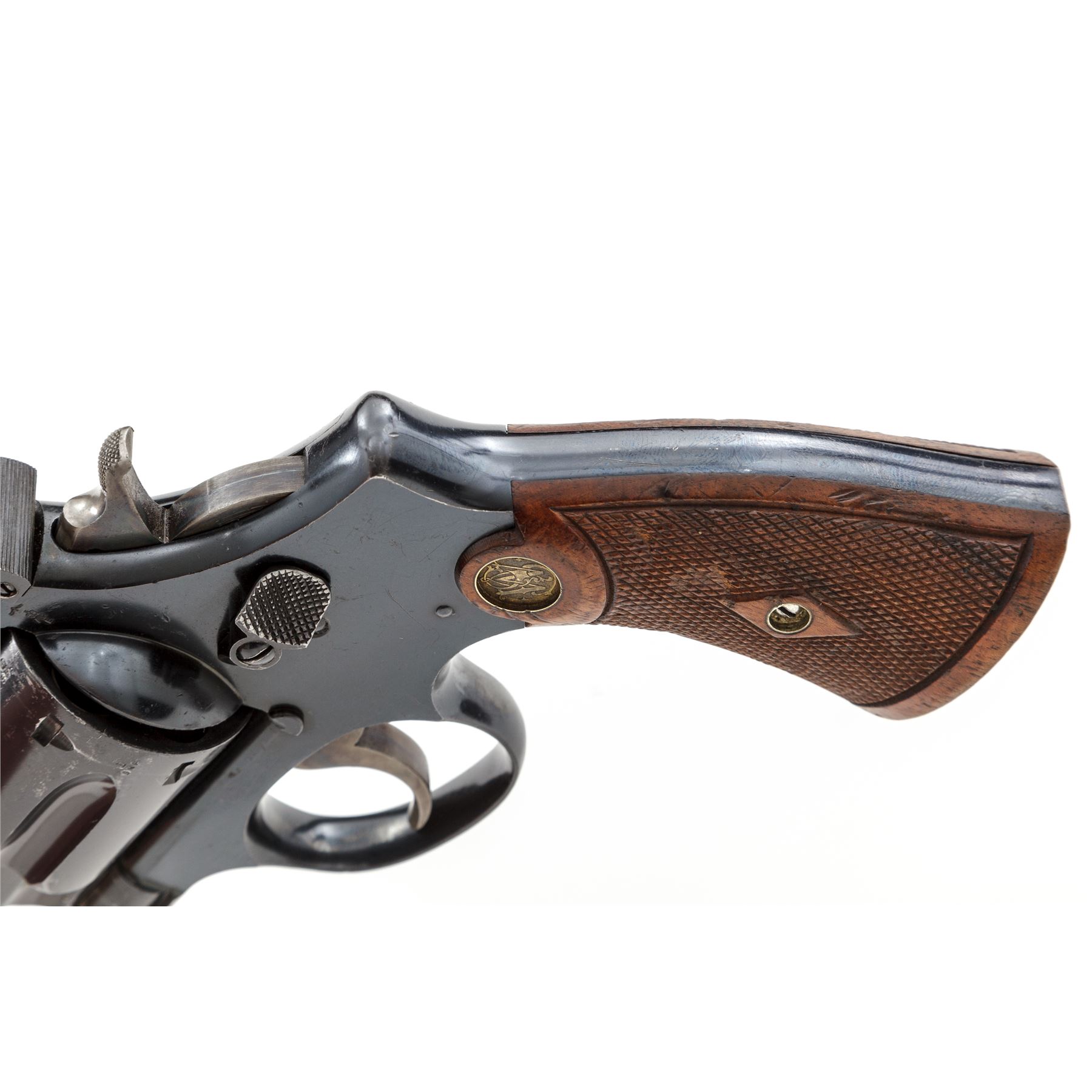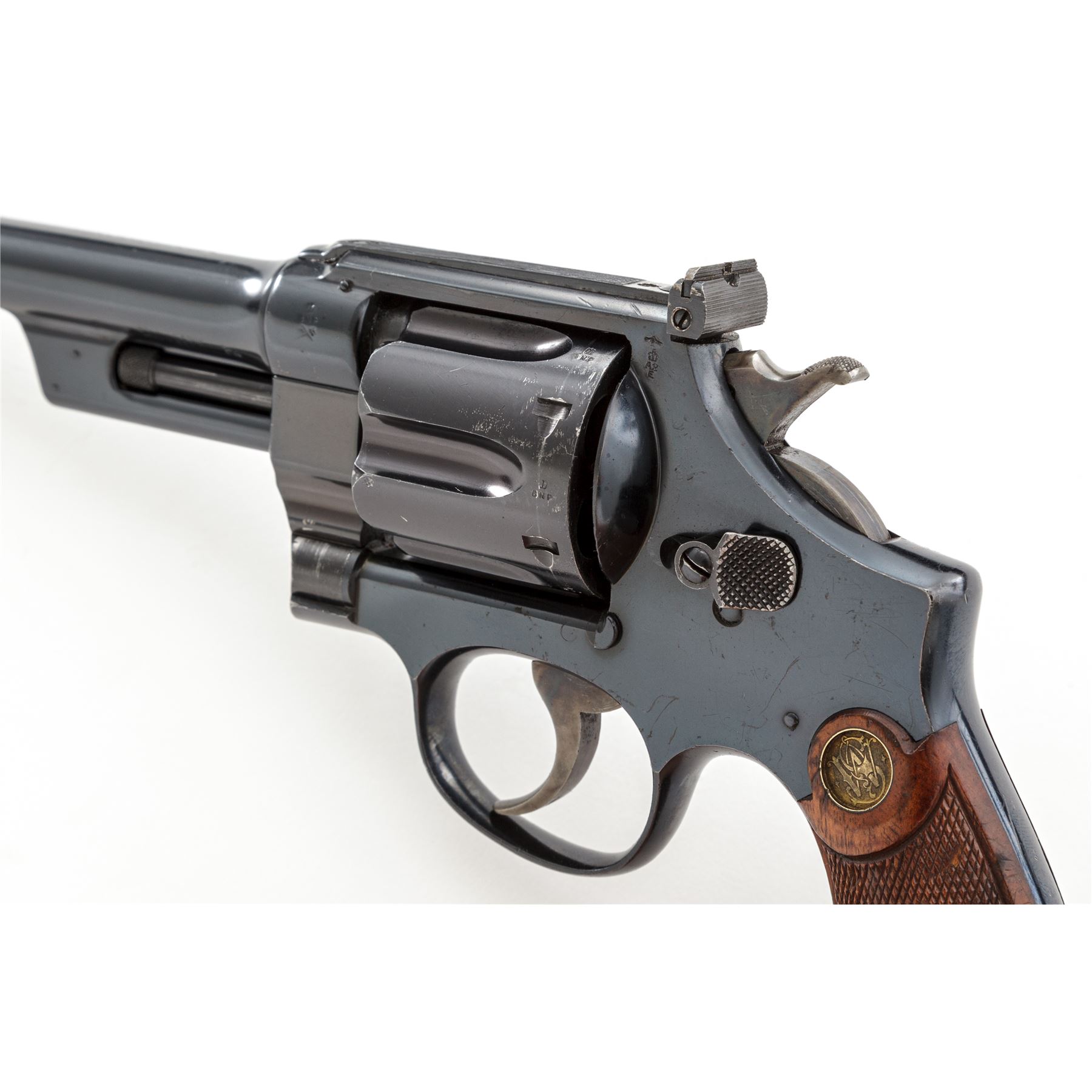 Smith & Wesson First Model Hand Ejector Double Action Revolver, #3983, .45 Colt cal., 6.5'' barrel, blue finish, factory checkered matching numbered walnut grips with S&W medallions, added adjustable rear sight and high ramp Patridge type front sight. Revolver appears to have originally been chambered in .455 MK II, as it is extensively English proofed. Revolver was later modified as a target pistol, re-barreled and chambered in .45 Colt. Rear part of frame appears to be original finish, as does cylinder. Forward portion of frame and barrel assembly look to have been refinished at some point. Grips with minor pressure dings and small losses near butt to right panel. Good crisp action with tight lockup, and bright bore. Est.: $800-$1,200. (C&R)