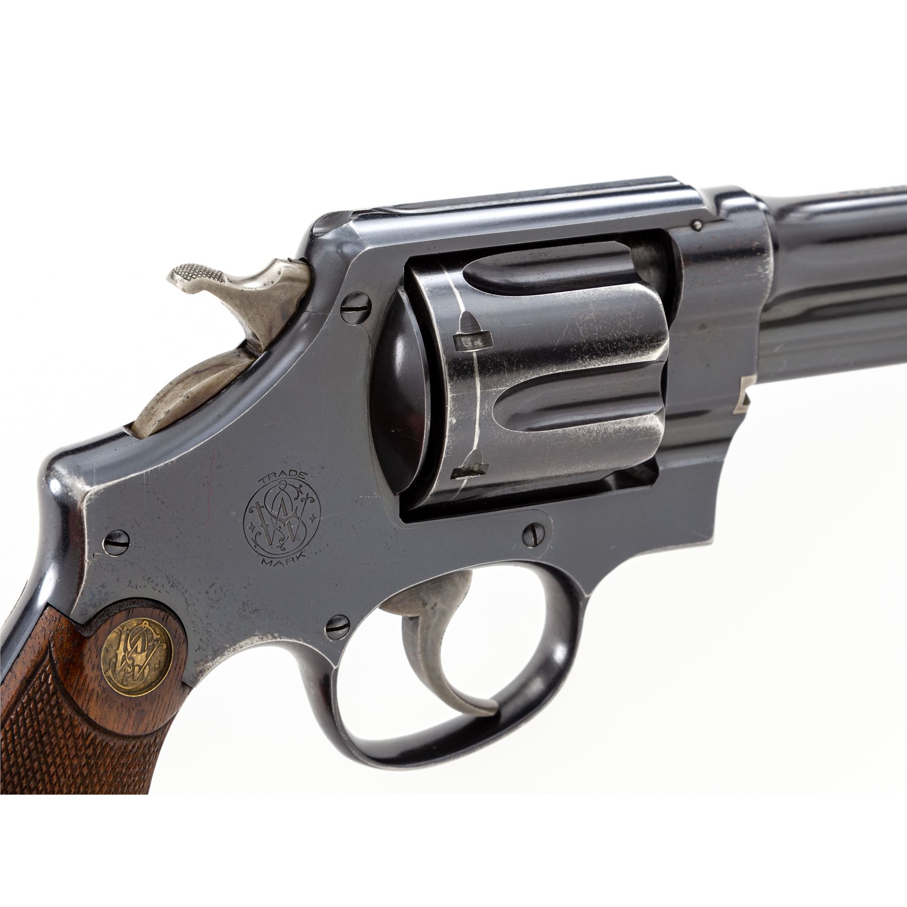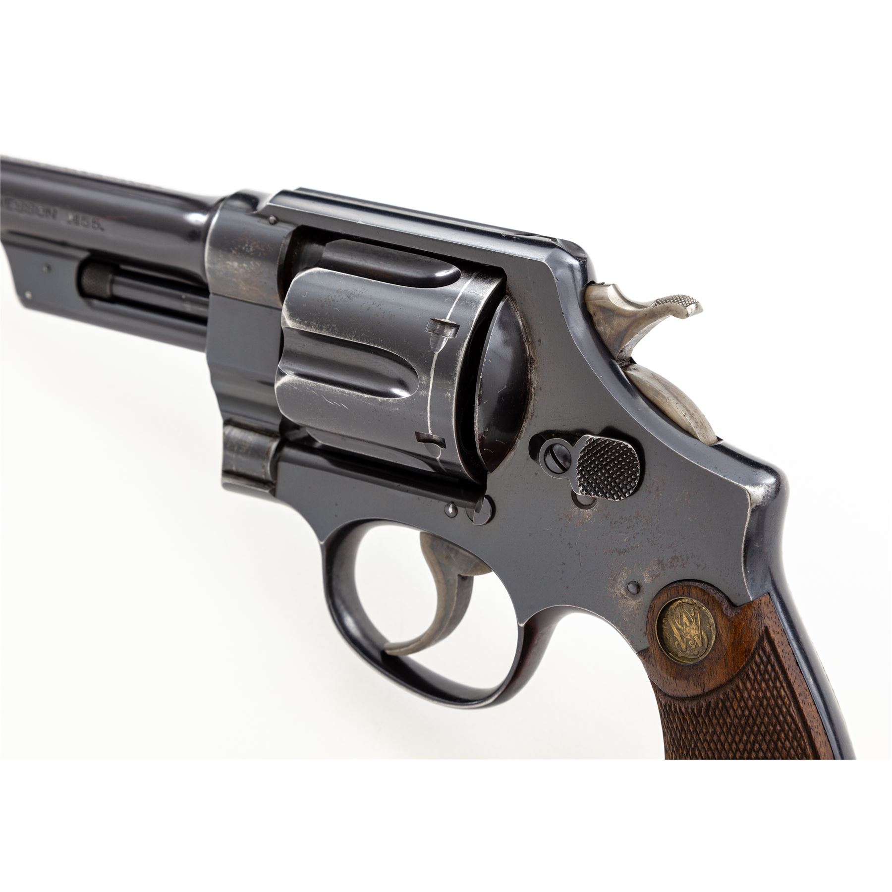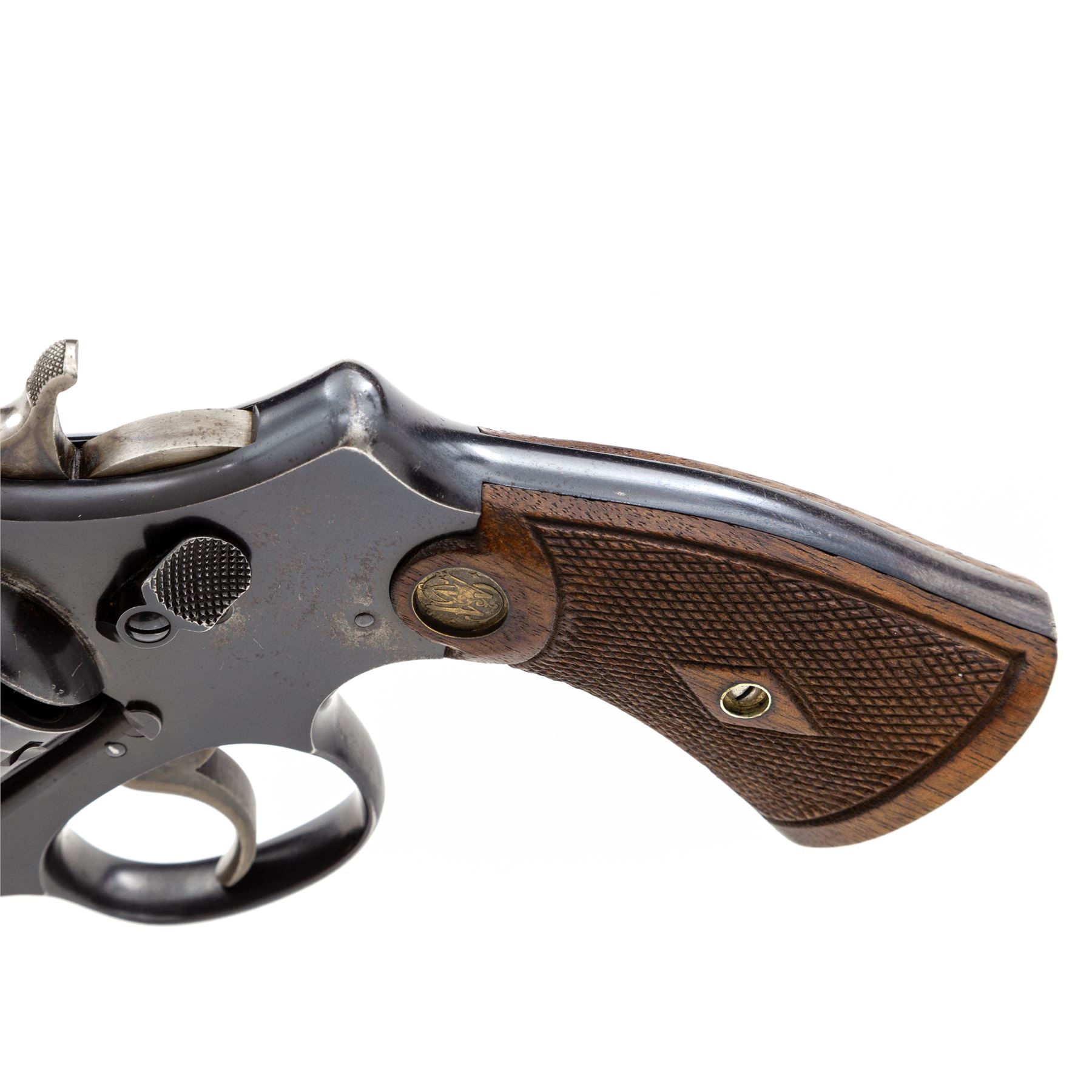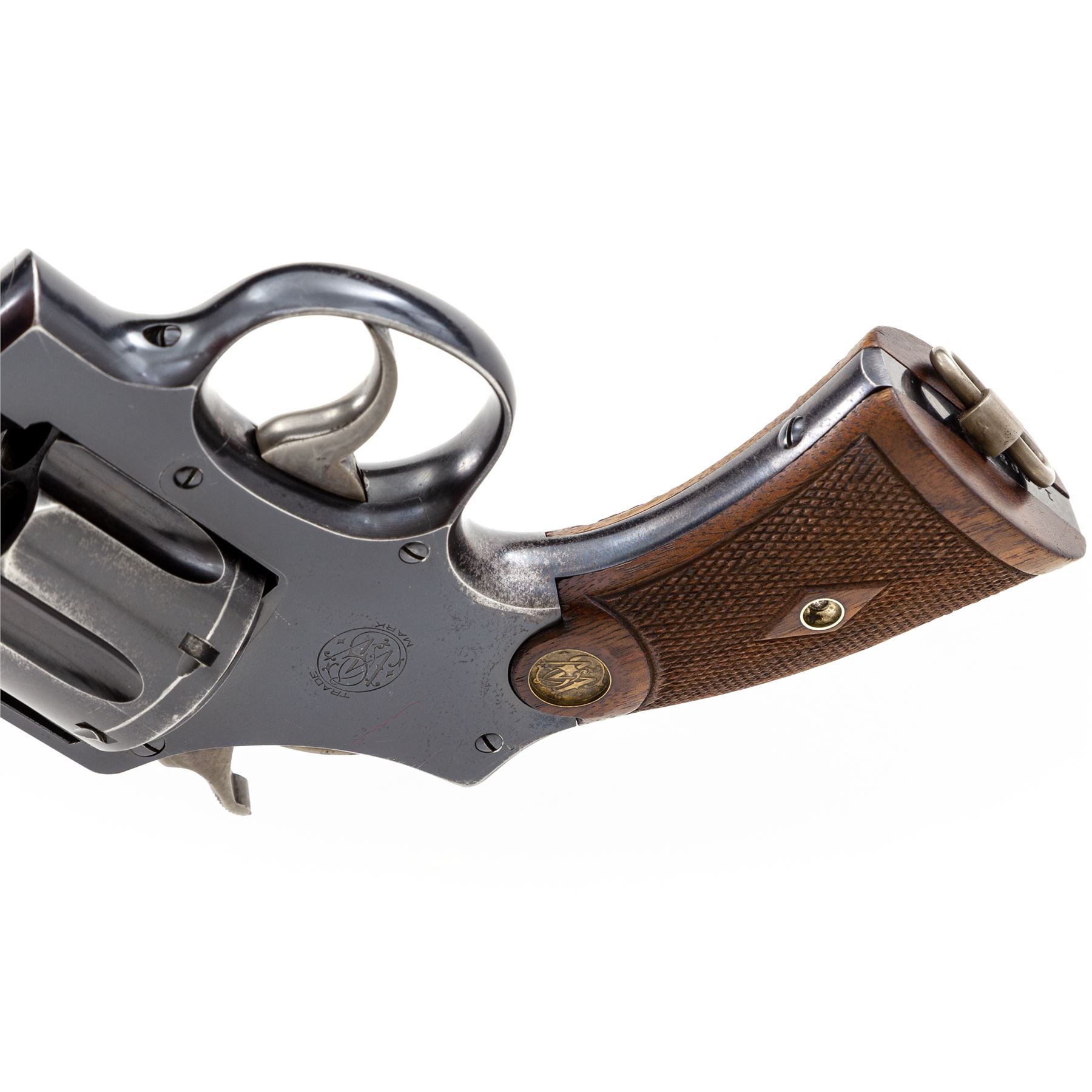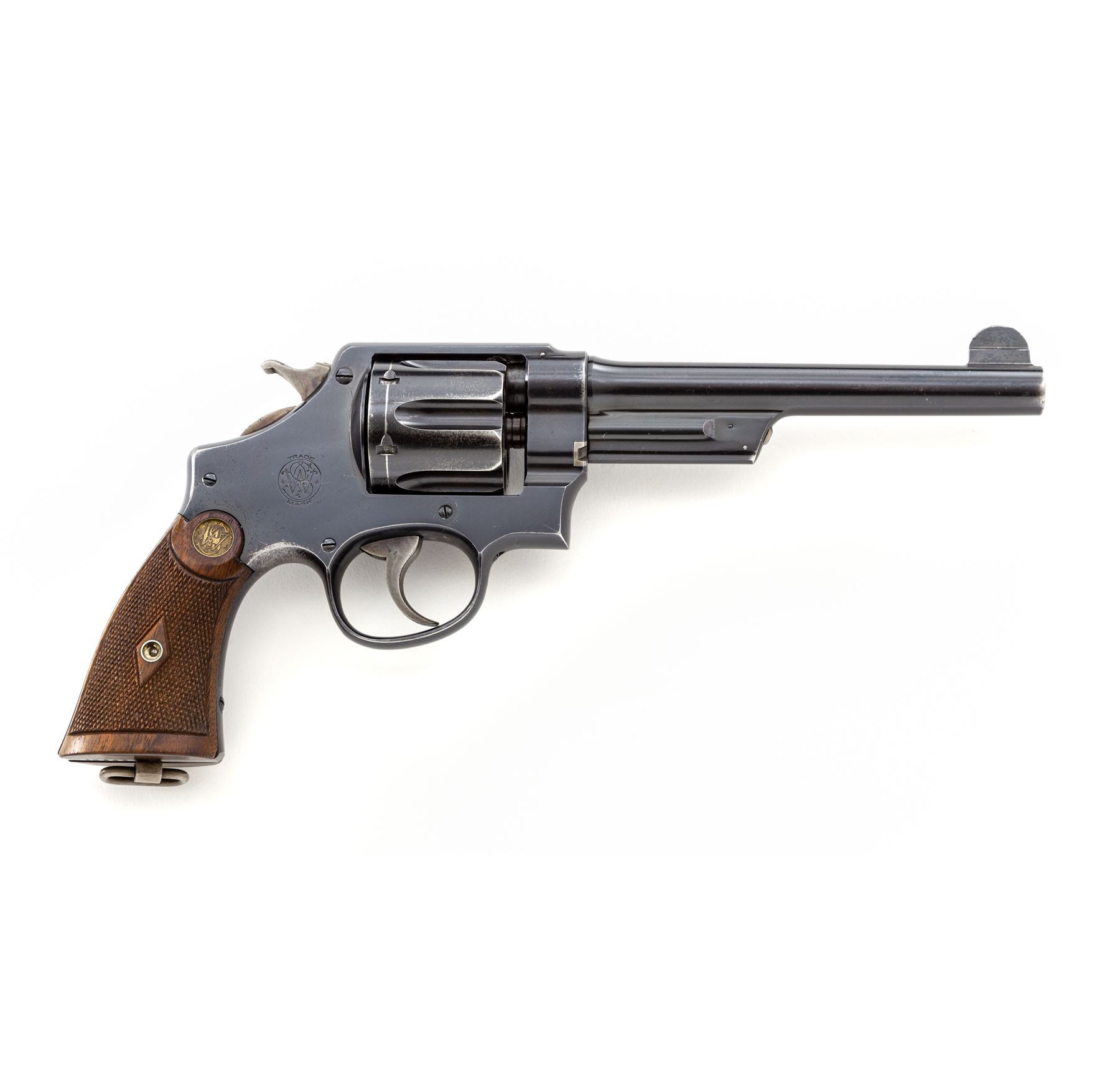 Smith & Wesson First Model Hand Ejector Triplelock Double Action Revolver, #14983, .455 MK II cal., 6.5'' barrel, blue finish, factory diamond checkered unnumbered walnut grips with S&W medallions, and standard sights. Shipped Dec. 29, 1917, to Shapleigh Hardware Co., St. Louis, MO, with factory letter signed by S&W Historian Roy G. Jinks. Factory letter also states that this revolver was originally mfg'd for the British government and then not shipped. They were held in inventory until 1917 and then sold to distributors in both the U.S. and Canada. Condition is fine retaining approx. 92% original factory blue. Normal index mark to cylinder. Cylinder axle with original old dry grease, needs cleaning. Interesting in this caliber to be devoid of all English proofmarks. Grips with mild flattening. Good action, bright bore. Est.: $1,000-$1,500. (C&R/PPT)