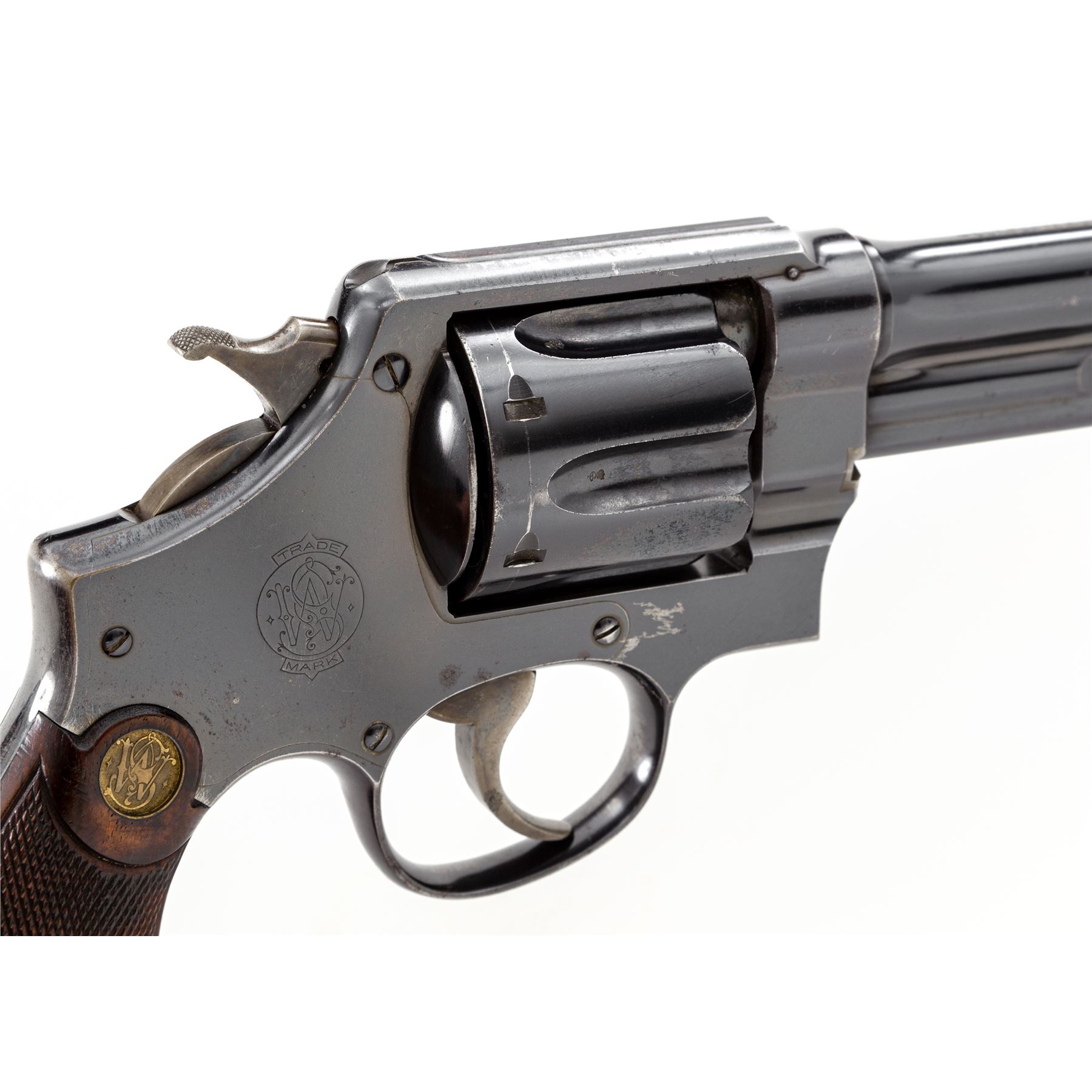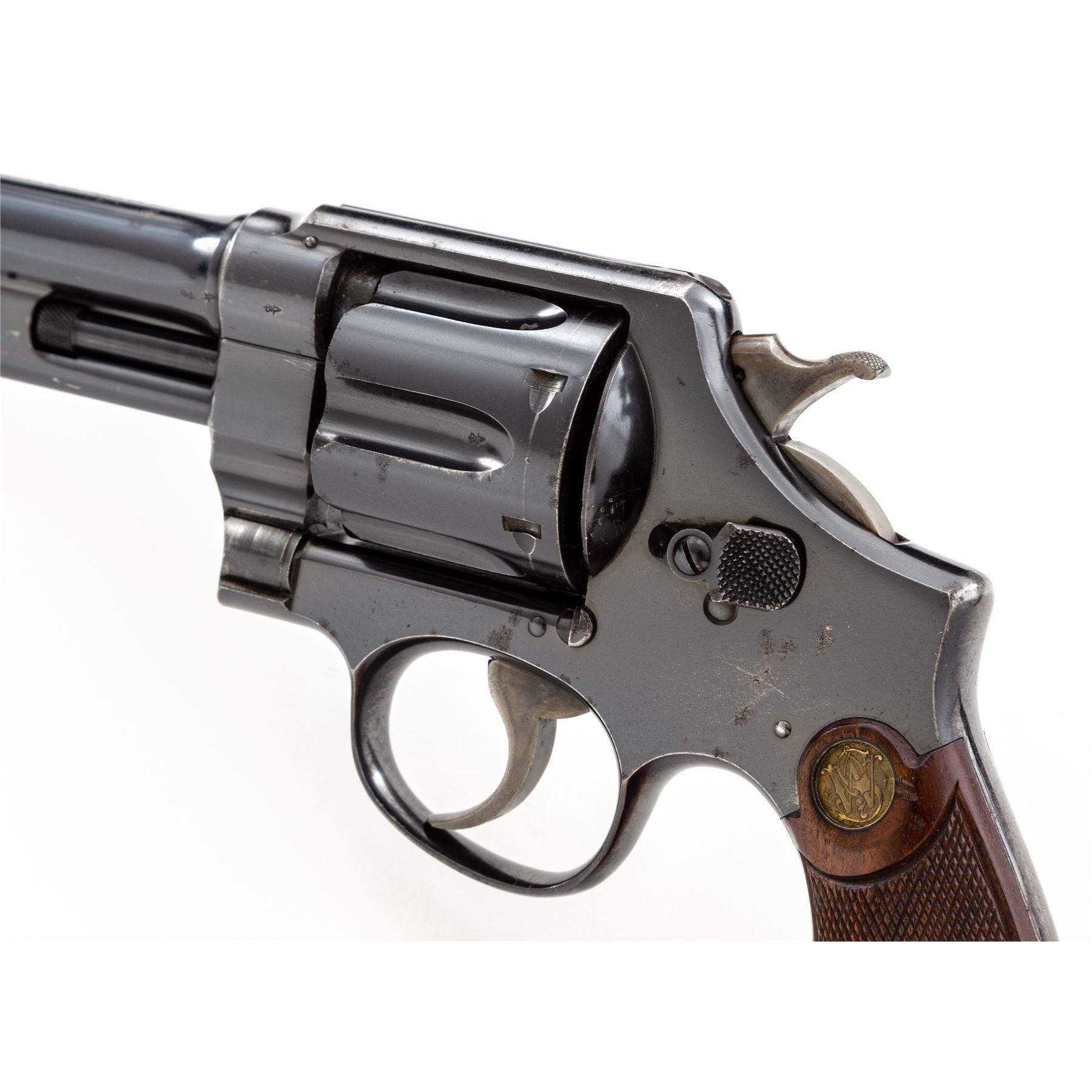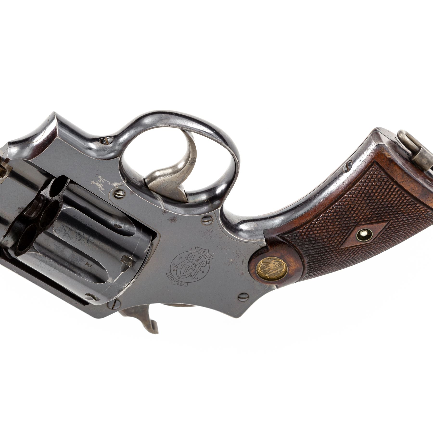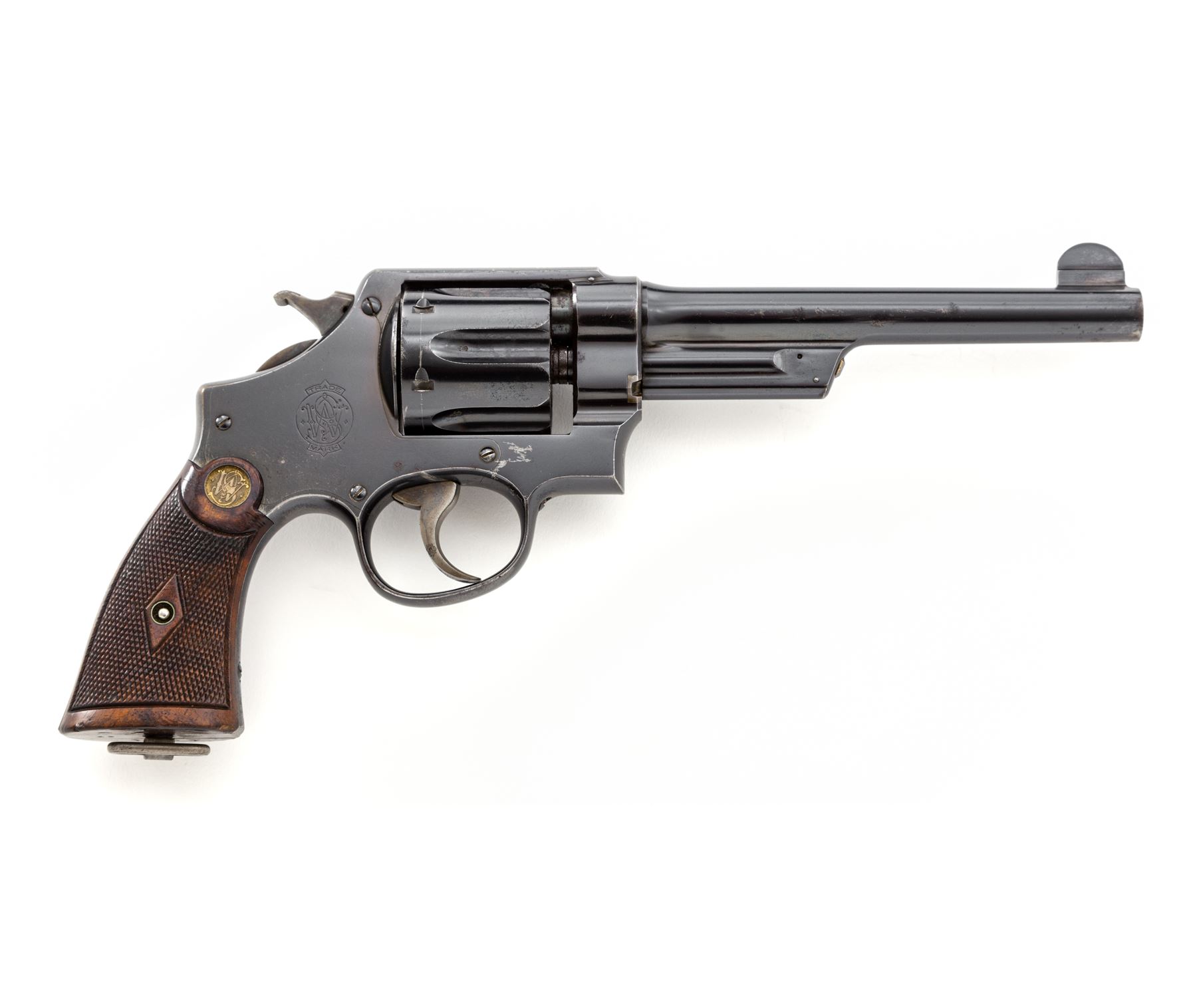 Smith & Wesson First Model Hand Ejector Triplelock Double Action Revolver, #49, .455 MK II cal., 6.5'' barrel, blue finish, factory checkered walnut grips with S&W medallions, standard sights, with lanyard loop in butt. Shipped Oct. 1, 1914, to Wilkinson Sword Co., London, England, with factory letter signed by S&W Historian Roy G. Jinks. Condition is fine to near excellent retaining approx. 92% original blue, with thinning at muzzle, backstrap, topstrap, and high edges. Small areas of light pitting to forward third of barrel. Small scuffs to right side just forward the sideplate. Correct period grips with crisp checking, no factory numbers to inside of panels; butt of left grip panel with British rack number 4684. ''(Crown)/V'' proofmarks to barrel and frame, with alternating ''(crown)/V'' and ''(crown)/CP'' proofmarks in cylinder flutes. Thin index mark to cylinder. Crisp action, fine bore. Est.: $3,500-$5,000. (C&R/PPT)