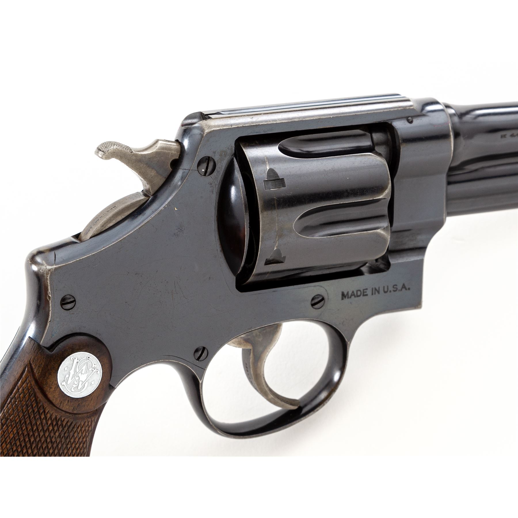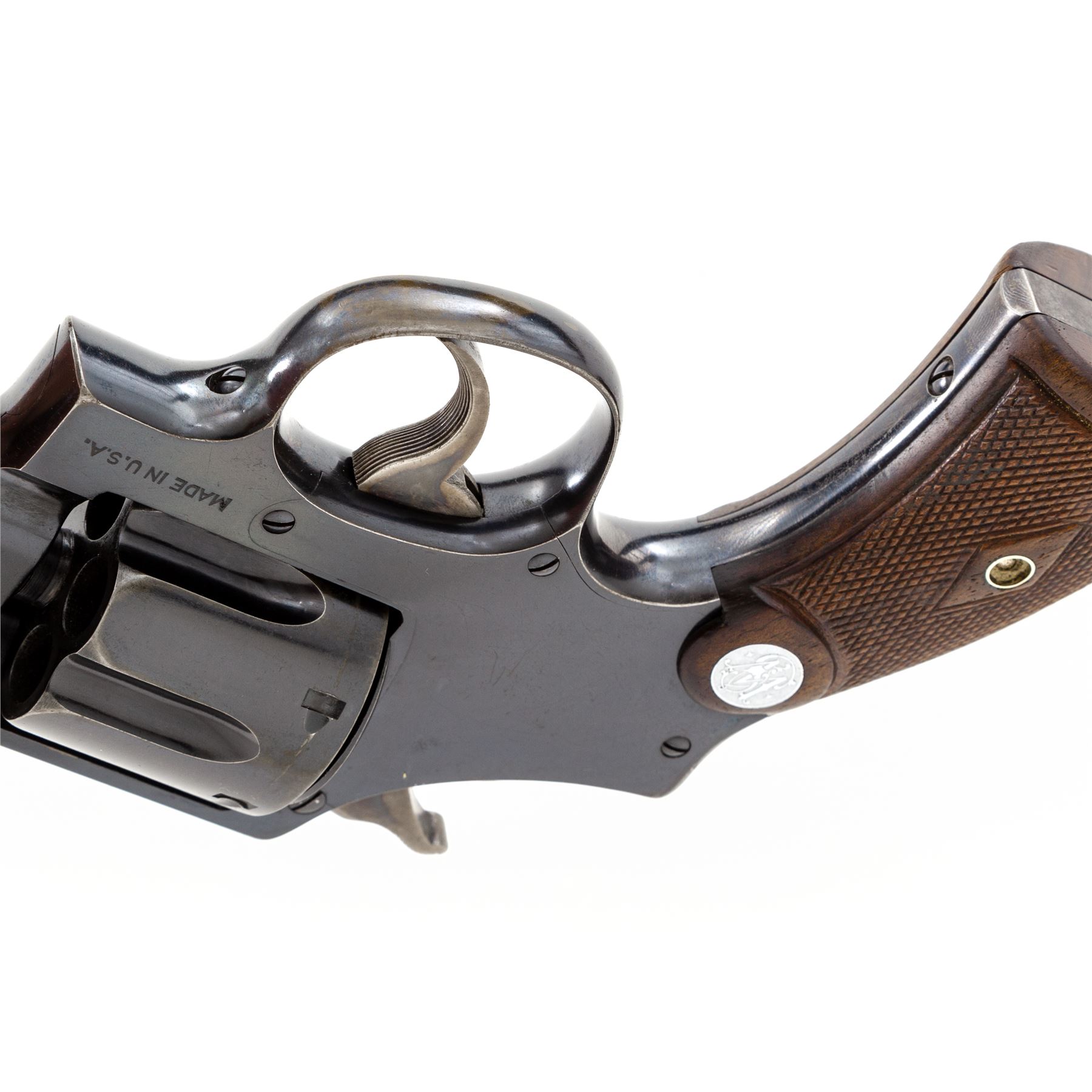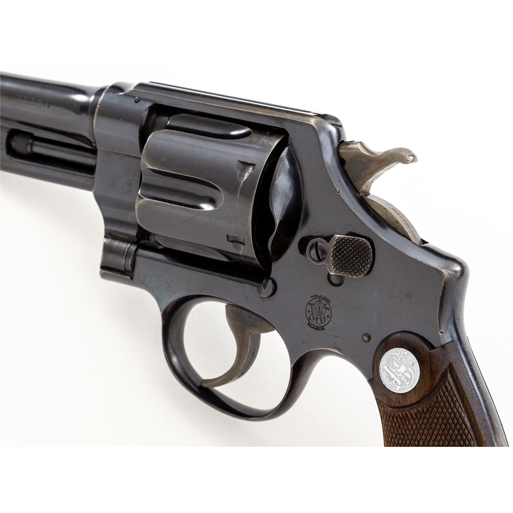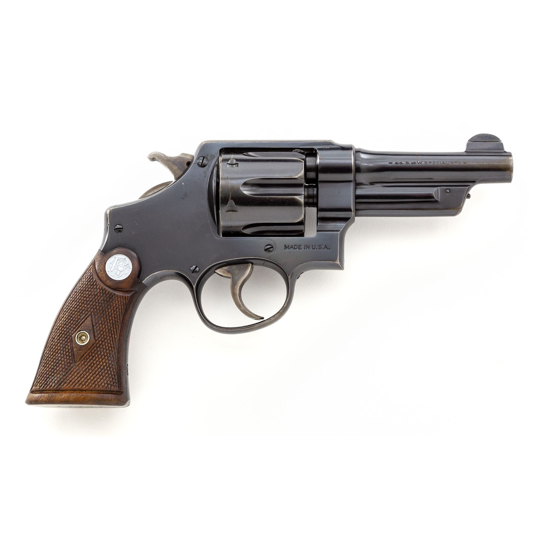 Smith & Wesson Third Model Hand Ejector (Model of 1926) Double Action Revolver, #34820, .44 S&W Spec. cal., 4'' barrel, blue finish, factory checkered matching numbered walnut grips with bright medallions, and standard sights. Shipped April 22, 1930, to Wolf & Klar, Ft. Worth, TX, with factory letter signed by S&W Historian Roy G. Jinks. Condition is near excellent retaining approx. 92% original factory blue, with thinning and toning to both sides of barrel, finish losses to back and topstrap, as well as forward edge of cylinder, with light index mark. Grips remain mostly crisp with small area of light impressions. Crisp action, bright bore. Est.: $2,500-$4,000. (C&R/PPT)