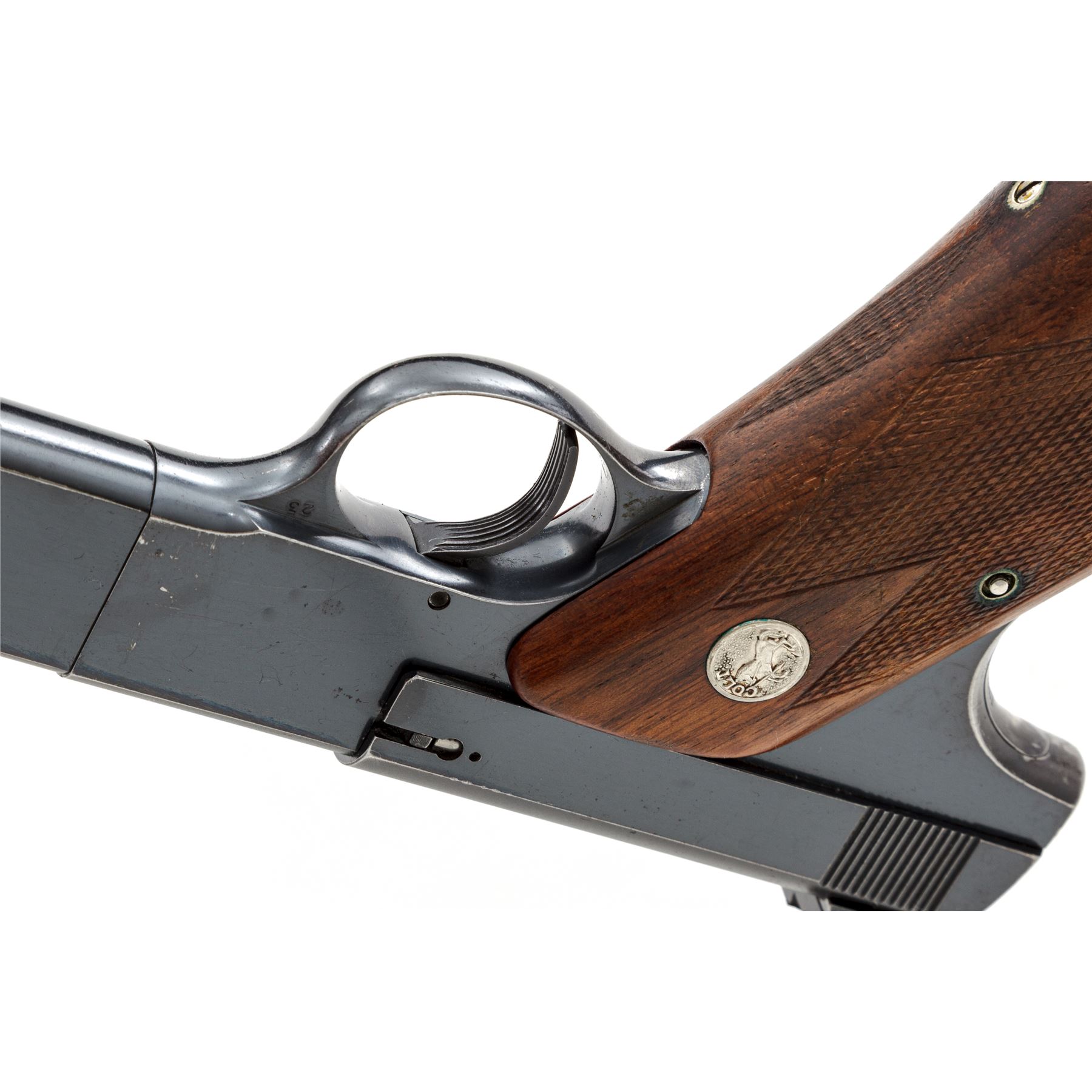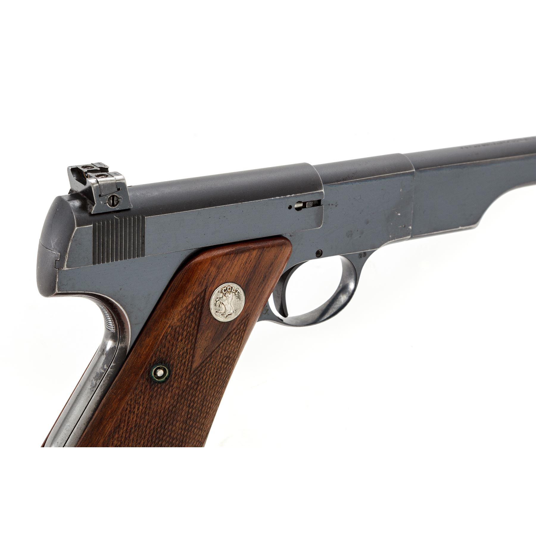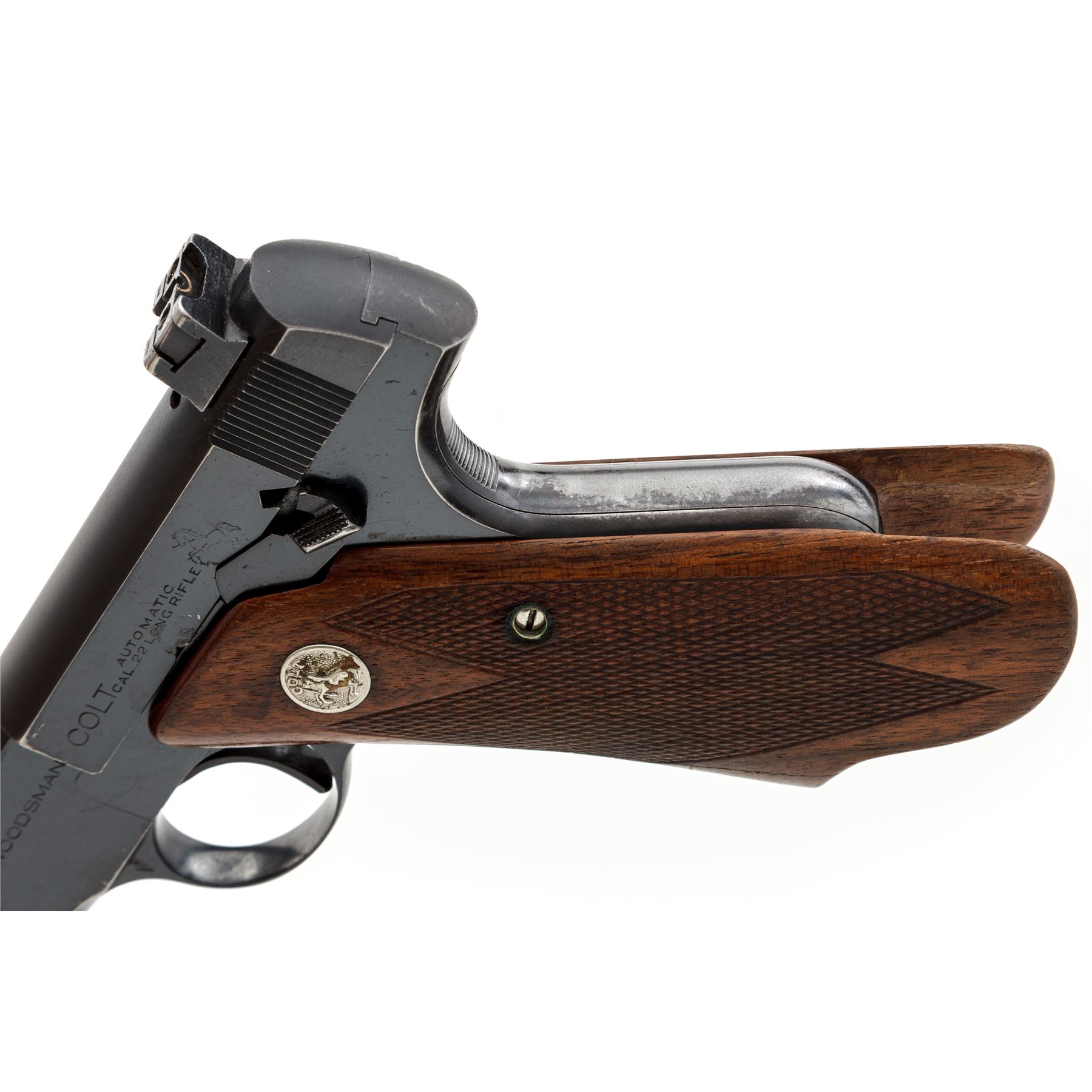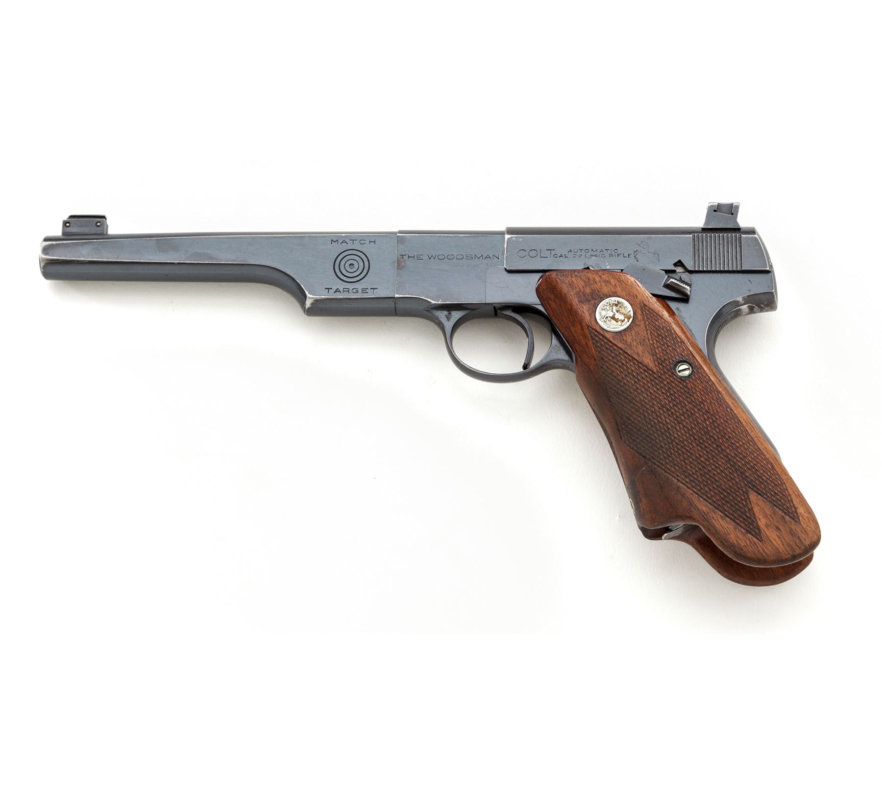 1st Series Colt Match Target Woodsman Semi-Automatic Pistol, #MT7973, .22 LR cal., 6-5/8'' slab-sided barrel, blue finish, checkered walnut ''elephant ear'' grips with silver Colt medallions, blade front sight with white bead, adjustable ''King Pat.'' rear sight, and one solid blue Colt magazine that is marked on the base ''COLT WOODSMAN/CAL. 22 L.R./MATCH TARGET MOD.'' Pistol with standard markings which include the Match Target ''Bullseye'' logo on left side of barrel; left front of triggerguard with ''T/VP'', right side ''23''. Mfg'd in 1940. Condition overall is very good with approx. 87%-90% original blue finish. Much of the finish loss occurs on the backstrap, as well as thinning along some of the highpoints. Metal with general light scratches and other signs of moderate range use. Left side of slide and frame with small and shallow impressions. Factory lettering is clear. Grip condition is consistent with that of the rest of the pistol; grip checkering is nice for its age with only a few mild flat spots; left side with an approx. 1'' long hairline crack that runs vertically in front of the checkering and is not on the extended ''elephant ear'' portion. Magazine retains approx. 85% original blue finish, floorplate lettering is clear. Action is smooth; bright and clean bore rates excellent. Est.: $1,200-$1,800. (C&R)