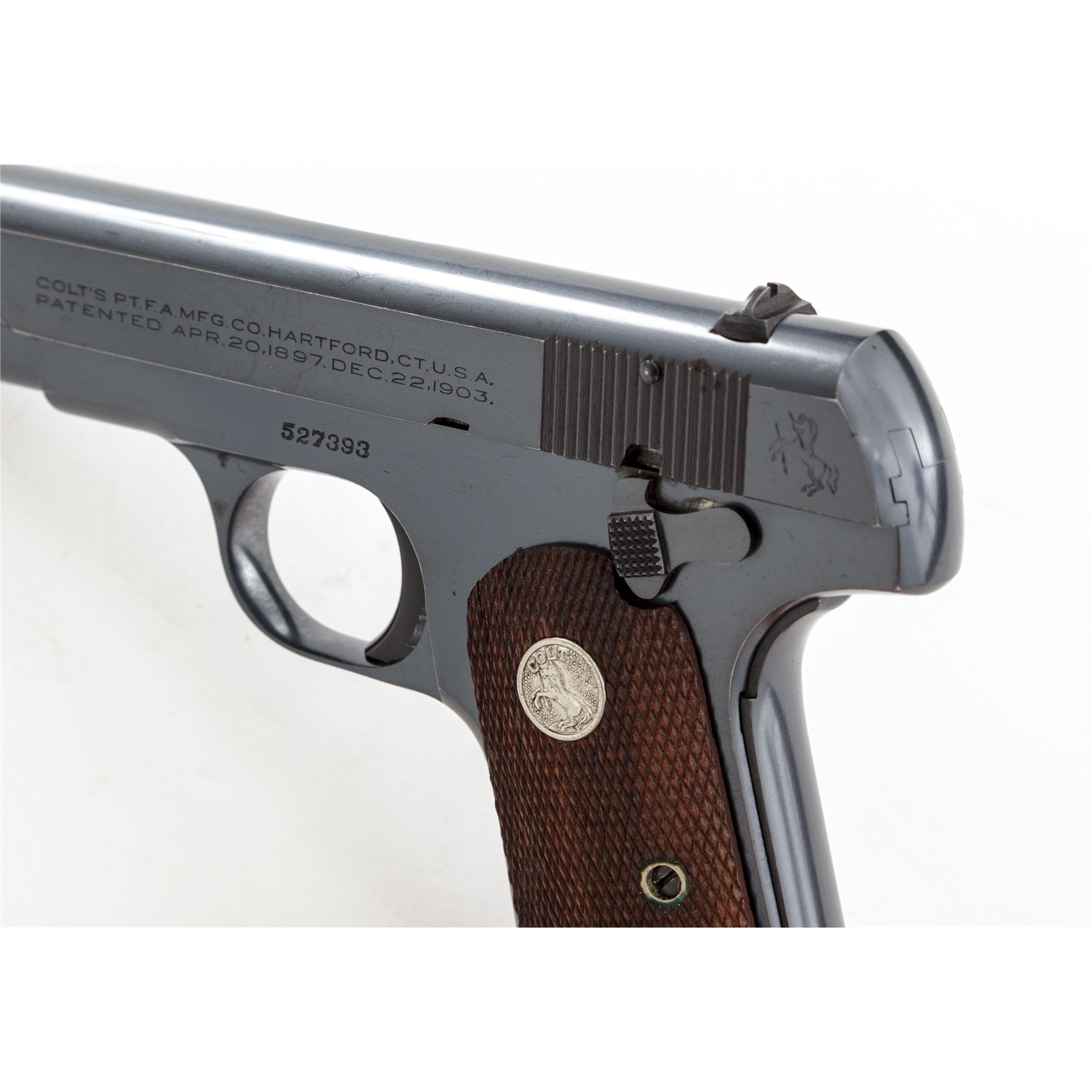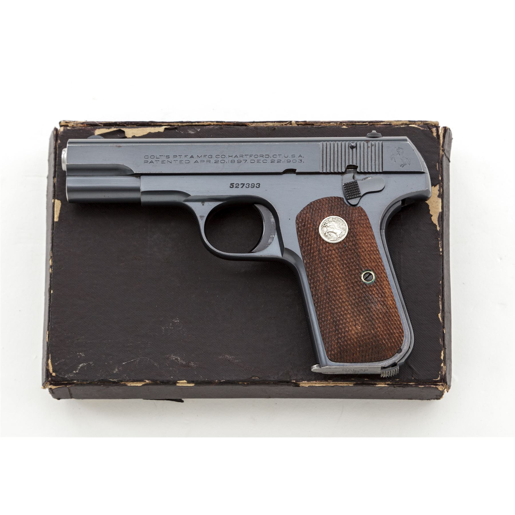 Colt Model 1903 Pocket Hammerless Semi-Automatic Pistol, #527393, .32 ACP cal., 3.75'' barrel, blue finish, factory checkered walnut grips with Colt medallions, and correct all-blue magazine marked ''Cal.32/Colt'', in its original box with cleaning brush, instructions, and safety tips. Mfg'd 1937. Condition is excellent retaining approx. 98% lightly thinning blue. Grips remain mostly crisp with very light impressions. Action is good, bore is bright. Box with losses to upper edge of lid, some tape repair, but overall very good. Est.: $650-$850. (C&R/PPT)