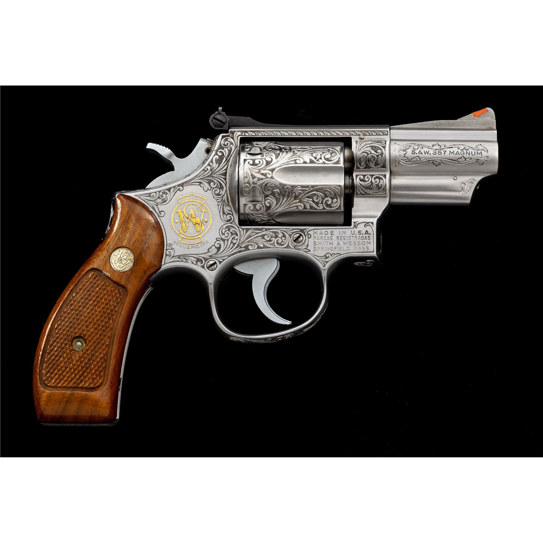 Angelo Bee Engraved Smith & Wesson Model 66-1 Double Action Revolver, #32K6585, 357 mag. cal., 2.5'' pinned barrel, stainless steel, standard checkered round butt walnut grips with S&W medallions, adjustable rear and red ramp front sight. Typical Angelo Bee Belgian scroll engraving encompasses approx. 4/5s of the revolver, with stylized applied gold S&W logo to three-screw sideplate, and Angelo's signature ''bumble bee'' to bottom left corner near logo. Condition is excellent showing just little use. Est.: $2,500-$3,500. (Modern)(Not available to Calif. residents.)