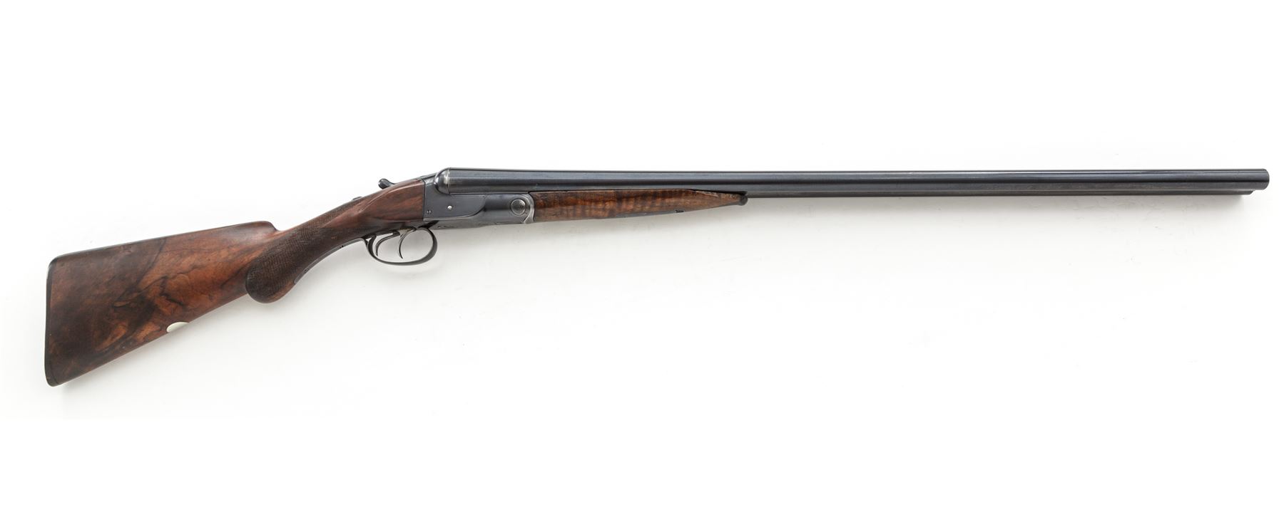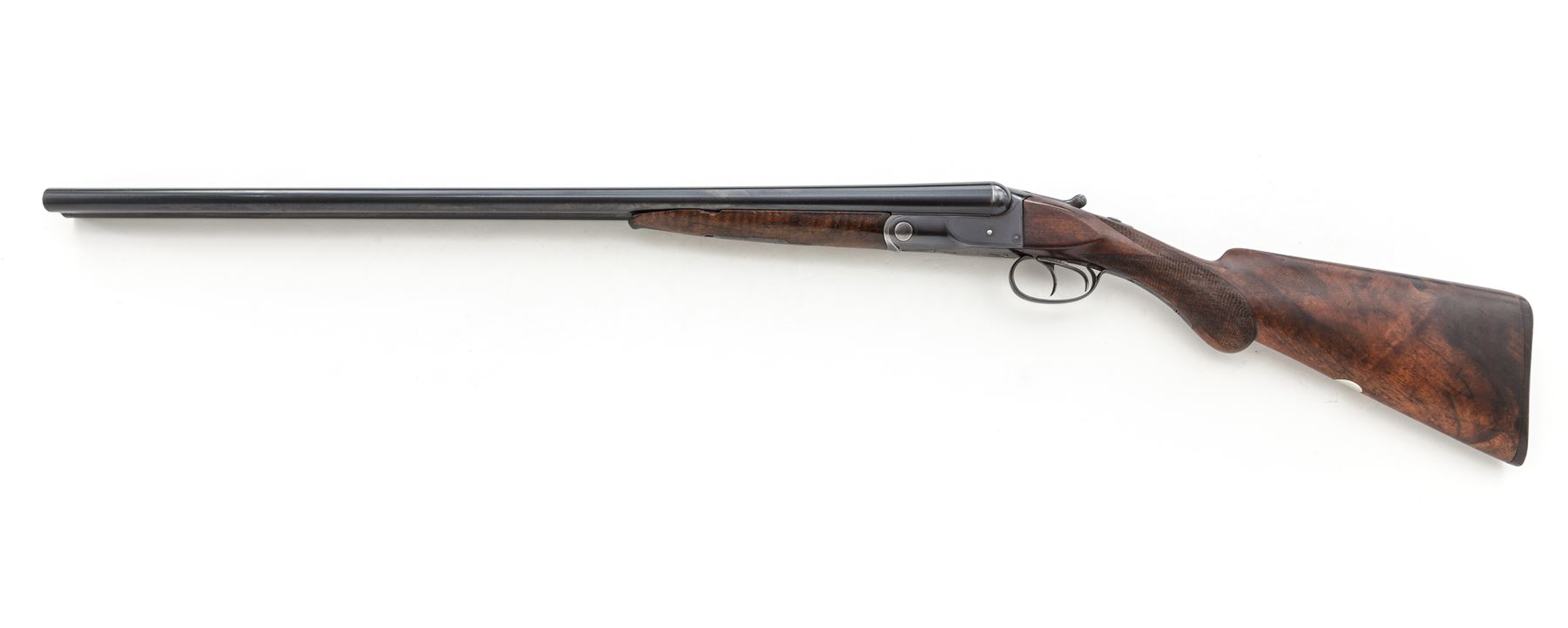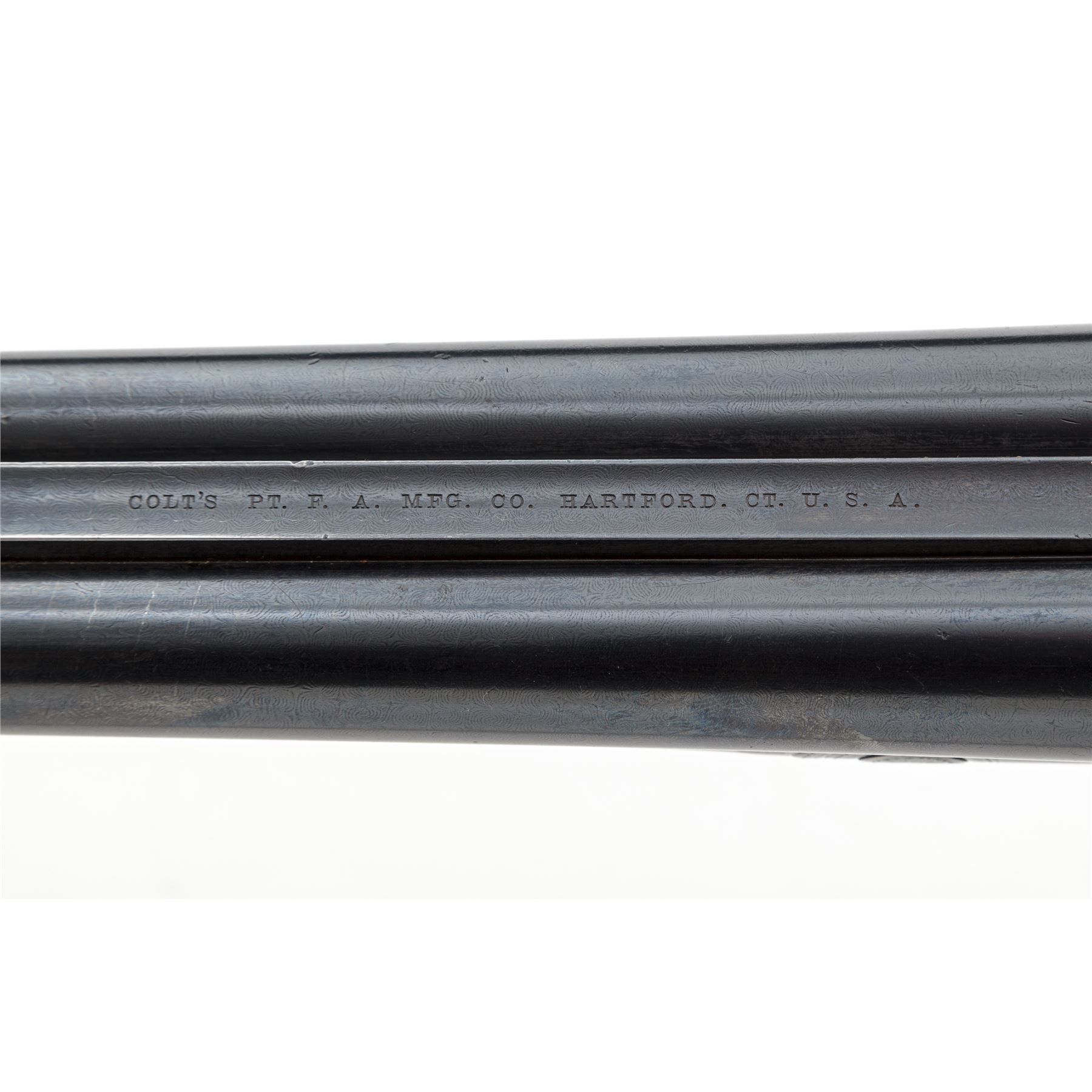 Very Early Colt Model 1883 Side-by-Side Shotgun, #350. 12 ga. 30'' Damascus barrels have 2-3/4'' chambers and are choked IM/IM, with correct Colt marking on rib. Action features double underlugs with doll's head extension, double triggers, auto safety and plain extractors. Receiver is lightly engraved around hinges and borders, with patent dates on bottom. Splinter forend and round-knob pistol-grip buttstock are of nicely grained walnut, and feature an ebony forend tip and original Colt Bakelite buttplate. Mfg'd 1884. Condition is antique very good, with much wear to checkering, several chips to forend, possible old reblue to receiver and probable cold reblue to barrels. Action locks up tight and appears to function correctly; bores are very good. Est.: $700-$900. (Antique)
