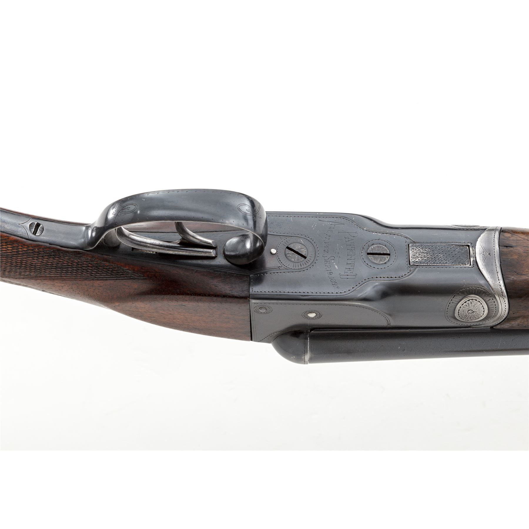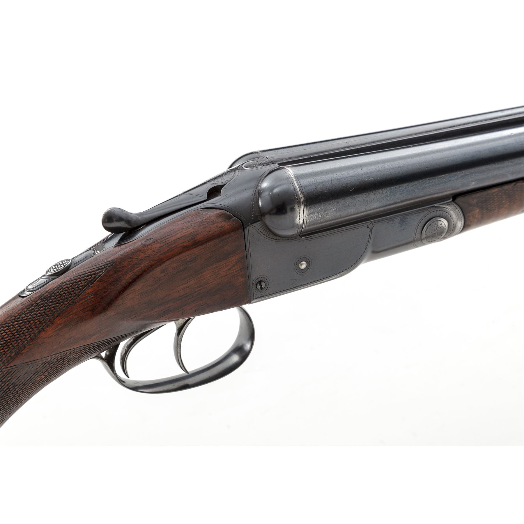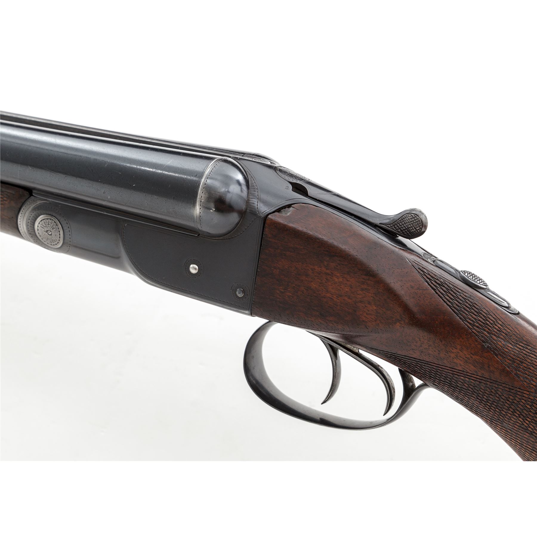 Very Early Colt Model 1883 Side-by-Side Shotgun, #350. 12 ga. 30'' Damascus barrels have 2-3/4'' chambers and are choked IM/IM, with correct Colt marking on rib. Action features double underlugs with doll's head extension, double triggers, auto safety and plain extractors. Receiver is lightly engraved around hinges and borders, with patent dates on bottom. Splinter forend and round-knob pistol-grip buttstock are of nicely grained walnut, and feature an ebony forend tip and original Colt Bakelite buttplate. Mfg'd 1884. Condition is antique very good, with much wear to checkering, several chips to forend, possible old reblue to receiver and probable cold reblue to barrels. Action locks up tight and appears to function correctly; bores are very good. Est.: $700-$900. (Antique)