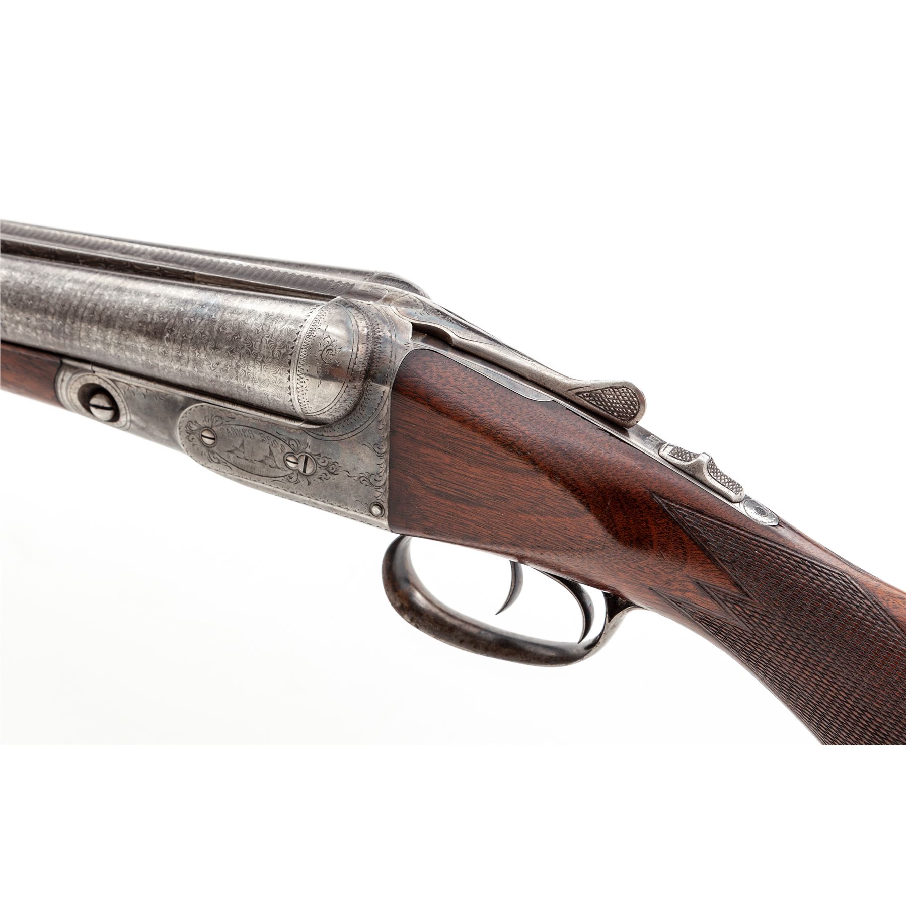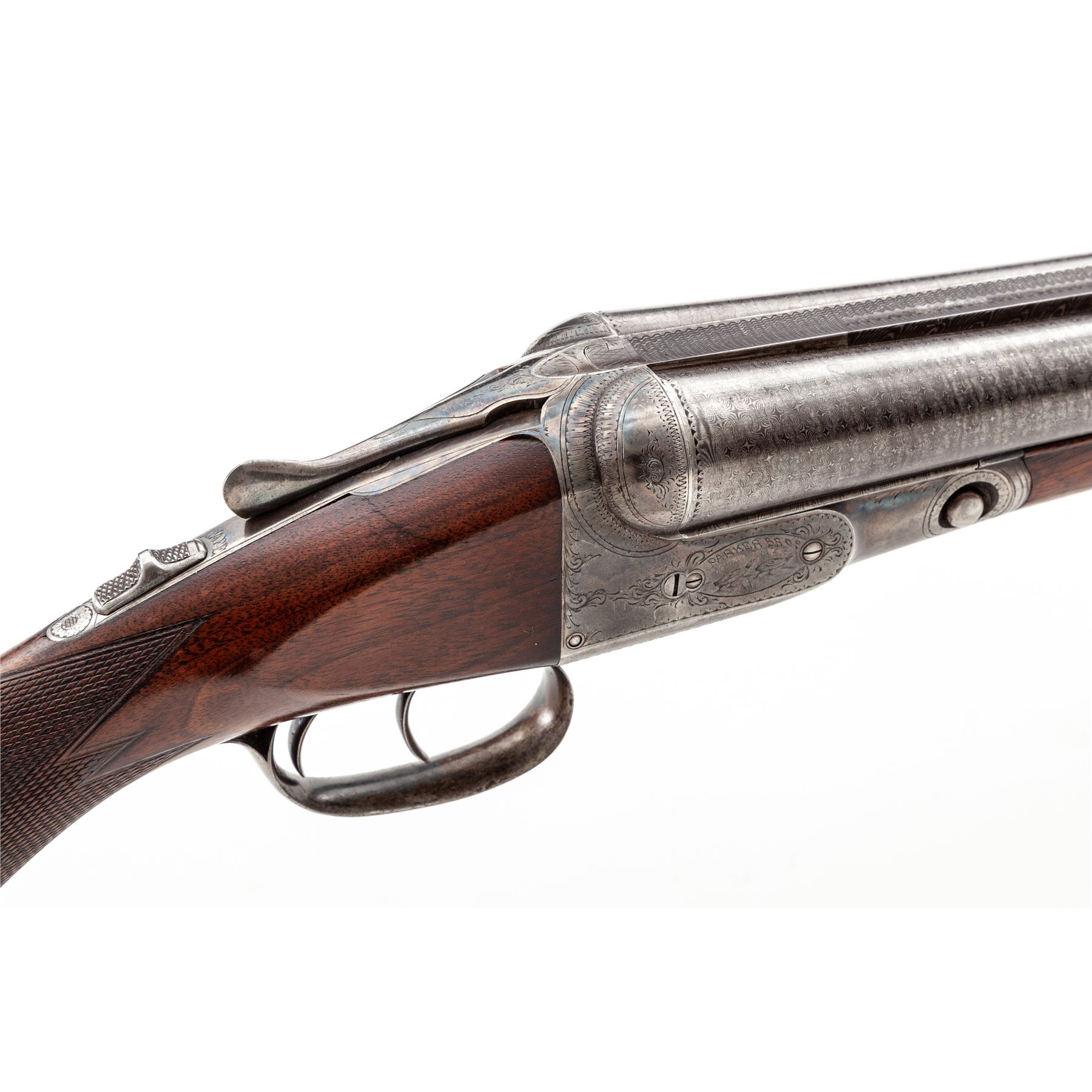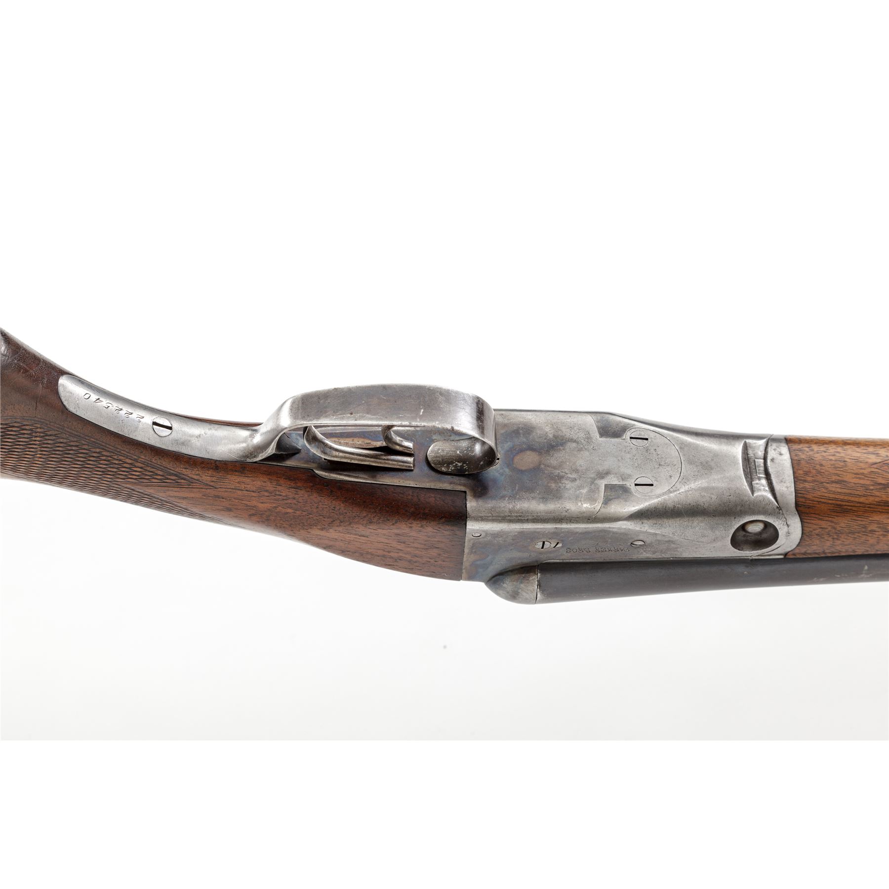 Parker GH Grade Side-by-Side Shotgun, #131065. 12 ga. 28'' ''Damascus Steel'' barrels have 2-3/4'' chambers and are choked IM./Full. Boxlock receiver is nicely engraved with border scrolls and three game scenes in ovals: ducks on the left, grouse on the right, and pheasant on the bottom; double triggers and extractors. Splinter forend and pistol-grip buttstock are nicely checkered at 22 LPI and have a Parker Bakelite grip cap and early dog's head checkered buttplate. Mfg'd 1905. Condition is very good, with 20%-30% case hardening on frame, 95% Damascus pattern on barrels, and numerous handling marks on buttstock. Action locks up tight and bores are bright. Est.: $1,500-$2,000. (C&R)
