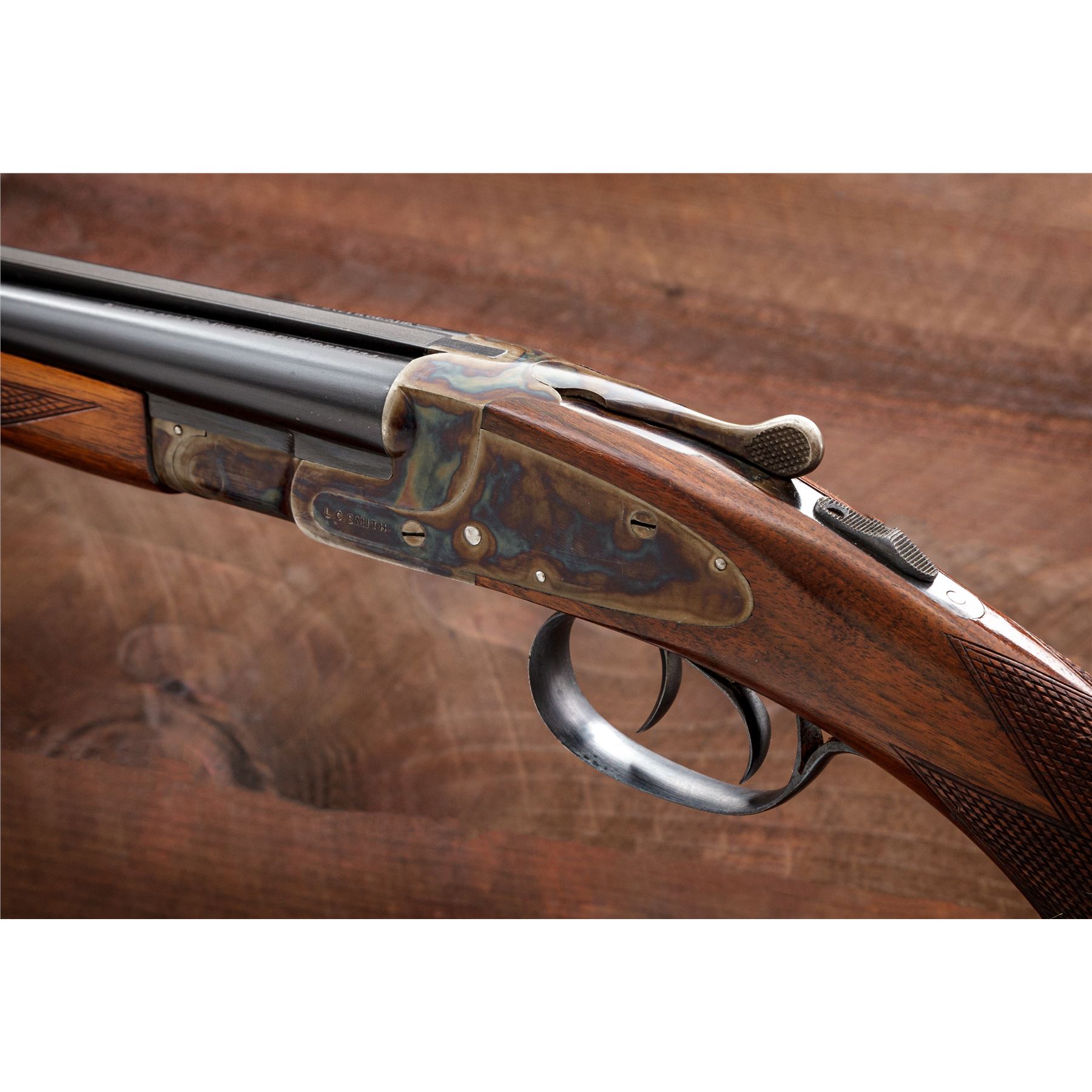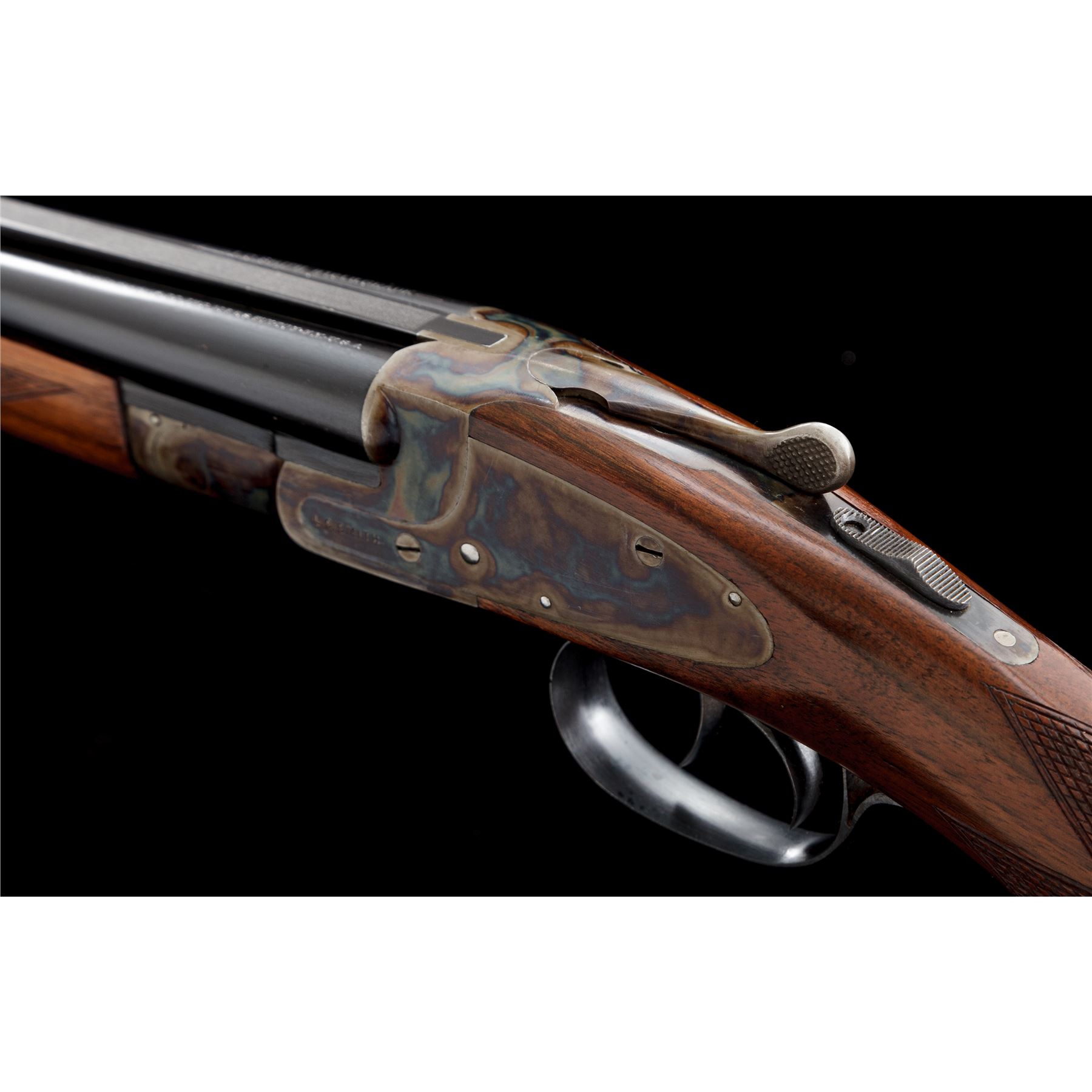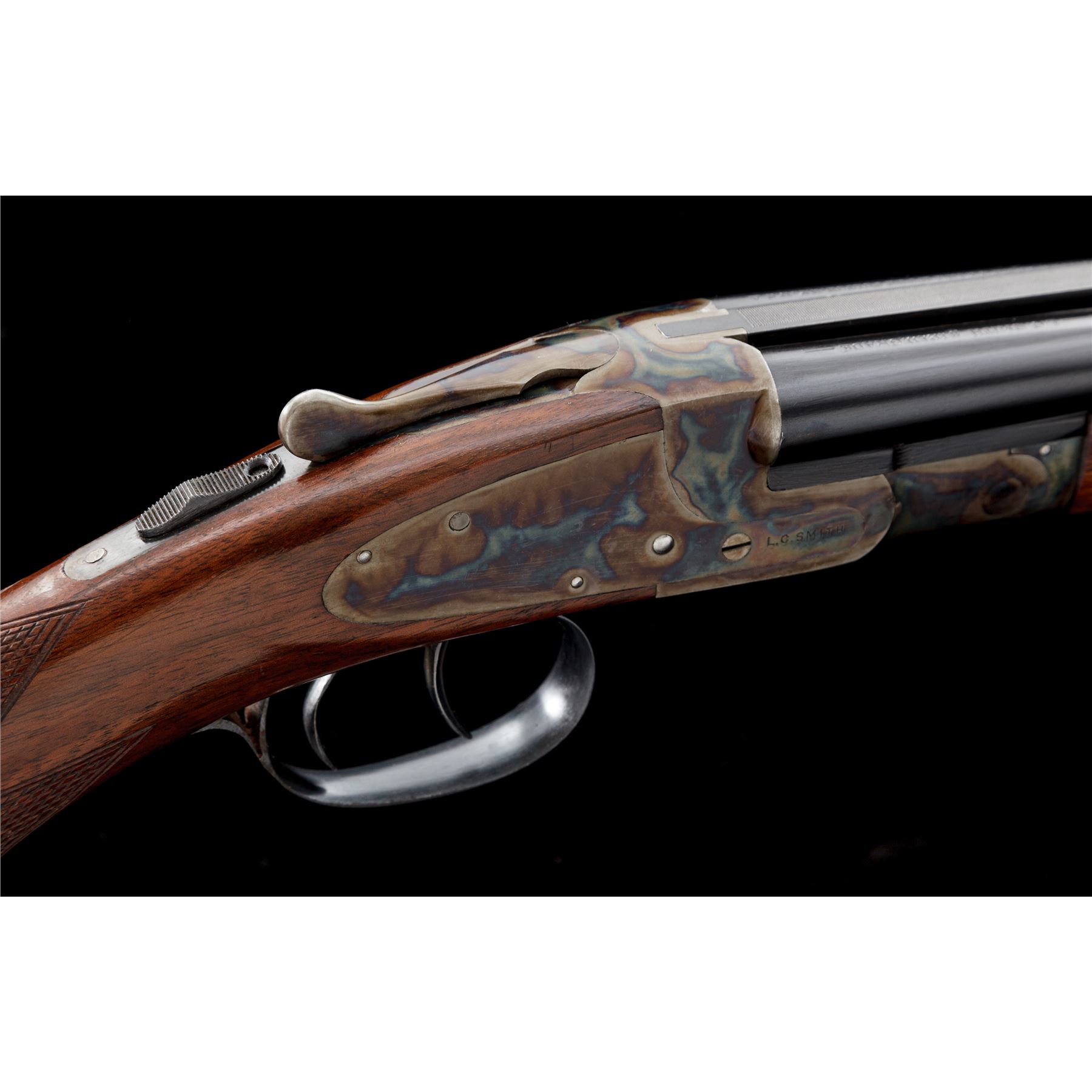Scarce and Desirable L.C. Smith Featherweight .410 Field Grade Side-by-Side Shotgun, #175454, .410 bore, 28'' checkered ribbed blue barrels, case hardened sidelock frame, auto safety, ejectors, checkered pistol-grip walnut stock, with splinter forend. Mfg'd 1938. Top of watertable marked ''FwE175454/Field''. Bottom chamber area of barrels marked ''PM Co.'' in square cartouche over ''NP''. Barrels both additionally marked ''Armor Steel''. Top chamber area of right barrel marked ''L.C. Smith Field Grade''; left barrel marked ''Hunter Arms Co. Inc., M'F'R's, Fulton, NY, USA''. Condition is excellent. Barrel assembly retains approx. 98%+ original blue finish. Case hardened frame components remain bright and vivid with only the lightest thinning to balance point. Triggerguard exhibits almost all of its original blue with unturned screws. Stock with light impressions to right side cheek area, with the only real detraction being a very small chip to tip of buttplate. Length of pull: 14"; drop at comb: 1--3/8"; drop at heel: 2-5/8". Tight crisp action, mirror bright bores. A near pristine example of a pre-war American shotgun in the most desirable chambering manufactured. Est.: $7,500-$10,000. (C& R)
