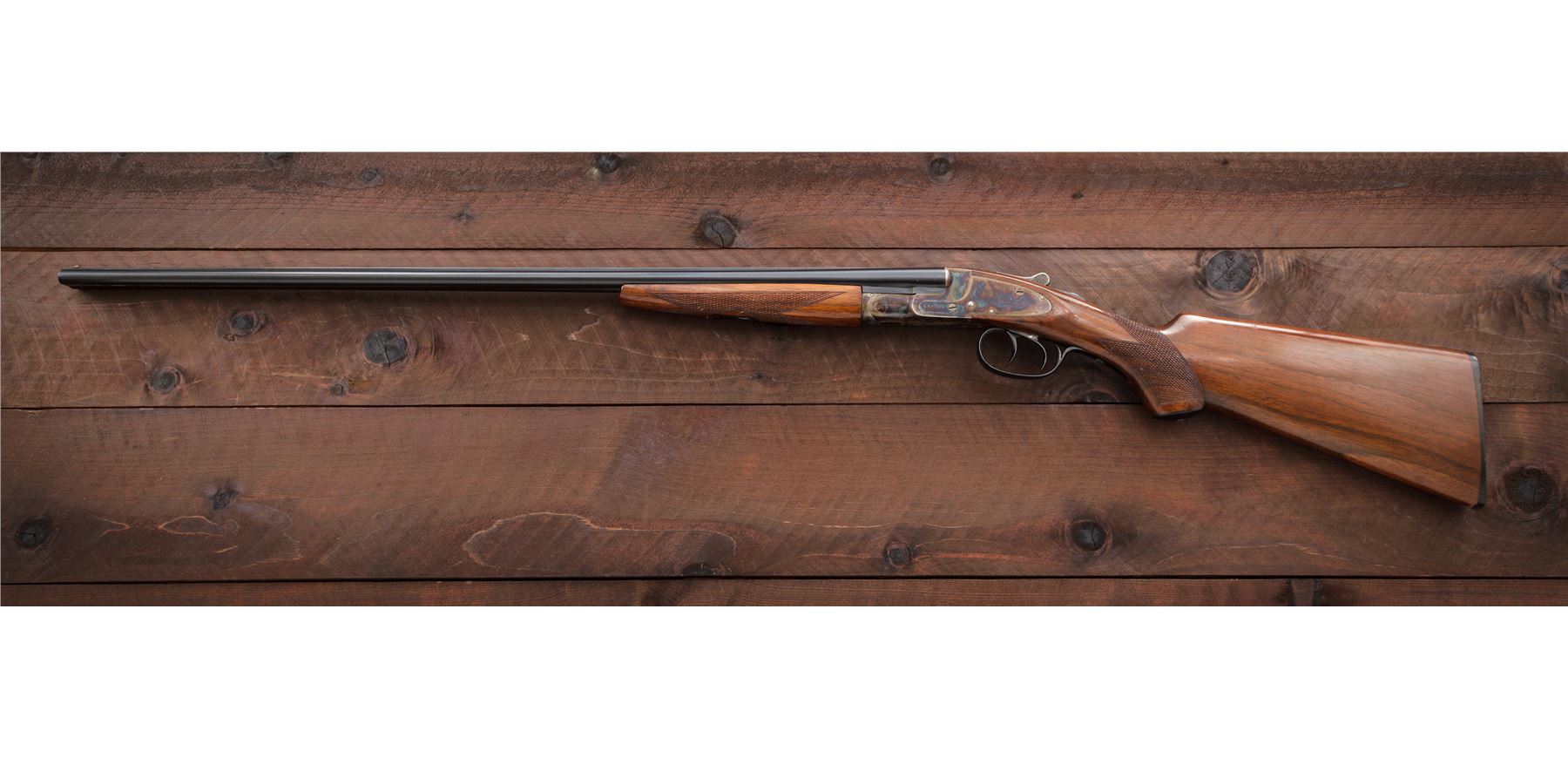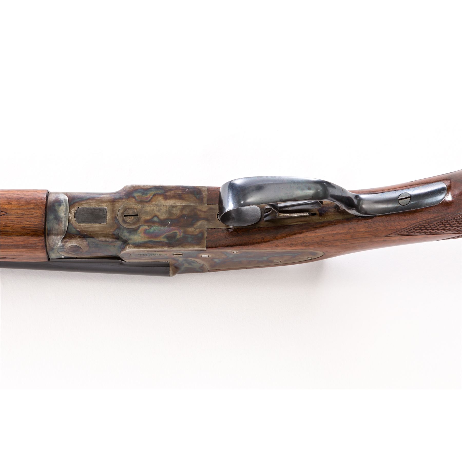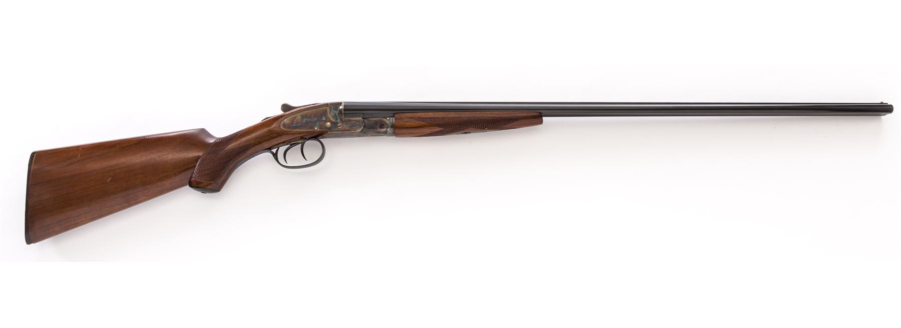 Scarce and Desirable L.C. Smith Featherweight .410 Field Grade Side-by-Side Shotgun, #175454, .410 bore, 28'' checkered ribbed blue barrels, case hardened sidelock frame, auto safety, ejectors, checkered pistol-grip walnut stock, with splinter forend. Mfg'd 1938. Top of watertable marked ''FwE175454/Field''. Bottom chamber area of barrels marked ''PM Co.'' in square cartouche over ''NP''. Barrels both additionally marked ''Armor Steel''. Top chamber area of right barrel marked ''L.C. Smith Field Grade''; left barrel marked ''Hunter Arms Co. Inc., M'F'R's, Fulton, NY, USA''. Condition is excellent. Barrel assembly retains approx. 98%+ original blue finish. Case hardened frame components remain bright and vivid with only the lightest thinning to balance point. Triggerguard exhibits almost all of its original blue with unturned screws. Stock with light impressions to right side cheek area, with the only real detraction being a very small chip to tip of buttplate. Length of pull: 14"; drop at comb: 1--3/8"; drop at heel: 2-5/8". Tight crisp action, mirror bright bores. A near pristine example of a pre-war American shotgun in the most desirable chambering manufactured. Est.: $7,500-$10,000. (C& R)