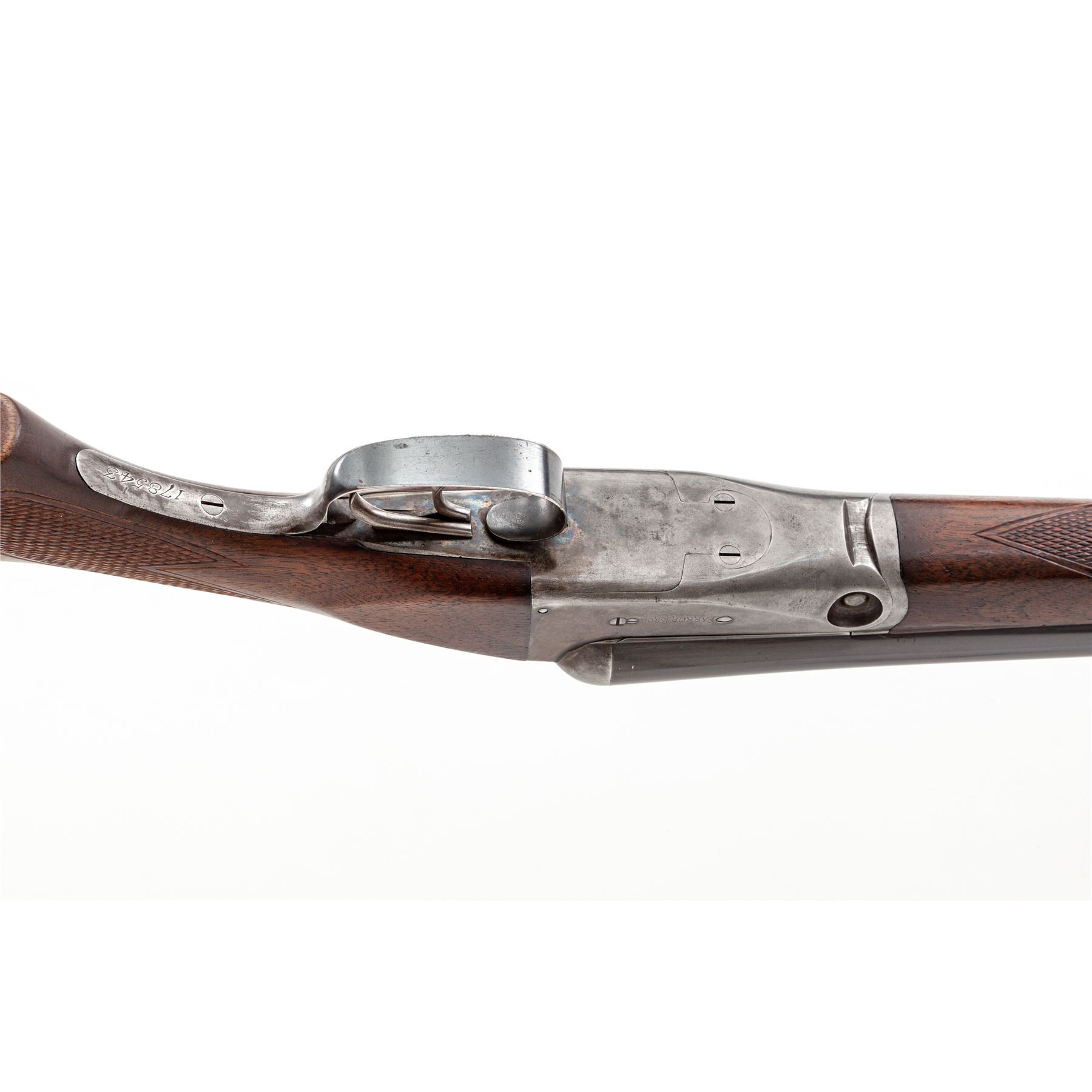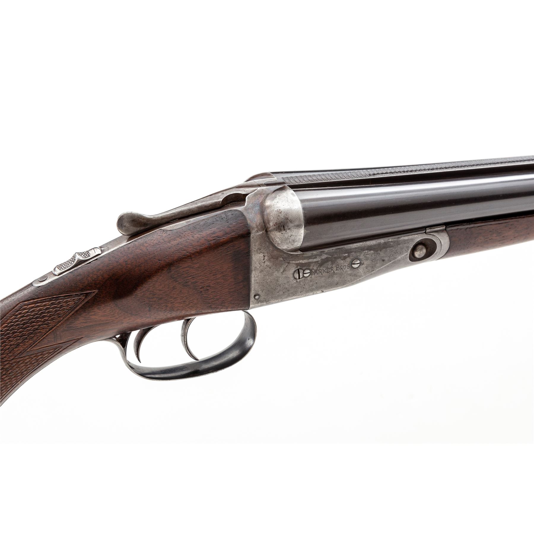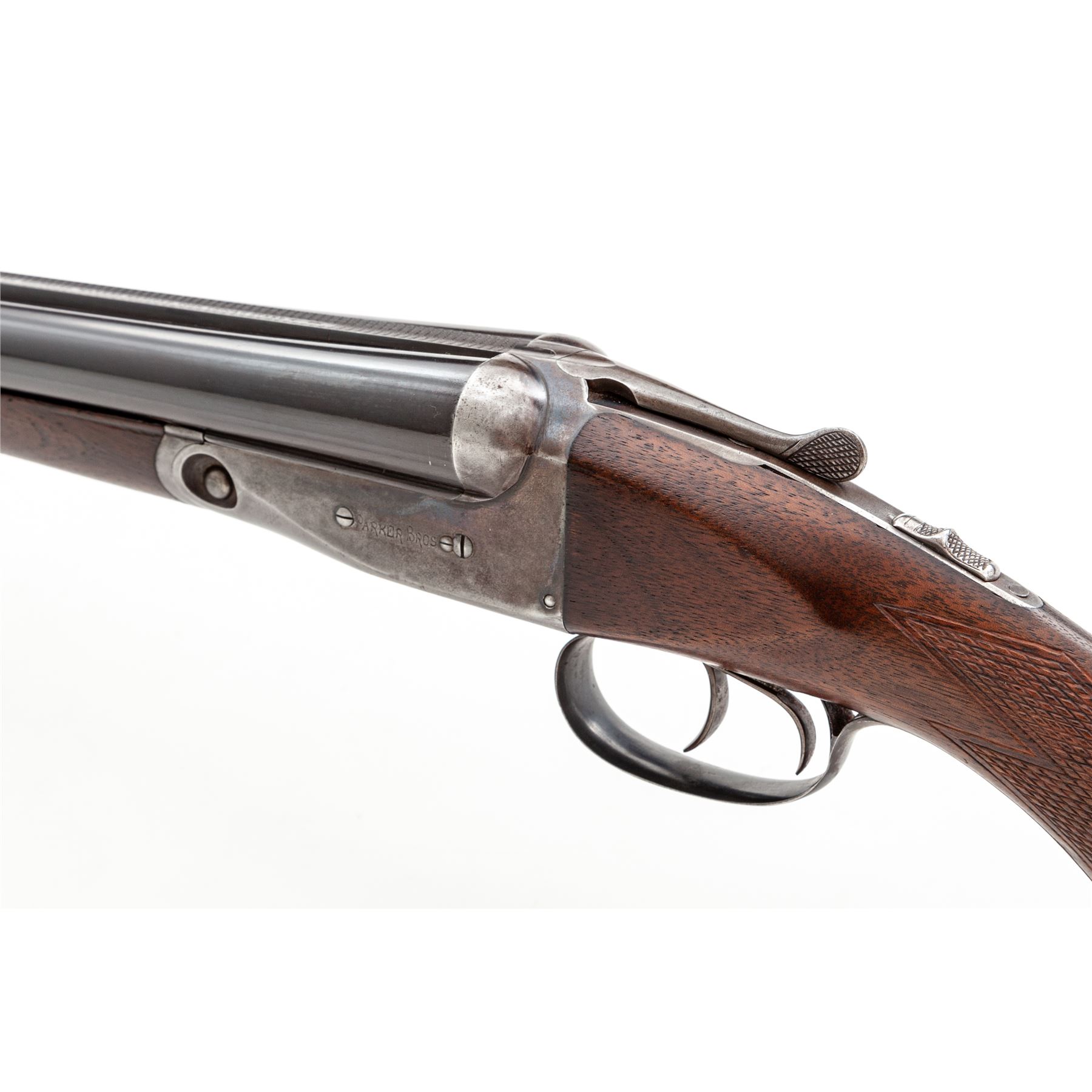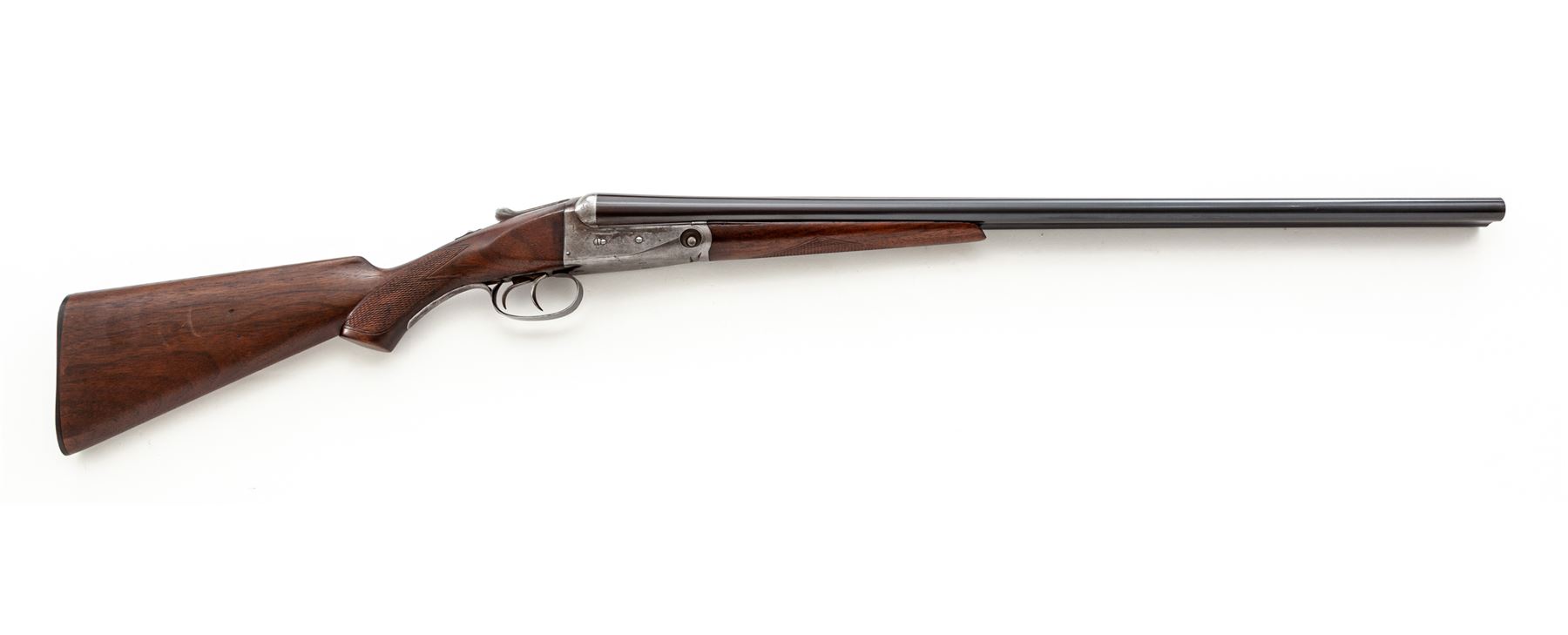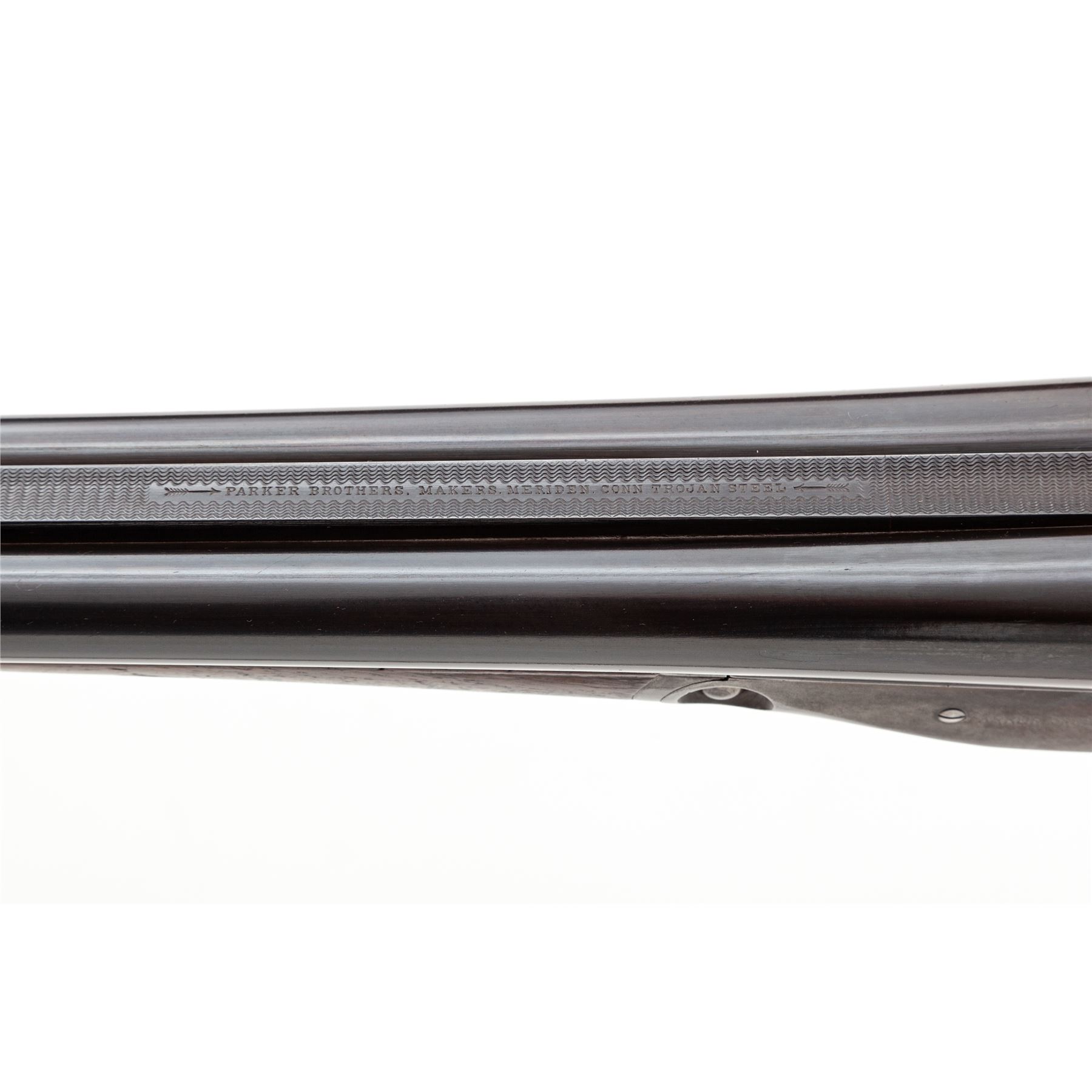 Parker Trojan Side-by-Side Shotgun, #178543. 16 ga. 26'' ''Trojan Steel'' barrels have 2-3/4'' chambers and are choked IC/Mod. Splinter forend and pistol-grip buttstock are of Field Grade walnut, with minimal checkering, no grip cap, and dog's head buttplate. Receiver has no engraving, and action features double triggers, auto safety and plain extractors. Mfg'd 1918. Condition is very good, with approx. 5% case color and 95% barrel blue remaining; few handling marks to wood. Very tight lockup, crisp action and very good bores. Est.: $600-$800. (C&R)