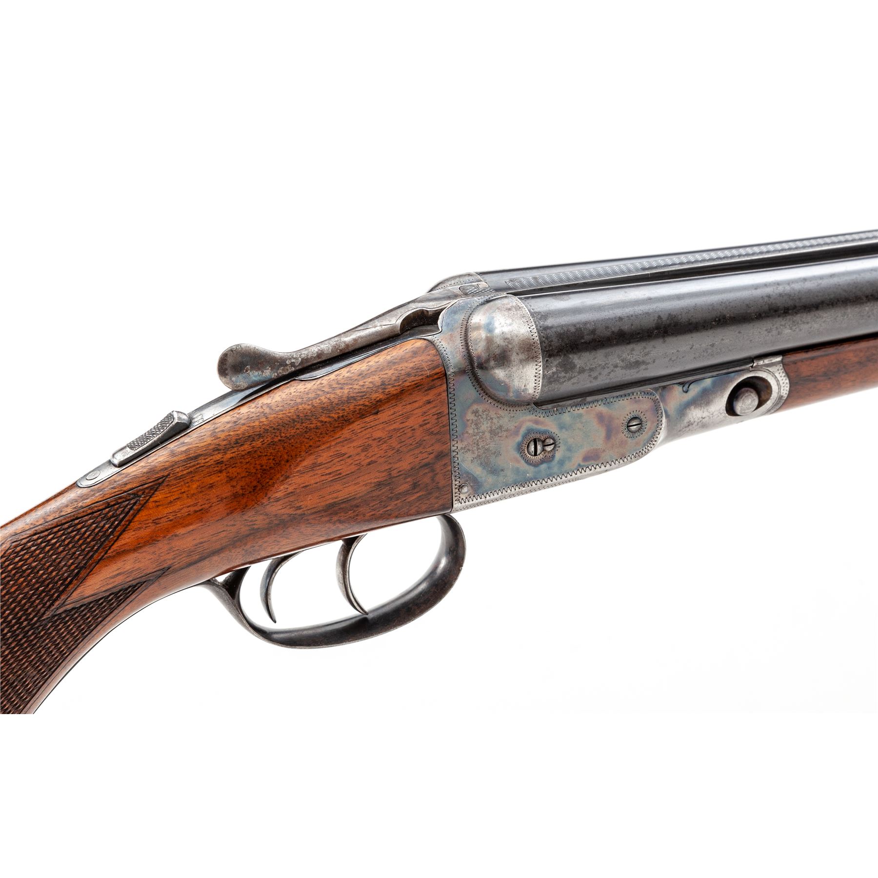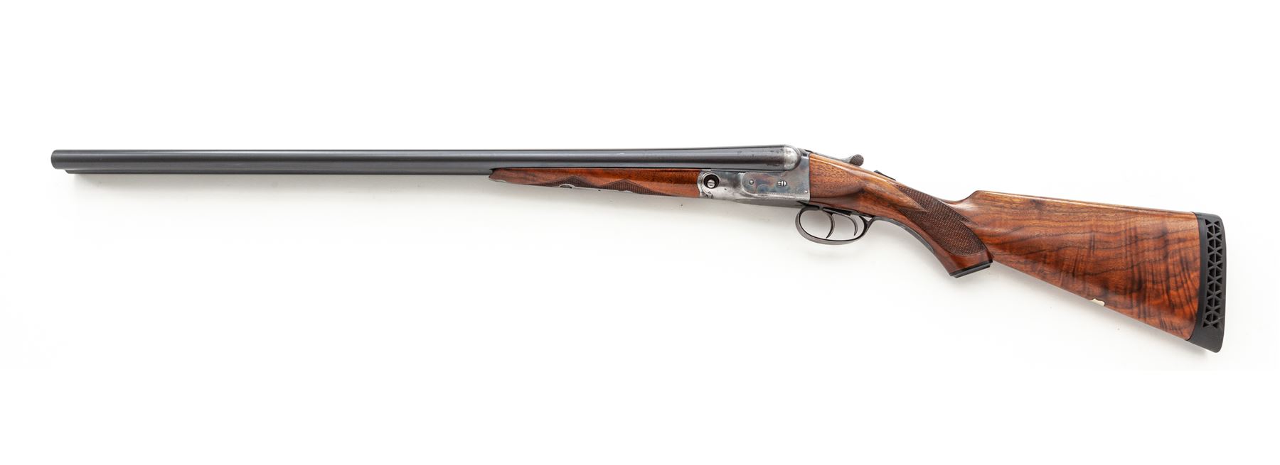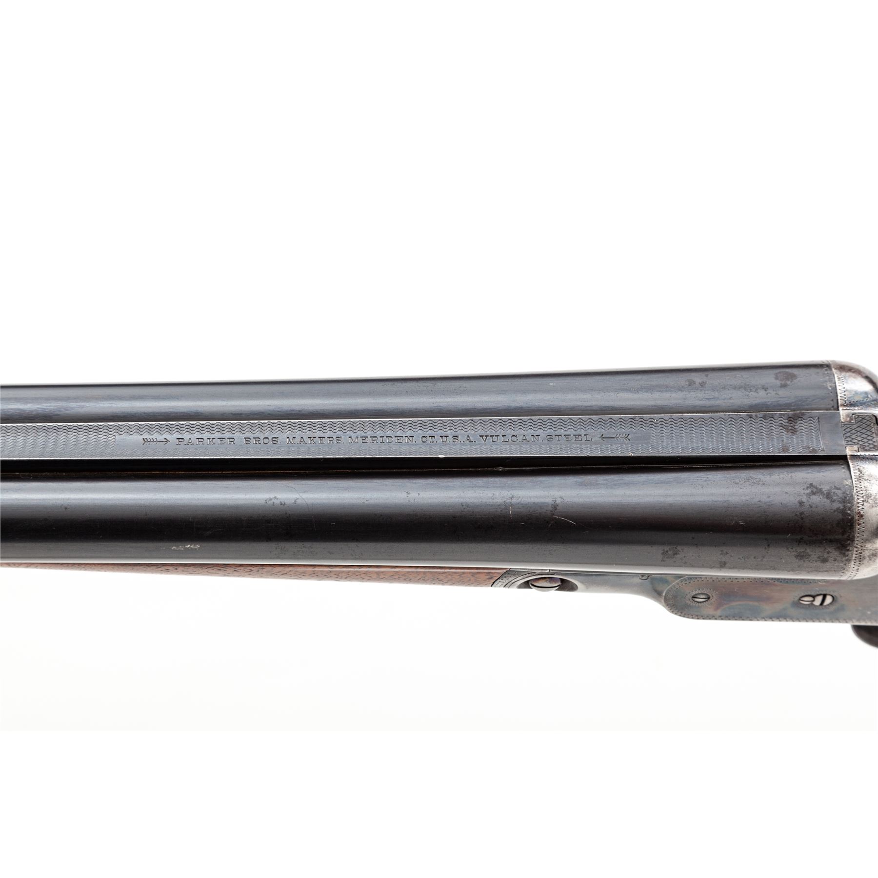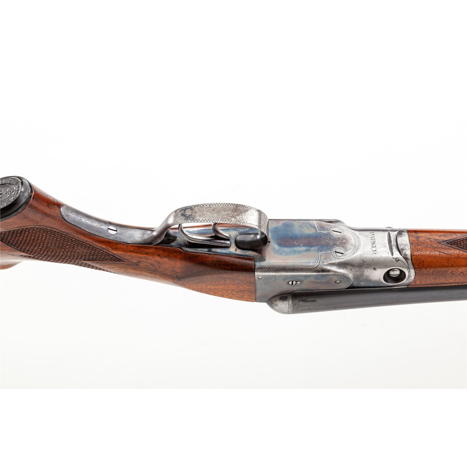 Parker VHE Grade Side-by-Side Shotgun, #239564. 12 ga. 28'' ''Vulcan Steel'' barrels have 2-3/4'' chambers and are choked IM/Full. Parker boxlock action features double triggers, auto safety and selective ejectors. Splinter forend appears original, pistol-grip buttstock may be a replacement with higher grade walnut; Parker grip cap and Pachmayr ''Competitor'' butt pad are present. Mfg'd 1936. Condition is very good with 30%-40% case color on receiver, some fading to barrels, and few handling marks to wood. Not much wear to action, which still locks tight and functions correctly; bores are bright. Est.: $1,250-$1,750. (C&R)