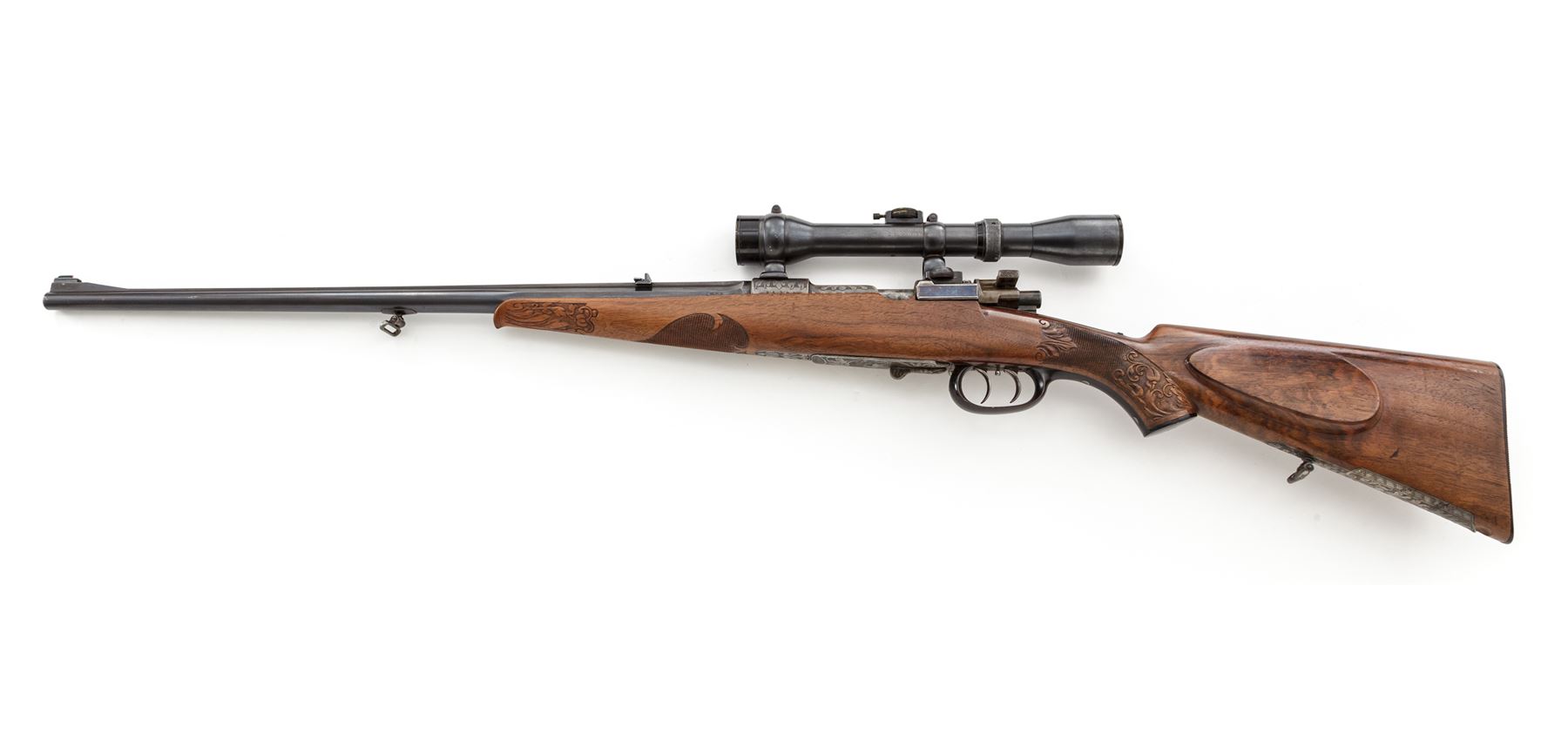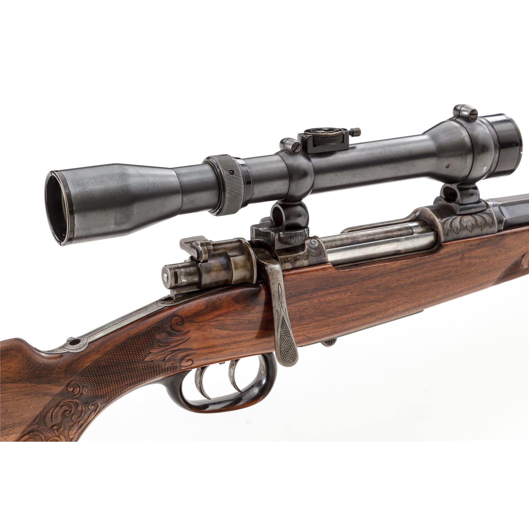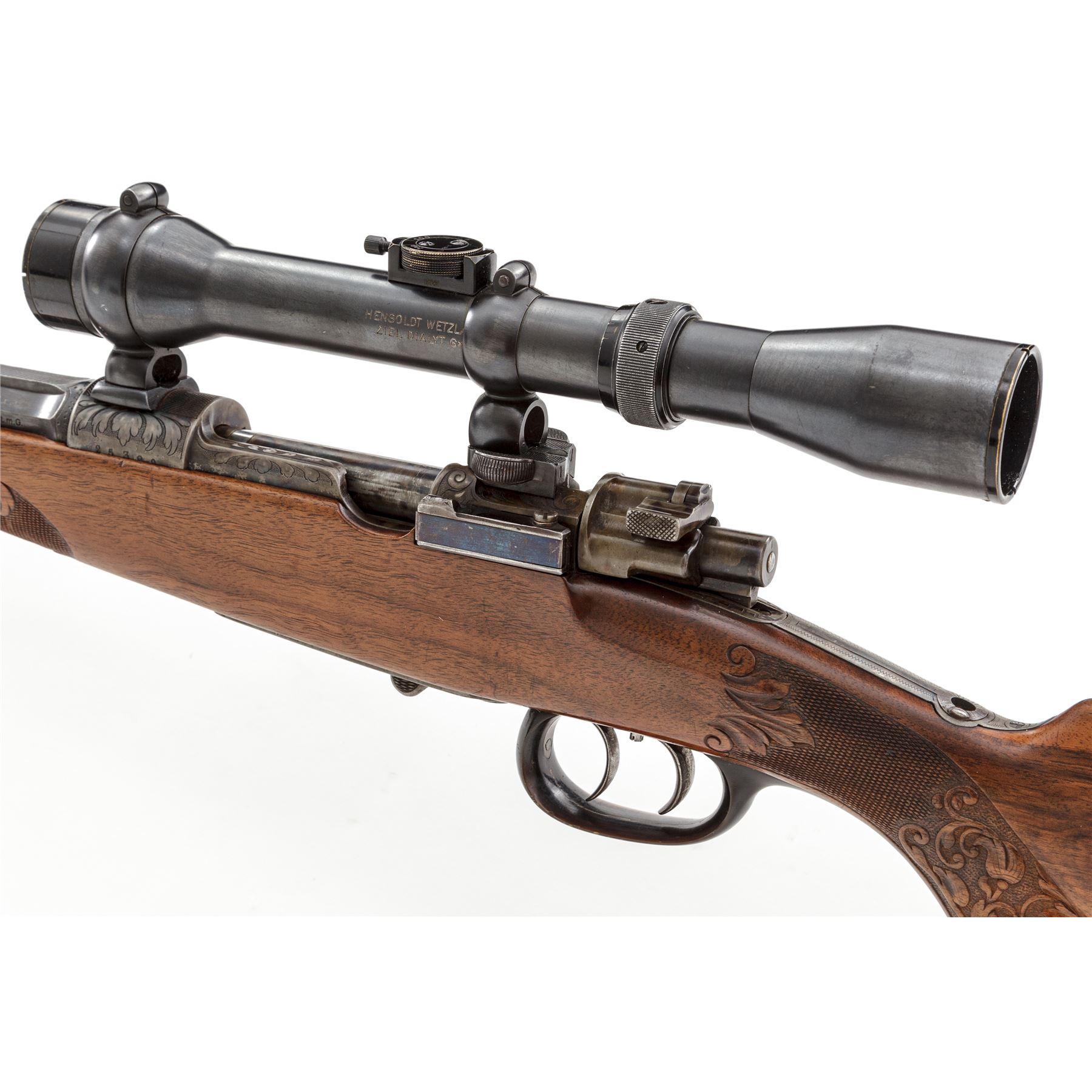 Magnificent Custom Engraved Mauser Bolt Action Rifle, by Ed. Kettner, #25390, 8mmx57mm cal., rust blued and color case hardened, carved and checkered sporting rifle stock with Schnabel forend, horn triggerguard, buttplate, and pistol grip cap. Double set triggers, folding tang peep sight, and trap in bottom of stock for ammunition. Action is topped with a removable claw-mounted Hensolt-Wetzlar Ziel Dialyt 6x scope with three-post reticle. The 22.5'' barrel is 1/3 octagon, and 2/3 round with an integral matte engraved flat top rib, dovetailed ''V'' type rear sight with additional folding leaf, and a unique pinned front sight having a round gold tipped bead, and polished mirror finished roundel mounted at an angle to reflect light on the tip of the sight bead. Barrel has engraved markings that read ''Ed. Kettner, Suhl, 8x57'', and stamped proofmarks of ''St. mG'' and ''(crown)''. Color case hardened action is covered with large leaf type decorations and stippling, with checkered pattern on top of chamber area. Bolt has a spoon-handle knob with a checkered panel near the tip, and a checkered safety blade, color case hardened with a bright polished extractor spring and retaining ring. Folding peep sight behind the tang is adjustable for windage and elevation. Floorplate and housing are engraved with floral, leaf flourishes, stippling, and a six-point buck deer. There is a floorplate release lever that is engraved also. Triggerguard is a wide solid one-piece carved horn type, typical of high end German rifles and shotguns. Pistol grip cap is horn, retained with a single screw. An engraved color case hardened folding trap is fitted to the bottom edge of the rear buttstock, with a slotted hole for storage. Stock features a Monte Carlo type cheekpiece on the left side, checkered and carved grip panels, forend, and carved decorated Schnabel tip, with sling swivels. Condition is excellent with barrel having approx. 98% of its original rust blued finish. There are a couple of small scratches on either side of barrel from use, and slight wear to the bluing at muzzle sides. Color case hardening finish on the action and floorplate are approx. 99%. Bolt shows wear to the finish where it rides in the action from normal use, with a few light scuffs on the bright extractor spring. Bolt release lever and spring show some high edgewear to fire blued finish, with some light scratches on the spring. Horn triggerguard has a few very minor nicks to the sharp side edge. Horn pistol grip cap is cracked in the lower center. Grooved horn buttplate has some small dings, and some insect damage in several places. Stock appears to be English walnut and has its original finish; checkering is very fine and well executed, with wonderful hand carved decorations surrounding the checkering. There are some minor scratches and scuffs in the sides of the stock around triggerguard and action area, sides of buttstock, near bullet trap and cheekpiece. Scope retains approx. 98% of its original rust blued finish and shows wear mainly on the high edges of the black painted lens retainers. Action and double set triggers function properly; bore is bright and shiny; optics are clear and bright. A beautiful rifle with top quality work and finish. Est.: $2,500-$3,000. (Modern)