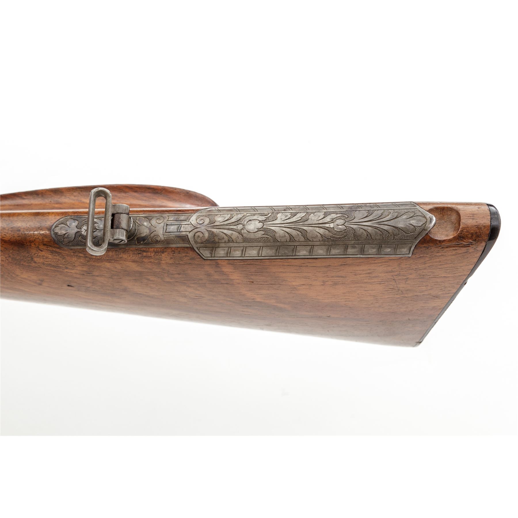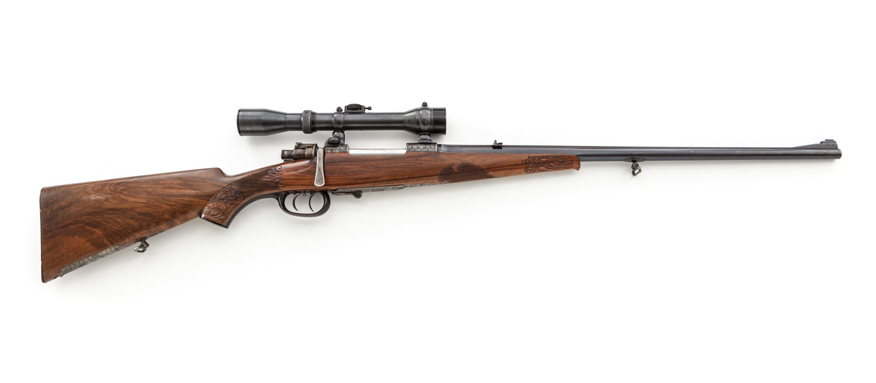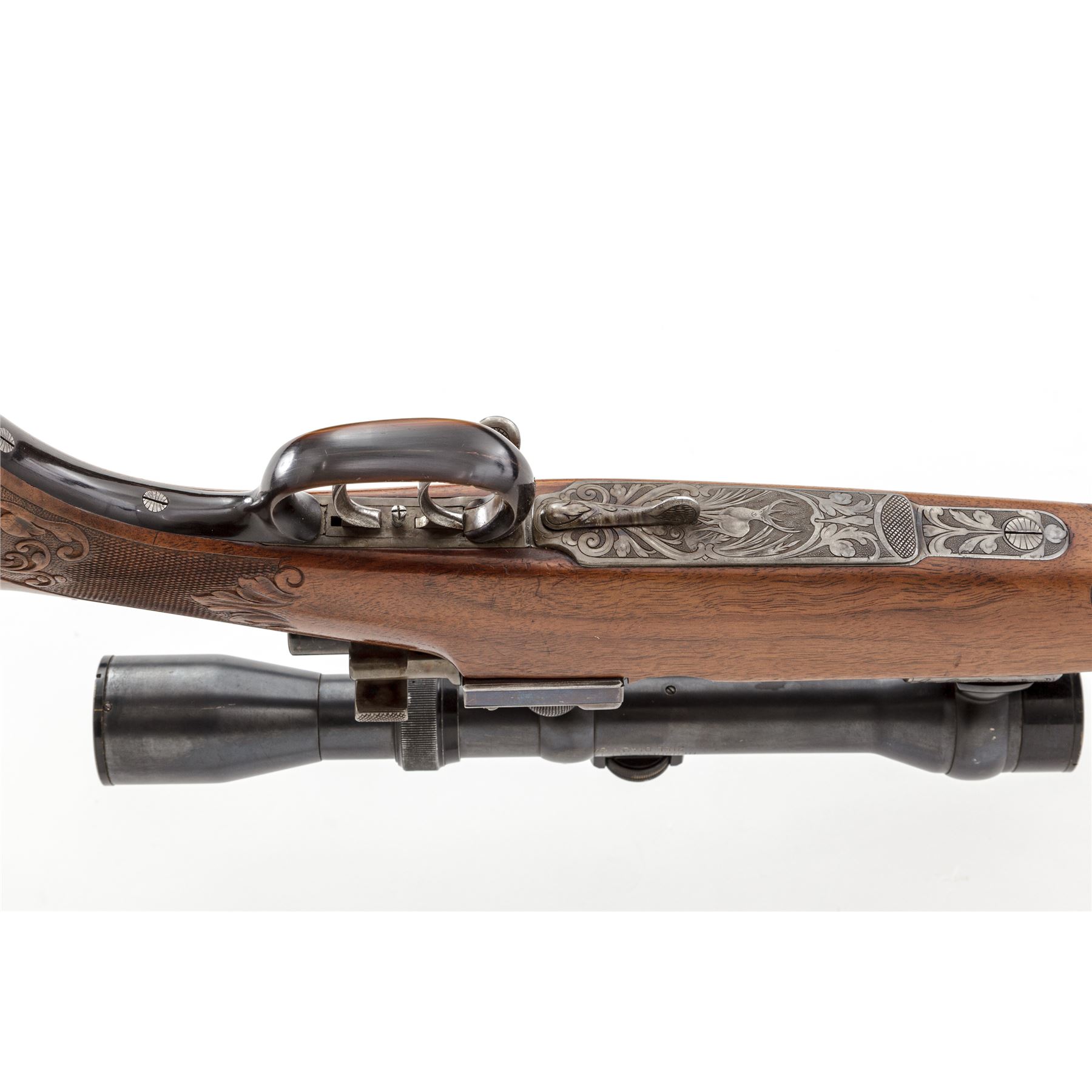 Magnificent Custom Engraved Mauser Bolt Action Rifle, by Ed. Kettner, #25390, 8mmx57mm cal., rust blued and color case hardened, carved and checkered sporting rifle stock with Schnabel forend, horn triggerguard, buttplate, and pistol grip cap. Double set triggers, folding tang peep sight, and trap in bottom of stock for ammunition. Action is topped with a removable claw-mounted Hensolt-Wetzlar Ziel Dialyt 6x scope with three-post reticle. The 22.5'' barrel is 1/3 octagon, and 2/3 round with an integral matte engraved flat top rib, dovetailed ''V'' type rear sight with additional folding leaf, and a unique pinned front sight having a round gold tipped bead, and polished mirror finished roundel mounted at an angle to reflect light on the tip of the sight bead. Barrel has engraved markings that read ''Ed. Kettner, Suhl, 8x57'', and stamped proofmarks of ''St. mG'' and ''(crown)''. Color case hardened action is covered with large leaf type decorations and stippling, with checkered pattern on top of chamber area. Bolt has a spoon-handle knob with a checkered panel near the tip, and a checkered safety blade, color case hardened with a bright polished extractor spring and retaining ring. Folding peep sight behind the tang is adjustable for windage and elevation. Floorplate and housing are engraved with floral, leaf flourishes, stippling, and a six-point buck deer. There is a floorplate release lever that is engraved also. Triggerguard is a wide solid one-piece carved horn type, typical of high end German rifles and shotguns. Pistol grip cap is horn, retained with a single screw. An engraved color case hardened folding trap is fitted to the bottom edge of the rear buttstock, with a slotted hole for storage. Stock features a Monte Carlo type cheekpiece on the left side, checkered and carved grip panels, forend, and carved decorated Schnabel tip, with sling swivels. Condition is excellent with barrel having approx. 98% of its original rust blued finish. There are a couple of small scratches on either side of barrel from use, and slight wear to the bluing at muzzle sides. Color case hardening finish on the action and floorplate are approx. 99%. Bolt shows wear to the finish where it rides in the action from normal use, with a few light scuffs on the bright extractor spring. Bolt release lever and spring show some high edgewear to fire blued finish, with some light scratches on the spring. Horn triggerguard has a few very minor nicks to the sharp side edge. Horn pistol grip cap is cracked in the lower center. Grooved horn buttplate has some small dings, and some insect damage in several places. Stock appears to be English walnut and has its original finish; checkering is very fine and well executed, with wonderful hand carved decorations surrounding the checkering. There are some minor scratches and scuffs in the sides of the stock around triggerguard and action area, sides of buttstock, near bullet trap and cheekpiece. Scope retains approx. 98% of its original rust blued finish and shows wear mainly on the high edges of the black painted lens retainers. Action and double set triggers function properly; bore is bright and shiny; optics are clear and bright. A beautiful rifle with top quality work and finish. Est.: $2,500-$3,000. (Modern)