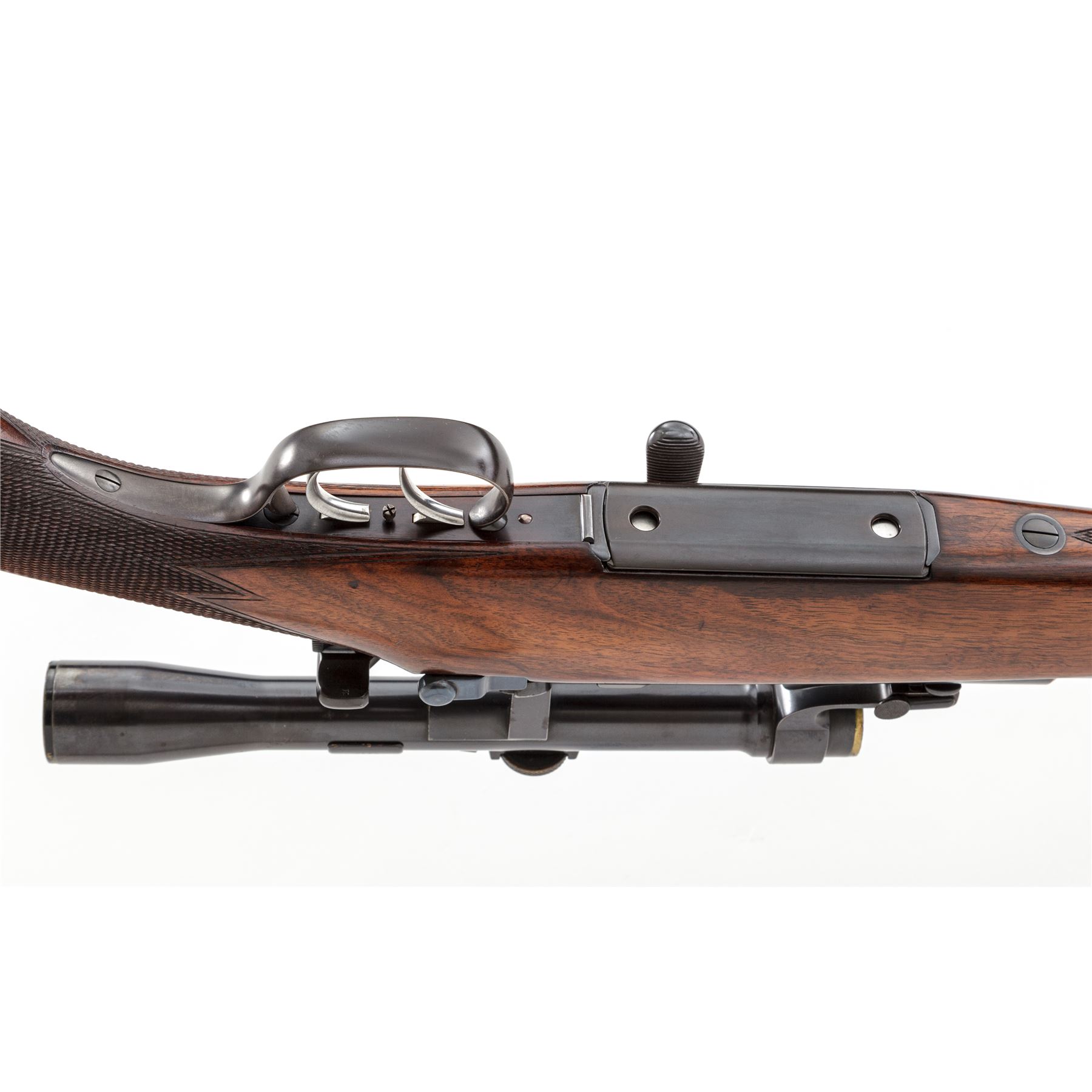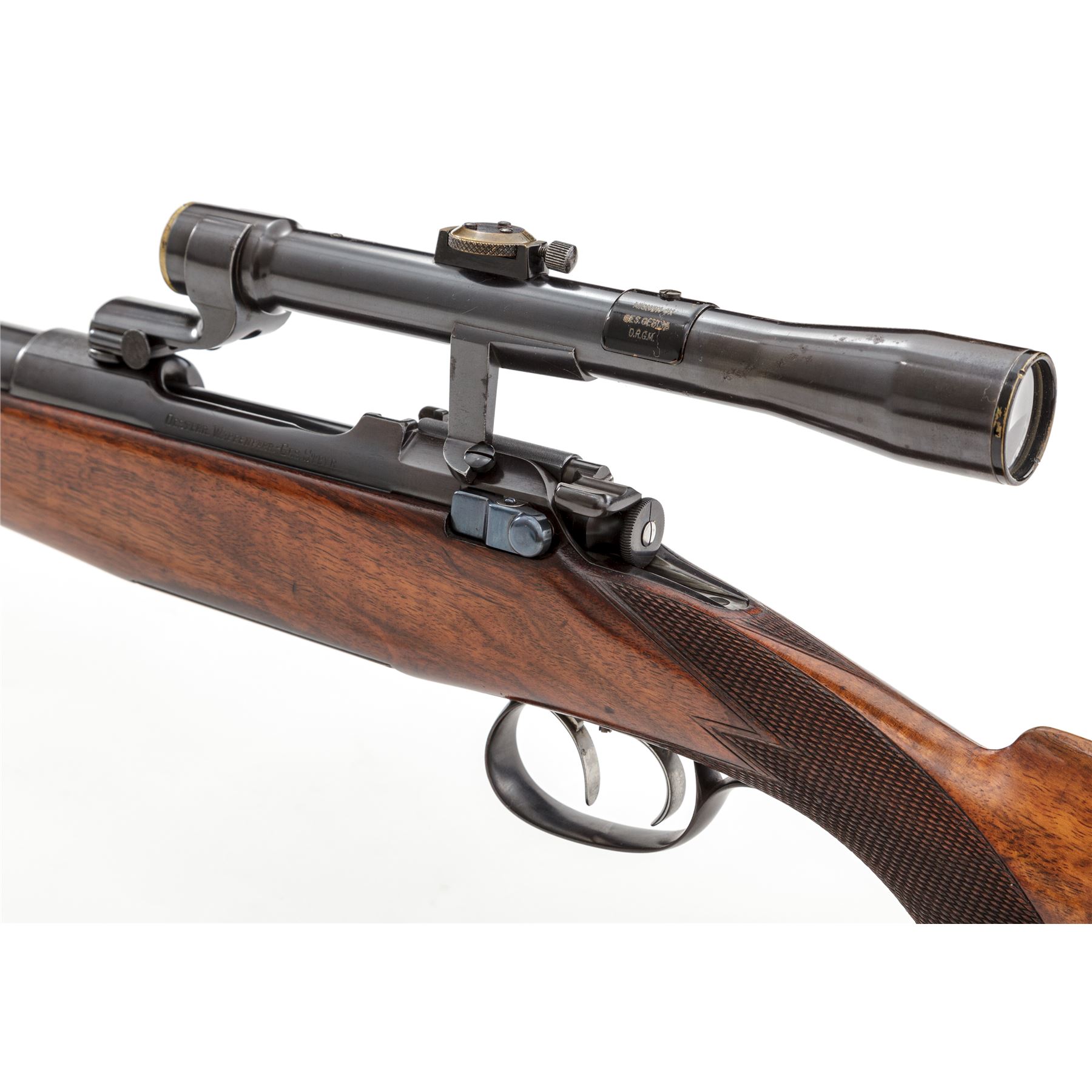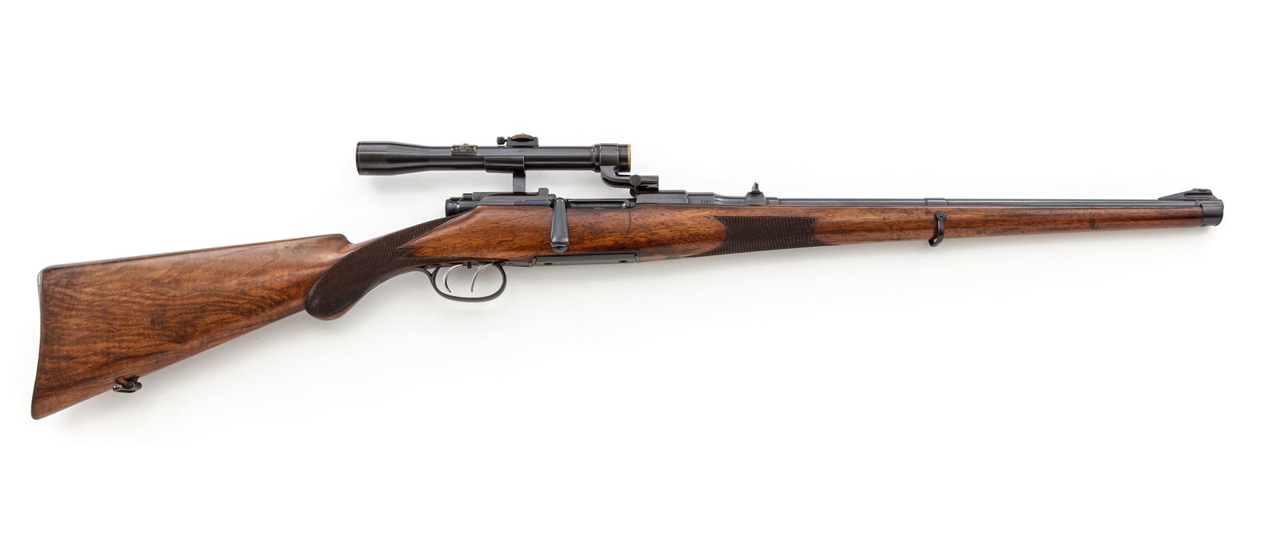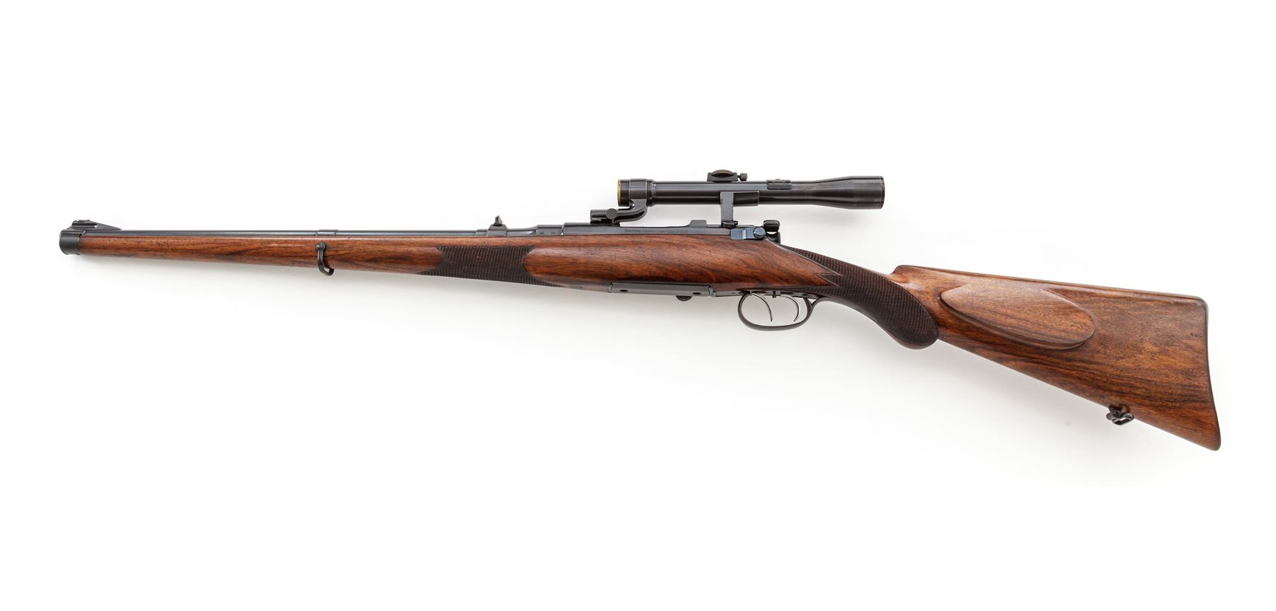 Steyr Model 1908 Mannlicher-Schoenauer Carbine Bolt Action Rifle, #1127, 8mmx56mm cal., 19.7'' round barrel, rust blued finish, double set triggers, 4x Kahles scope in removable locking mount, walnut full-length stock with Monte Carlo cheekpiece, steel buttplate with trap door for ammo storage. Rounded Prince of Wales type pistol grip with checkered grip panels, and small checkered forend wraparound panel, spoon handle bolt knob and flat blade safety, with dovetailed rear ''V''-notch sight with fold-up blade for 300 yds, and dovetailed front sight with silver metal round bead, and wide sling swivels. Action is fitted with a 4x scope with four-post reticle having thinner crosshairs, by Karl Kahles in Wien and engraved on top ''Joh. Springer in Wien'', attached with locking mount having two spring-loaded catches on either side of the front mount, and the rear mount arm fits tightly around a screw in the receiver. Elevation knob turns with some effort, and the parallax adjustment is stiff. Optics are clear and bright. Condition is excellent with approx. 98-99% of the original blued finish on the barrel and receiver. Bolt shows only minor losses to the finish where it contacts the action in use. Floorplate and triggerguard show very slight thinning to the blued finish. Buttplate retains approx. 98% bluing. Wood stock is in very nice condition, with a beautiful walnut grain and original finish, showing light dings, scuffs and scratches from light use; checkering is sharp and in nice condition. Action and double set triggers function properly; bore is bright and shiny, like new. The fire blue finish on the bolt release knob and action spring is approx. 98%. Scope shows approx. 85%-90% of its original rust blued finish with some scattered pinprick pitting on the rear and center of the scope body and front mount. Est. $1,800-$2,800. (C&R)