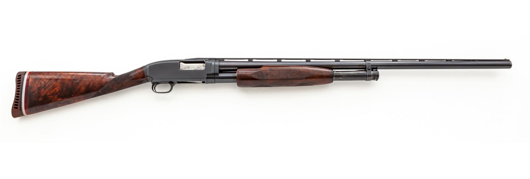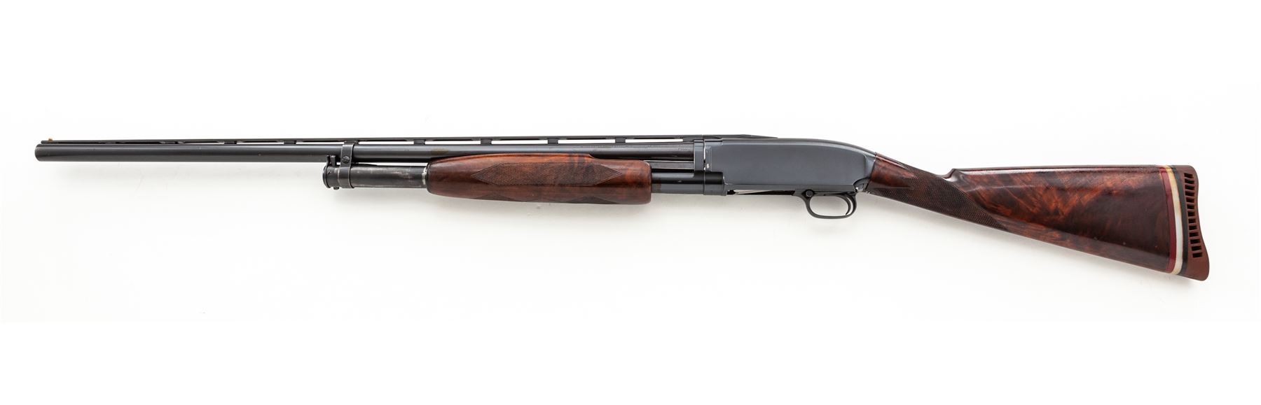 Winchester Model 12 Trap Slide-Action Shotgun, #819558. 12 ga. 30'' vent rib barrel has a 2-3/4'' chamber and is choked Full. ''Ducktail'' vent rib extends 3-1/4'' onto the top of the non-glare receiver. Action is standard Model 12, except the safety has been reversed. The full forend and straight grip buttstock are of dark walnut with nice figure, both have large checkering coverage; the butt has been extended with spacers to a 14-1/4'' length of pull at a Pachmayr trap butt pad. Mfg'd 1940. Condition is very good. Wood has compression marks from improper cloth wrapping but has few nicks. Action works smoothly and lock up tight; bore is mirror bright. Est.: $500-$650. (C&R)