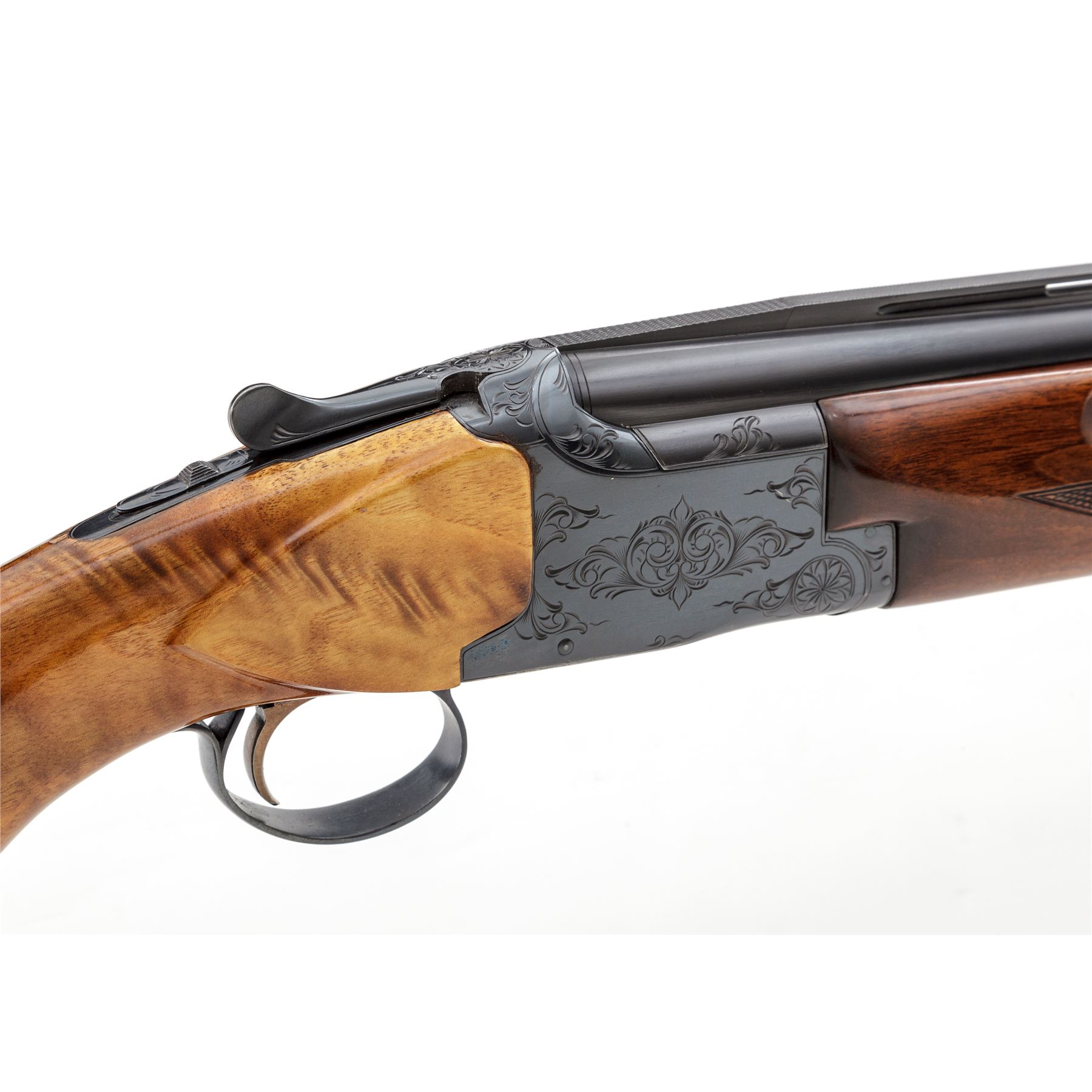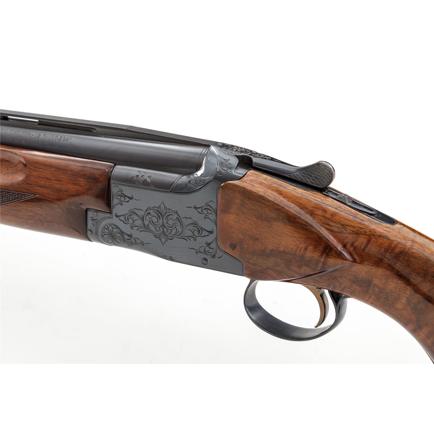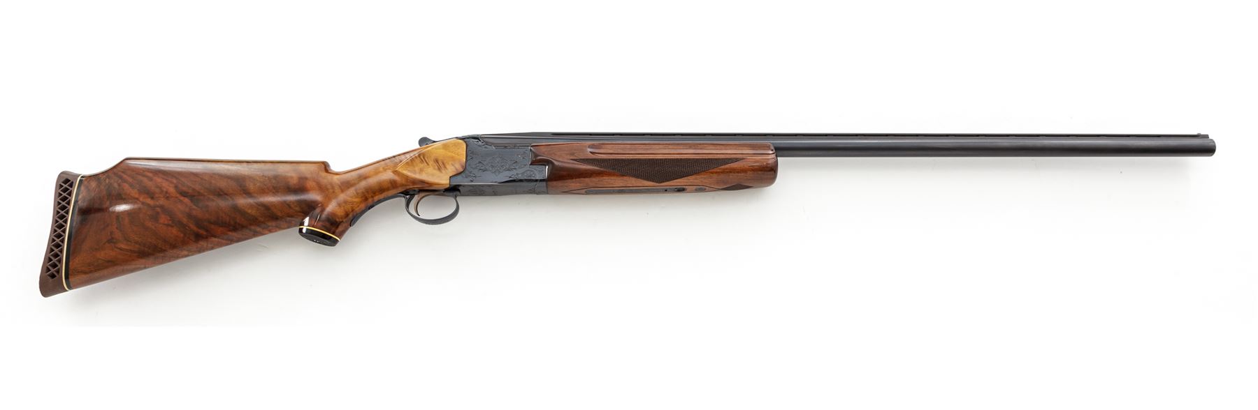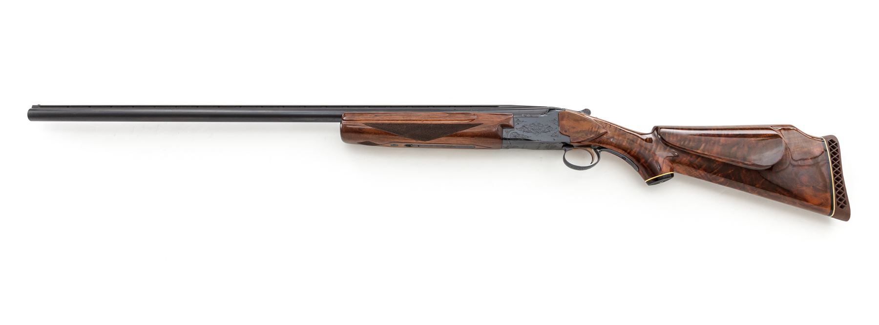 Winchester Model 101 Single Barrel Trap Gun, #108667. 12 ga. 32'' vent rib barrel has a 2-3/4'' chamber and is choked Full. Model 101 over/under action is modified to fire top barrel only, but includes non-auto safety and auto ejector. Receiver has standard Grade 1 engraving, and forend is standard model beavertail. Buttstock has been replaced by a custom Monte Carlo pistol-grip stock of Exhibition Grade walnut, with no checkering, Whiteline grip cap and Pachmayr Trap butt pad. Stock dimensions are 15-1/8''x1-1/4''x1-3/4''. Mfg'd 1967 in Japan. Condition is excellent with new buttstock and possible reblue to receiver. Action functions correctly and locks tight. Bore is bright. Est.: $500-$750. (C&R)