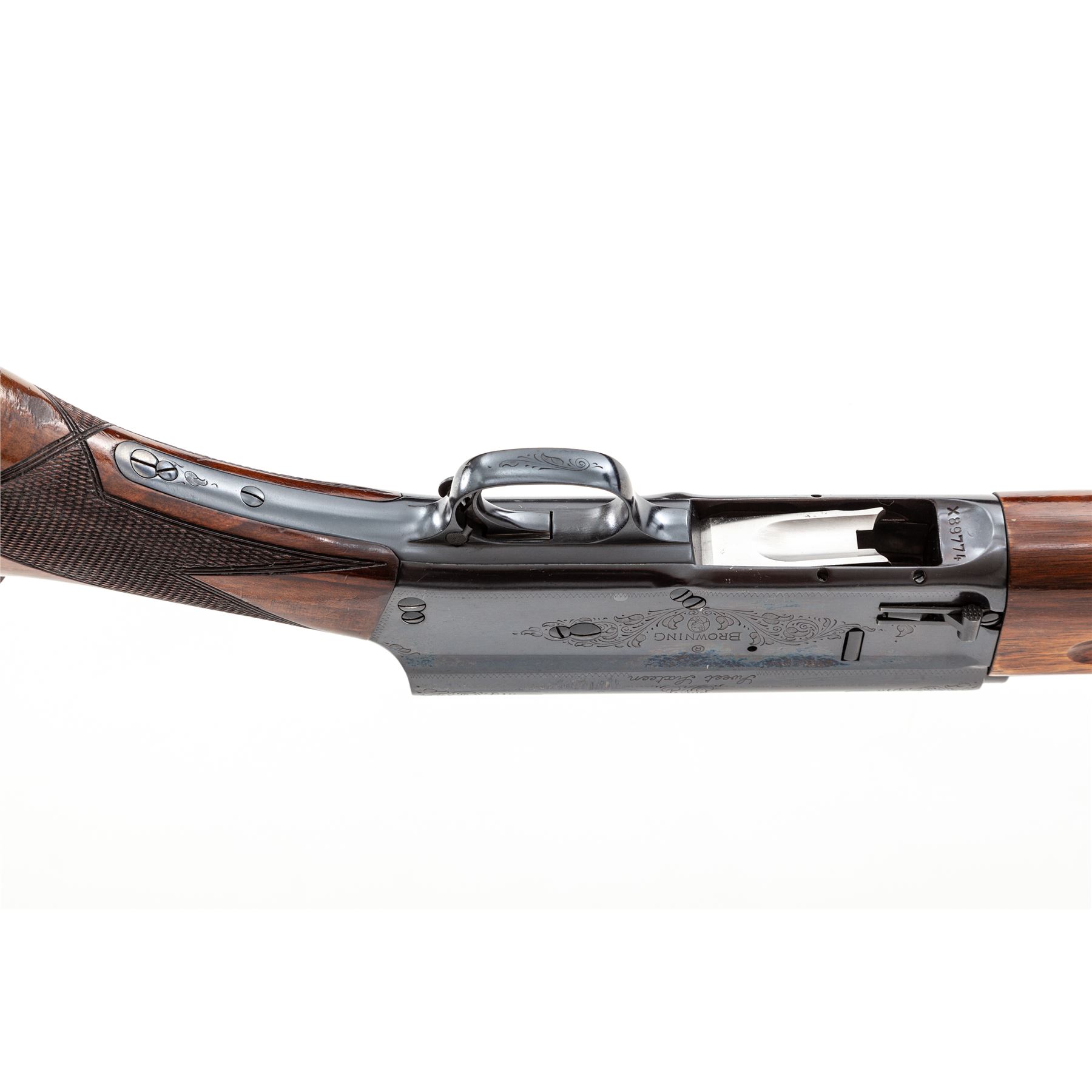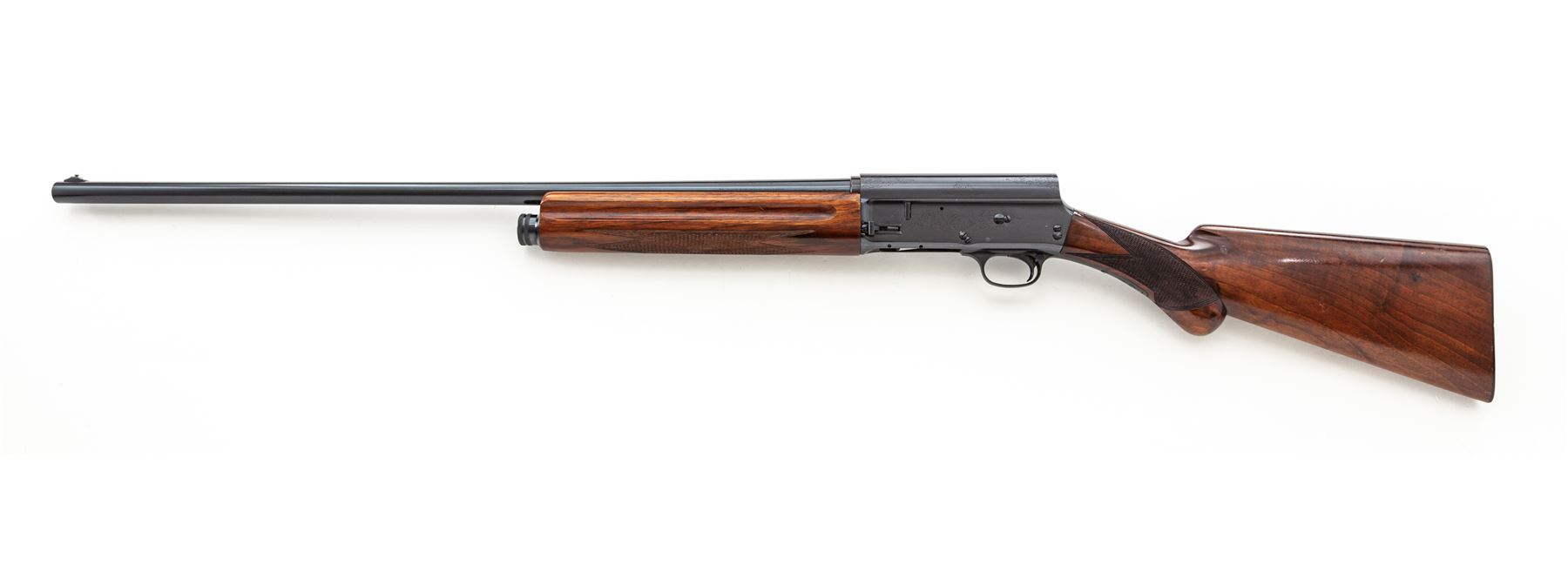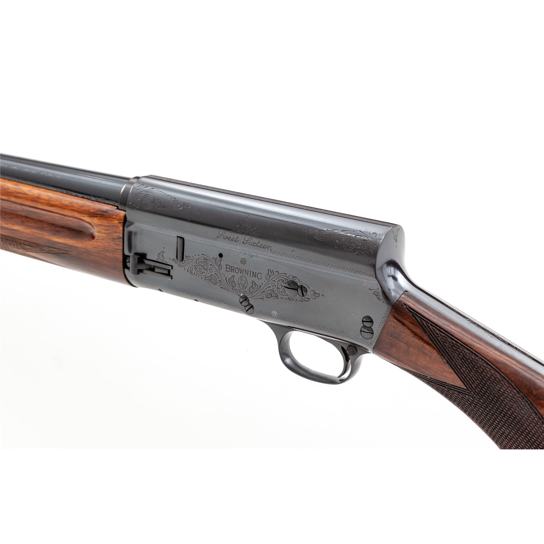 Browning ''Sweet 16'' Model Auto-5 Semi-Automatic Shotgun, #X89774. 16 ga. 30'' plain barrel has a 2-3/4'' chamber and is choked Mod. The action is standard Auto-5, with later crossbolt safety and magazine release. The slender forend and round knob pistol-grip buttstock are dark walnut with nice grain; original FN/Browning automatic buttplate is in place. Mfg'd 1953. Condition is very good to near excellent as apparently refinished. Receiver and barrel are a very deep blue; action is tight and snaps shut; wood may be original but has many small handling marks. Est.: $750-$1,000. (C&R)