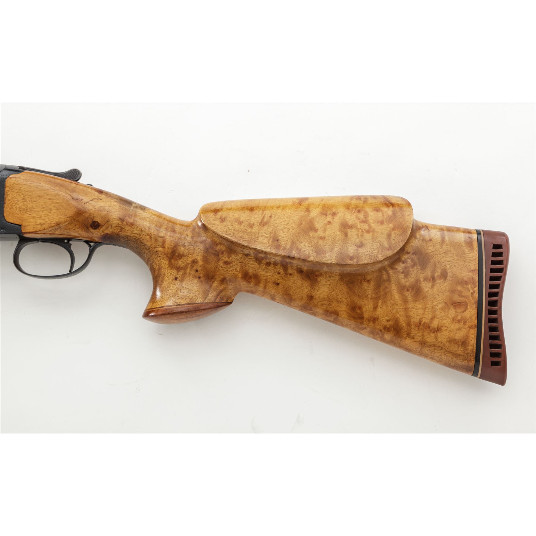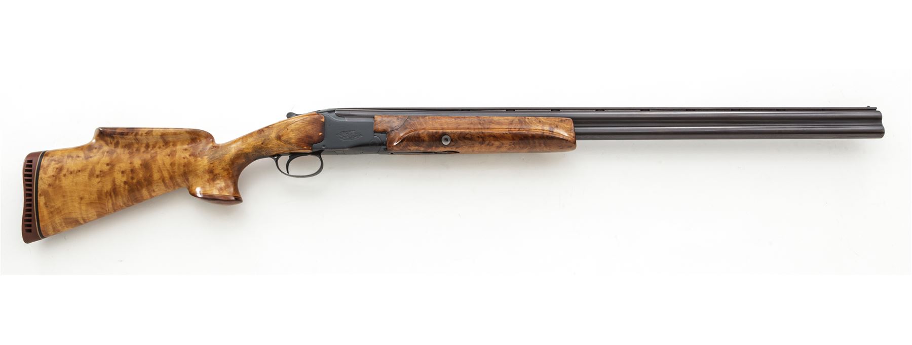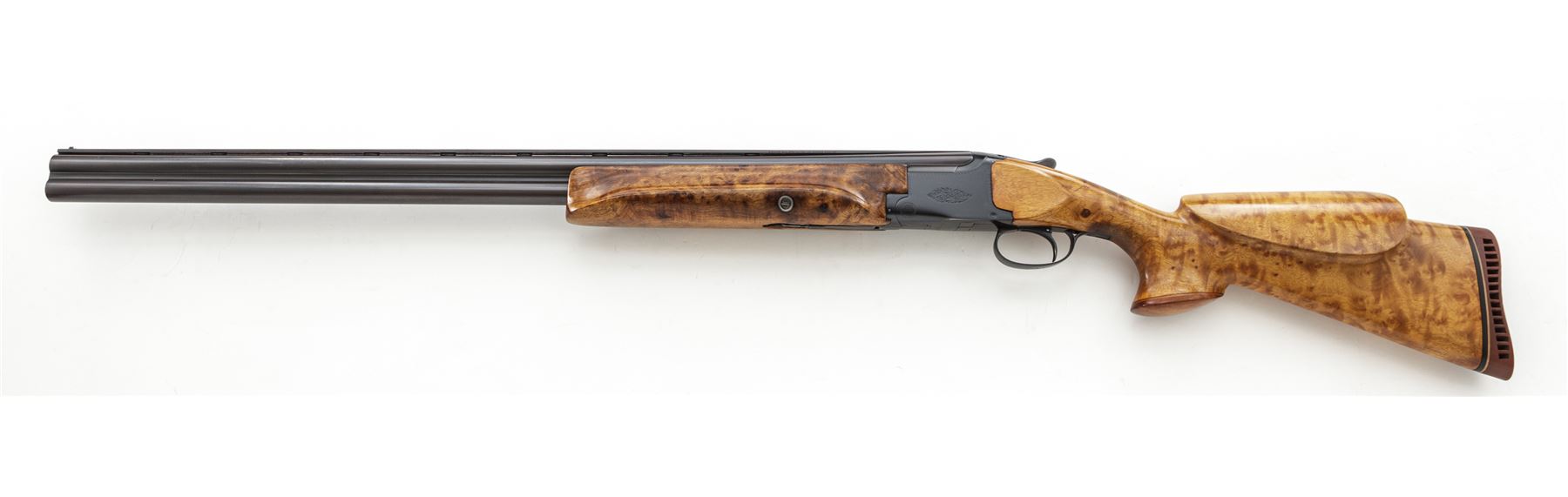 Browning Superposed Over/Under Shotgun, with custom re-stocking, #20262. 12 ga. 30'' barrels have 2-3/4'' chambers, a vent rib marked ''Simmons Gun Specialties Inc. Kansas City, MO.'', and choked IM./Full. The Browning boxlock action features a single selective trigger, non-auto safety and auto ejectors. The birdseye maple full beavertail forend and Tyrolean cheekpiece buttstock have no checkering but a full pistol grip with custom wood grip cap, and a Pachmayr Trap recoil pad. Originally mfg'd 1950. Condition is very good as extensively modified. Receiver and barrels appear to have been refinished years ago. Wood was crafted for a specific trap shooter; approx. stock dimensions are 14.25''x1.25''x2.50''. There are numerous small handling marks on the wood, but the action still closes tight and functions correctly. Est.: $700-$900. (C&R)