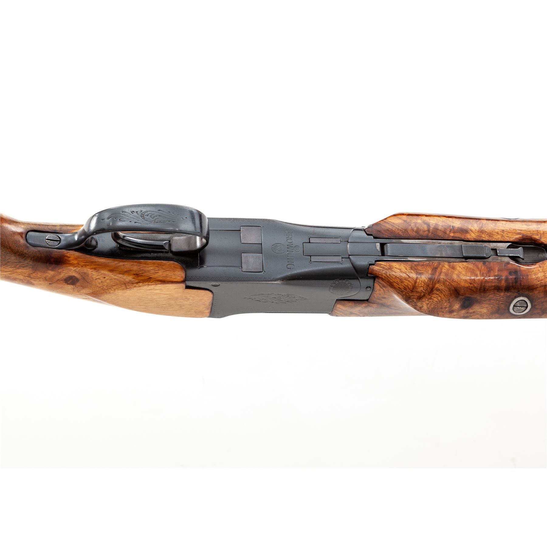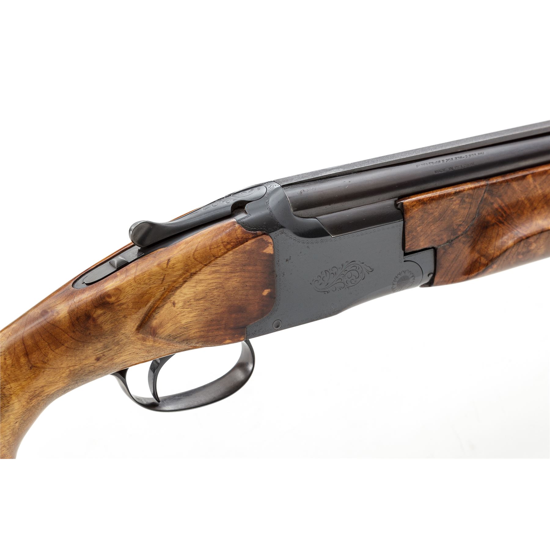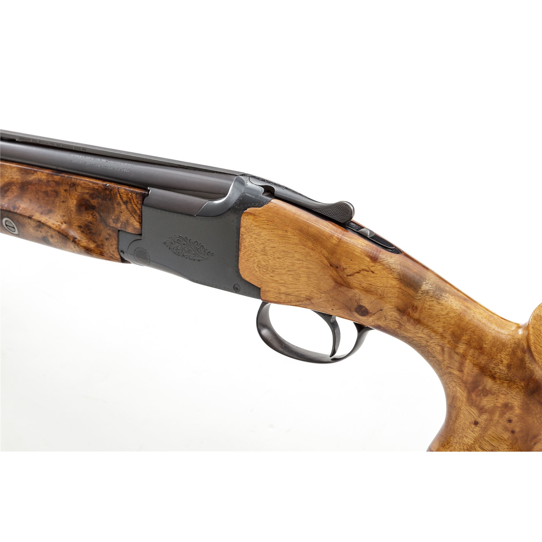 Browning Superposed Over/Under Shotgun, with custom re-stocking, #20262. 12 ga. 30'' barrels have 2-3/4'' chambers, a vent rib marked ''Simmons Gun Specialties Inc. Kansas City, MO.'', and choked IM./Full. The Browning boxlock action features a single selective trigger, non-auto safety and auto ejectors. The birdseye maple full beavertail forend and Tyrolean cheekpiece buttstock have no checkering but a full pistol grip with custom wood grip cap, and a Pachmayr Trap recoil pad. Originally mfg'd 1950. Condition is very good as extensively modified. Receiver and barrels appear to have been refinished years ago. Wood was crafted for a specific trap shooter; approx. stock dimensions are 14.25''x1.25''x2.50''. There are numerous small handling marks on the wood, but the action still closes tight and functions correctly. Est.: $700-$900. (C&R)