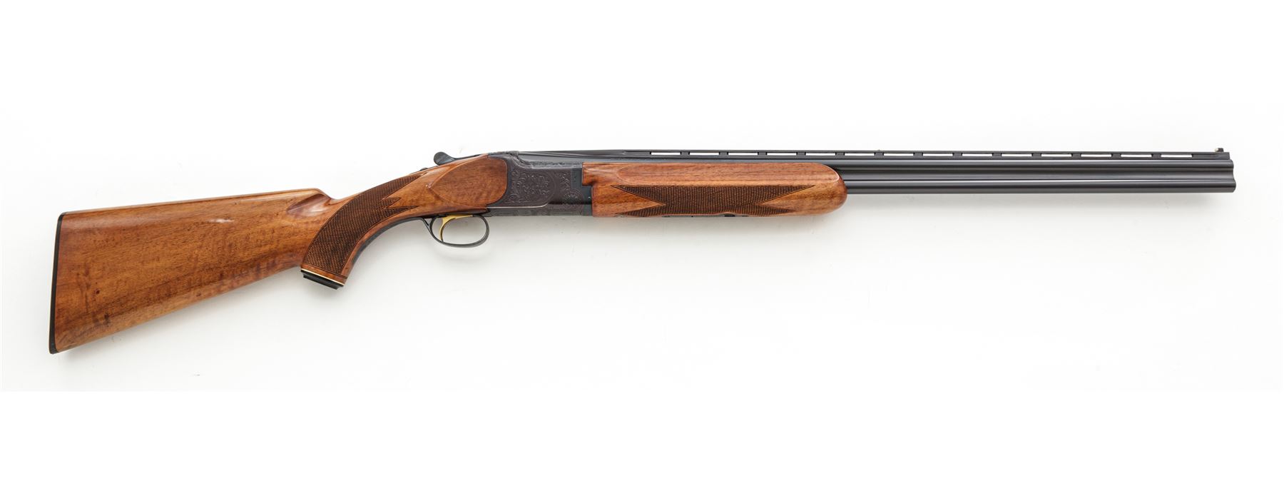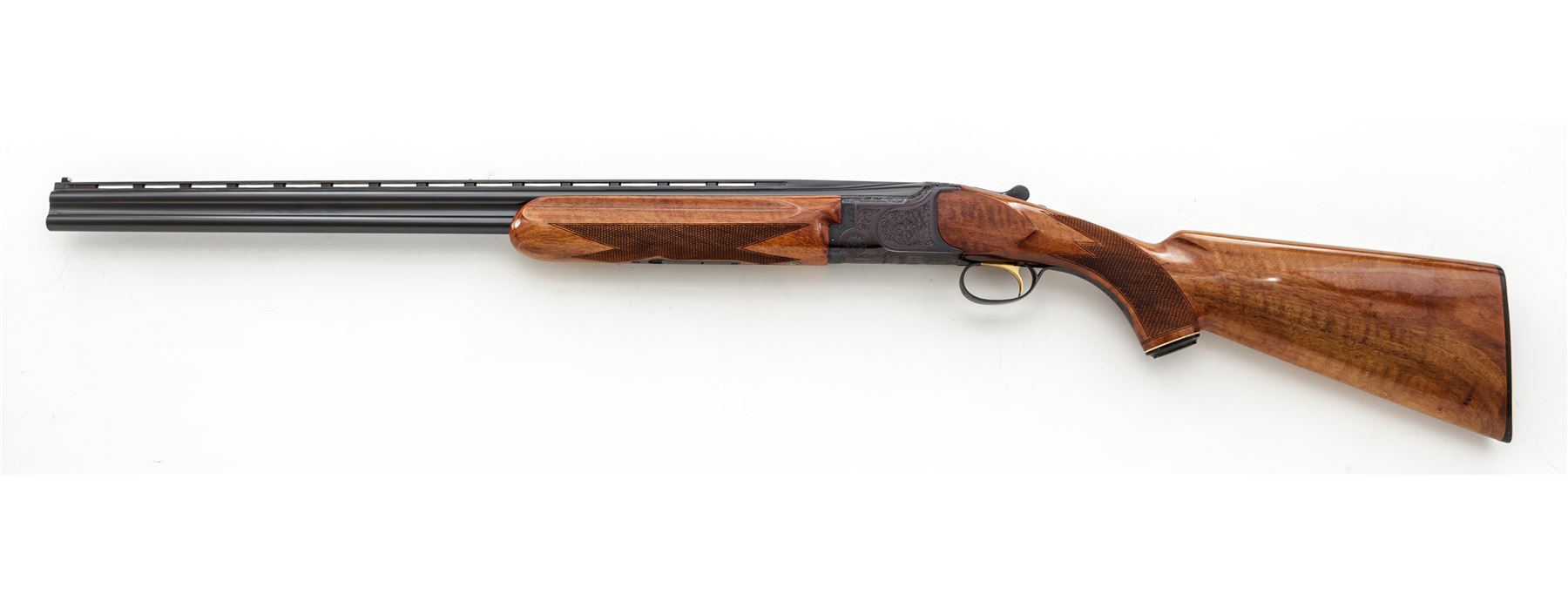 Charles Daly Superior Grade Over/Under Shotgun, #S516529. .410 bore 26'' vent rib barrels have 3'' chambers and are choked Skt/Skt. Boxlock action made by Miroku features single selective trigger, non-auto safety and auto ejectors. Semi-beavertail forend and pistol-grip buttstock are of light walnut with nice figure featuring very good checkering, Whiteline grip cap and original Miroku plastic buttplate. Receiver has almost complete coverage of rose and scroll engraving. Mfg'd approx. 1970. Condition is excellent with very few marks to wood, bright bores, and little wear to action, which functions correctly. Est.: $800-$1,200. (Modern)