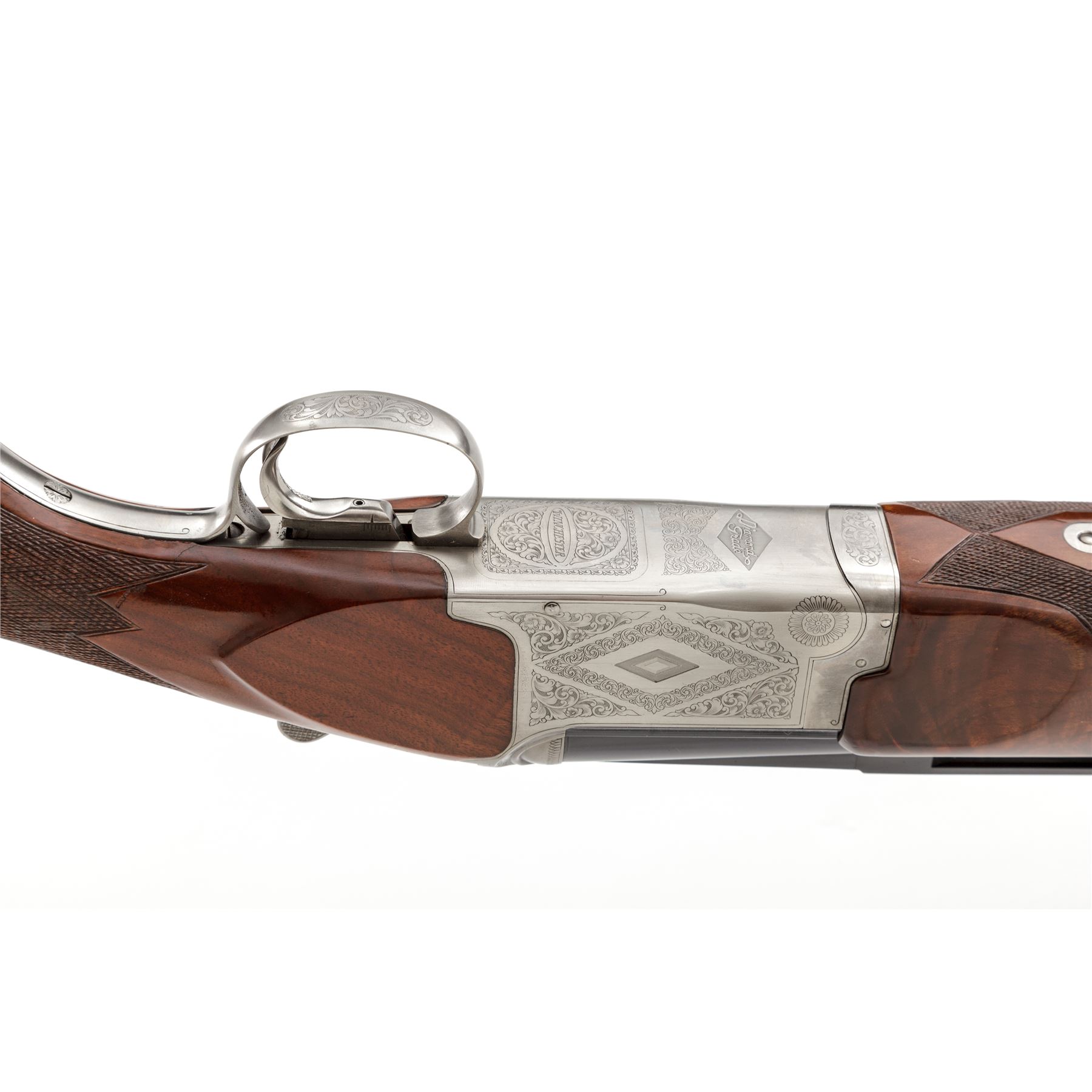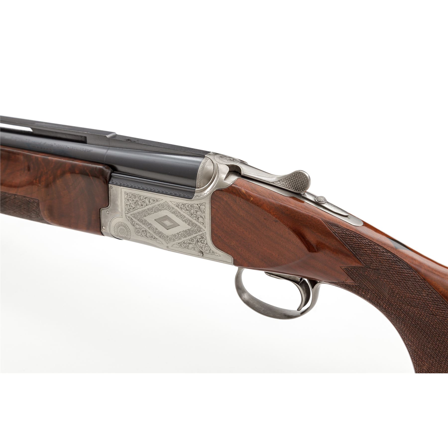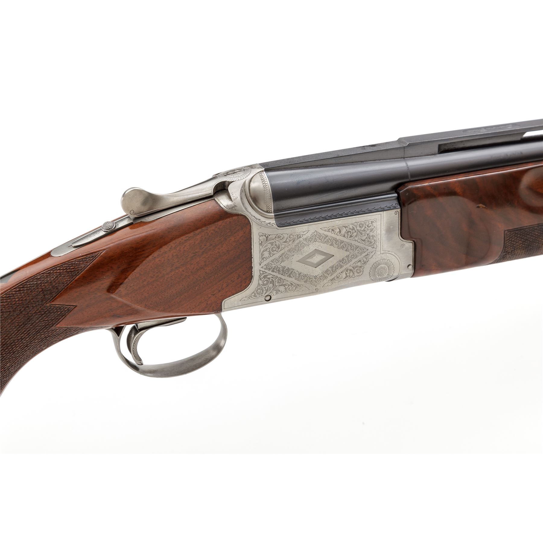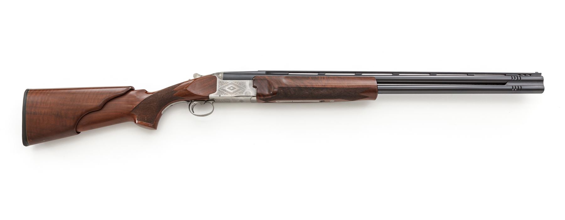 Winchester Model 101 Diamond Grade Four-Gauge Skeet Set, #DG548025E. 12 ga. over/under shotgun is fitted with four pairs of 27.5'' vent rib barrels: 12 ga., 20 ga. and 28 ga. with 2-3/4'' chambers; and .410 bore with 2-1/2'' chamber, all choked SK/SK; 12 ga. and 20 ga. barrels are ported. 101 action features adjustable single selective trigger, non-auto safety, and auto ejectors. Satin-finished receiver is engraved with distinctive Diamond Grade pattern, with black diamond inlays on the pistol grip. Beavertail forearm and buttstock are higher grade walnut, and buttstock has been modified to add a Hydrocoil recoil absorbing feature. All components are contained in original Diamond Grade fitted case with outer canvas cover. Mfg'd approx. 1986. Condition is near excellent with few small handling marks to wood and some wear to action, which functions correctly; bores are bright. There is a 1/4" crack on left side of pistol grip beginning near rear of triggerguard and ending at checkering. Est.: $2,750-$3,500. (Modern)