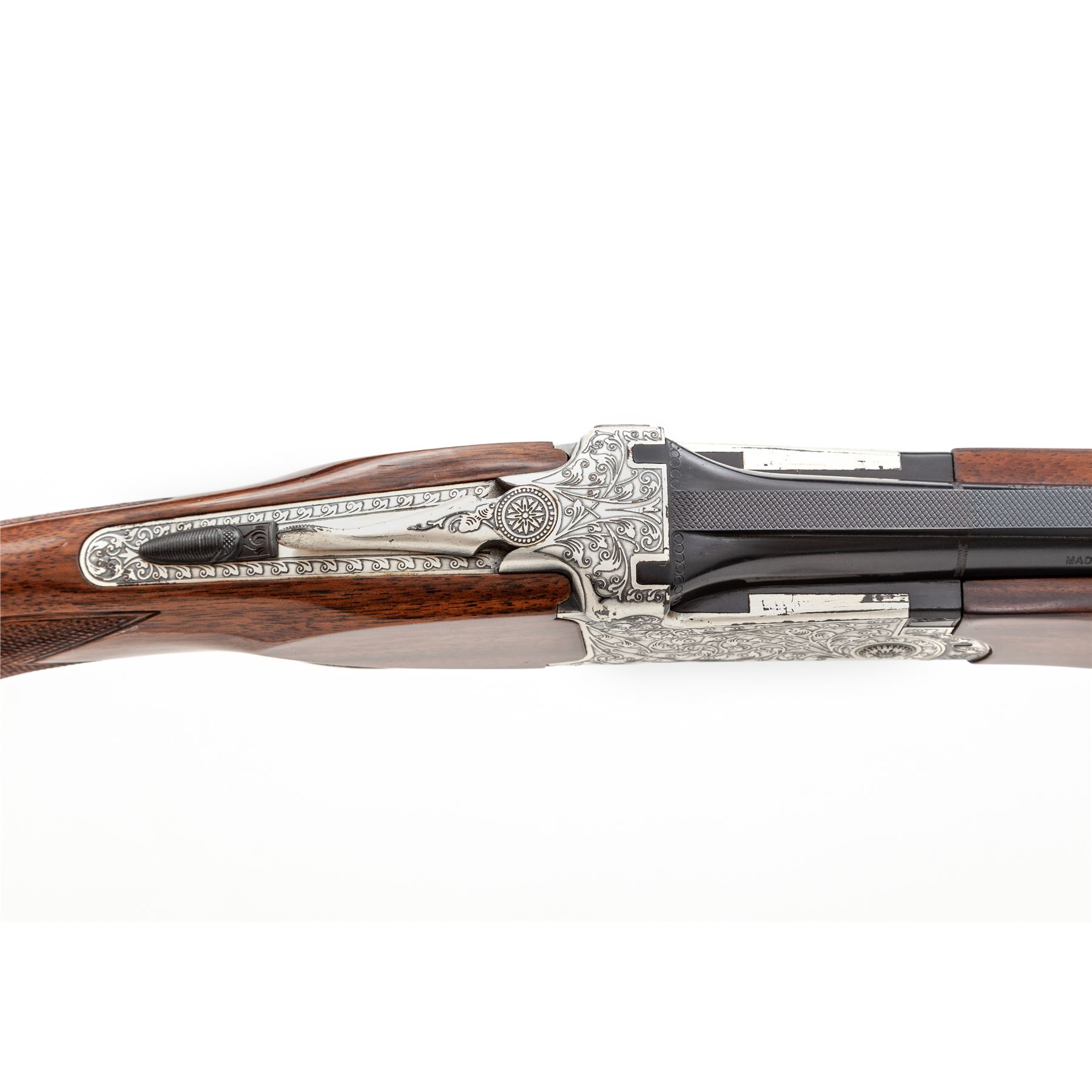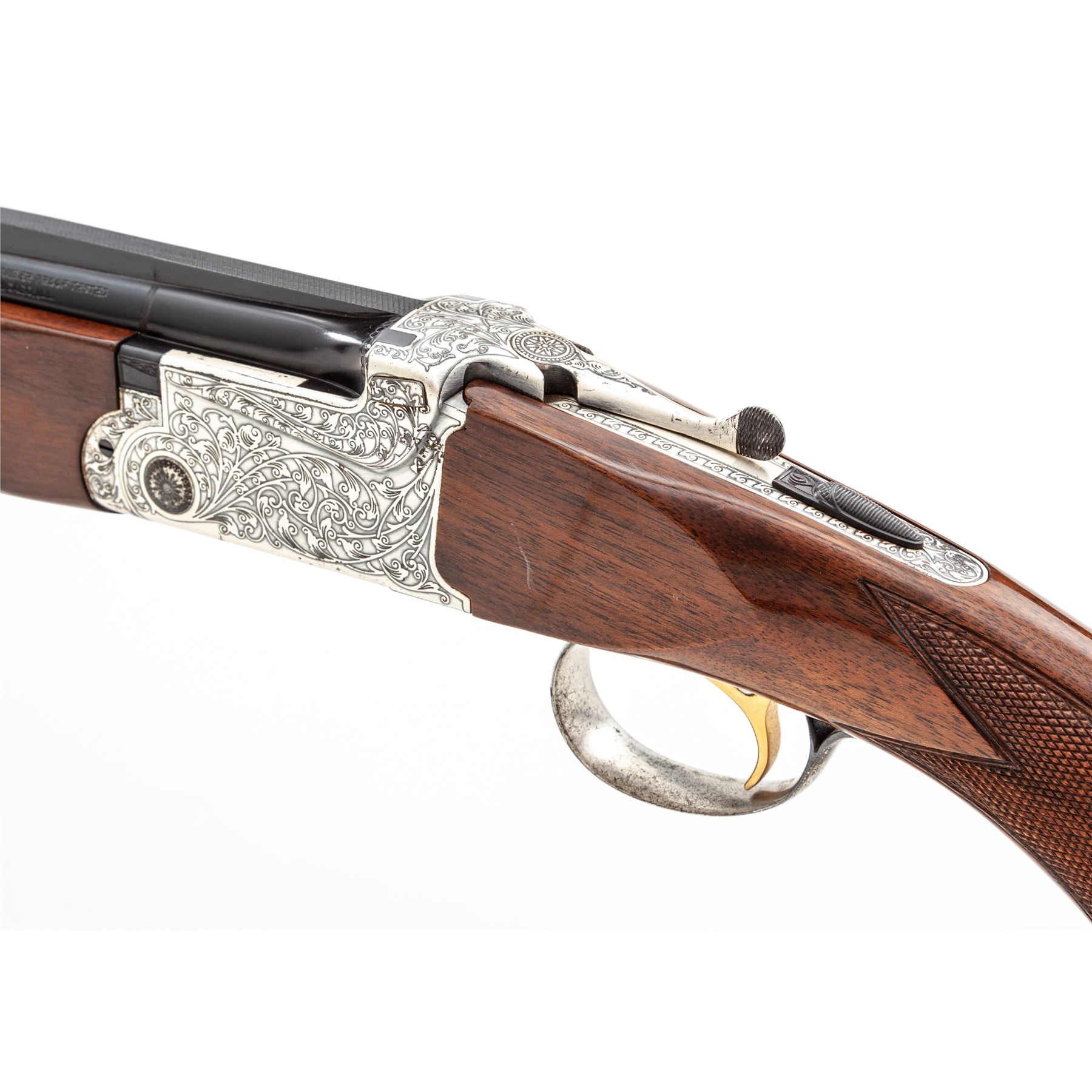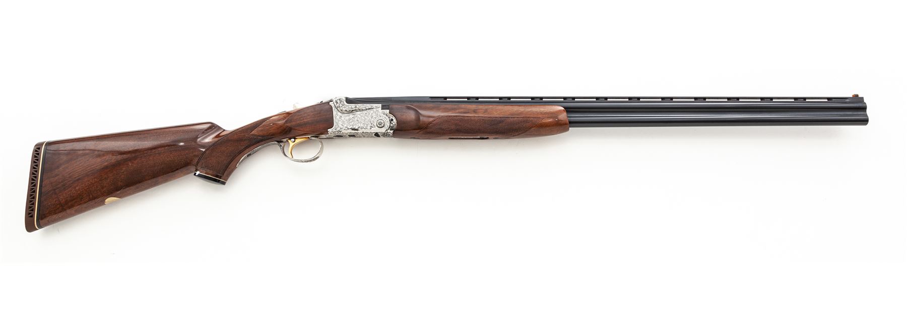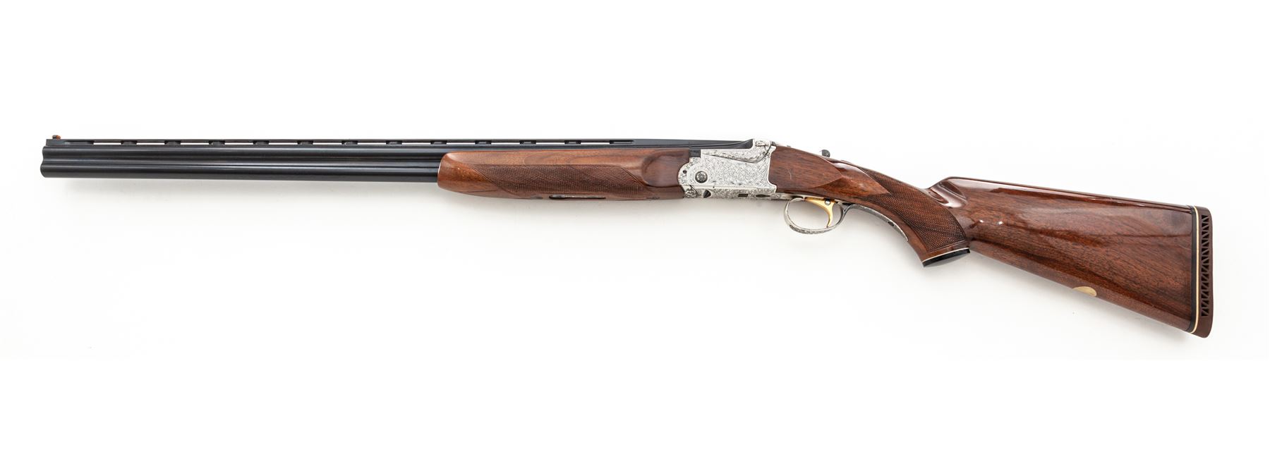 SKB Model 600 Field Grade Over/Under Shotgun, #S6609334. 28 ga. 28'' vent rib barrels have 2-3/4'' chambers and are choked Mod./Full. Action lockup is by Kersten crossbolt and features single selective trigger, non-auto safety and auto ejectors. Receiver, triggerguard and tangs are silver plated and engraved with a nice floral pattern. The full forend and pistol-grip buttstock are above-average walnut, with Whiteline grip cap and Pachmayr recoil pad. Mfg'd 1970s. Condition is excellent functionally, but the plating on carry and wear areas of the receiver is starting to delaminate. Numerous small handling marks on buttstock; action still locks very tight and functions correctly; bores are bright. Est.: $700-$900. (Modern)