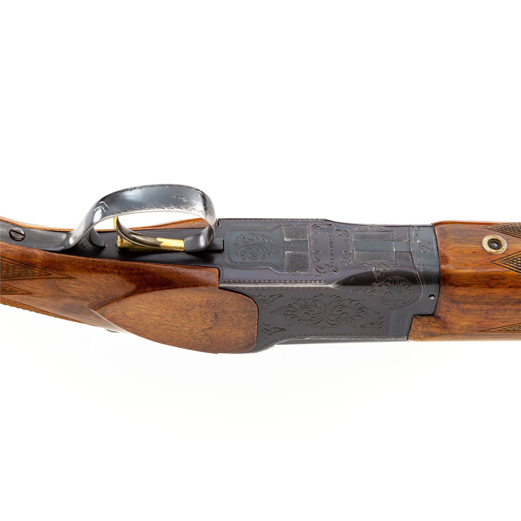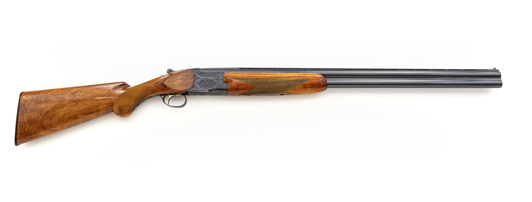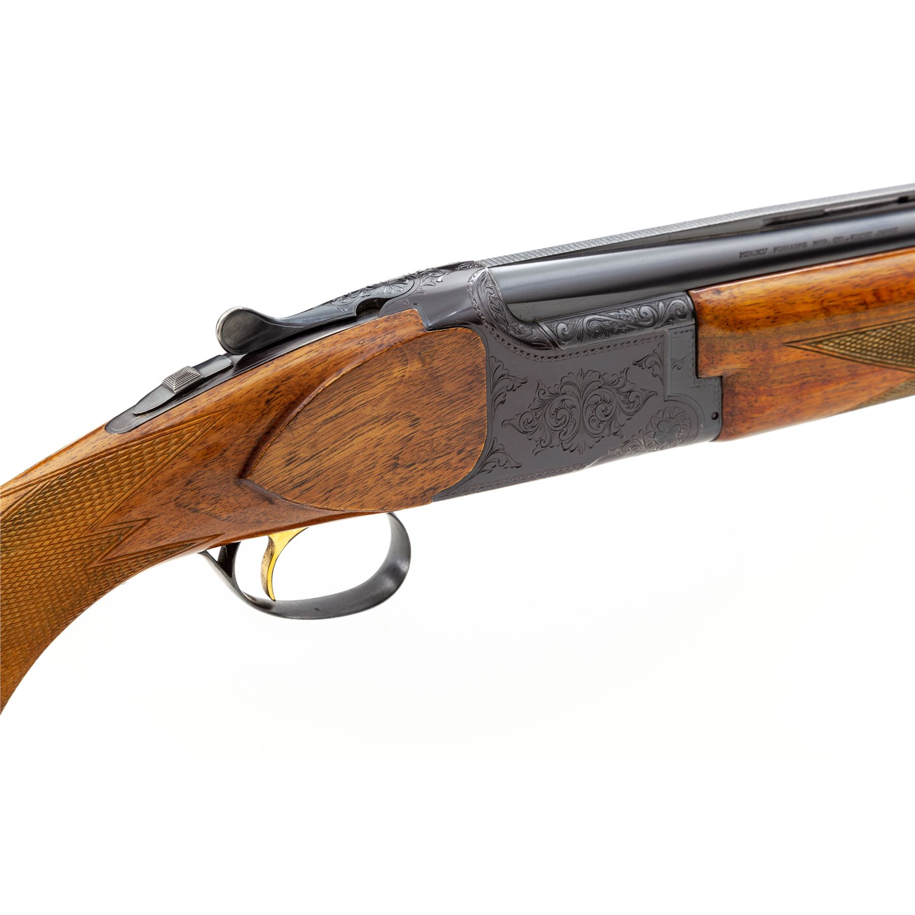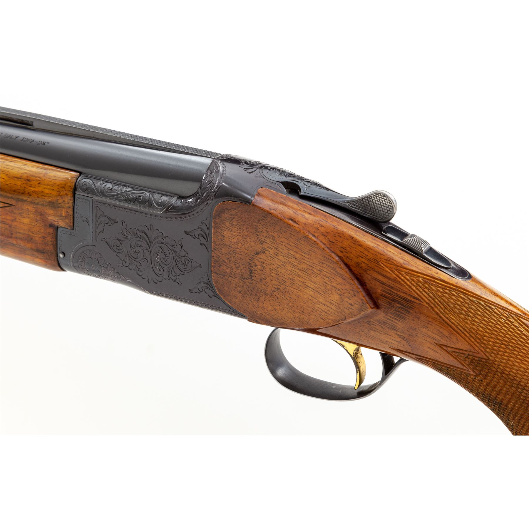 Charles Daly Field Grade Over/Under Shotgun, #386731. 12 ga. 28'' vent rib barrels have 2-3/4'' chambers and are choked IM/Full. Boxlock action is similar to a Browning Citori and features a single selective trigger, non-auto safety, and selective ejectors. Receiver is nicely engraved with scroll patterns, and the walnut slender forend and round-knob buttstock are nicely checkered; the original buttplate is present. Mfg'd in Japan by Miroku for Daly approx. 1970. Condition is excellent externally, with minor impressions to the wood. Hammer for the top barrel is inoperative and requires repair. Est.: $500-$700. (Modern)