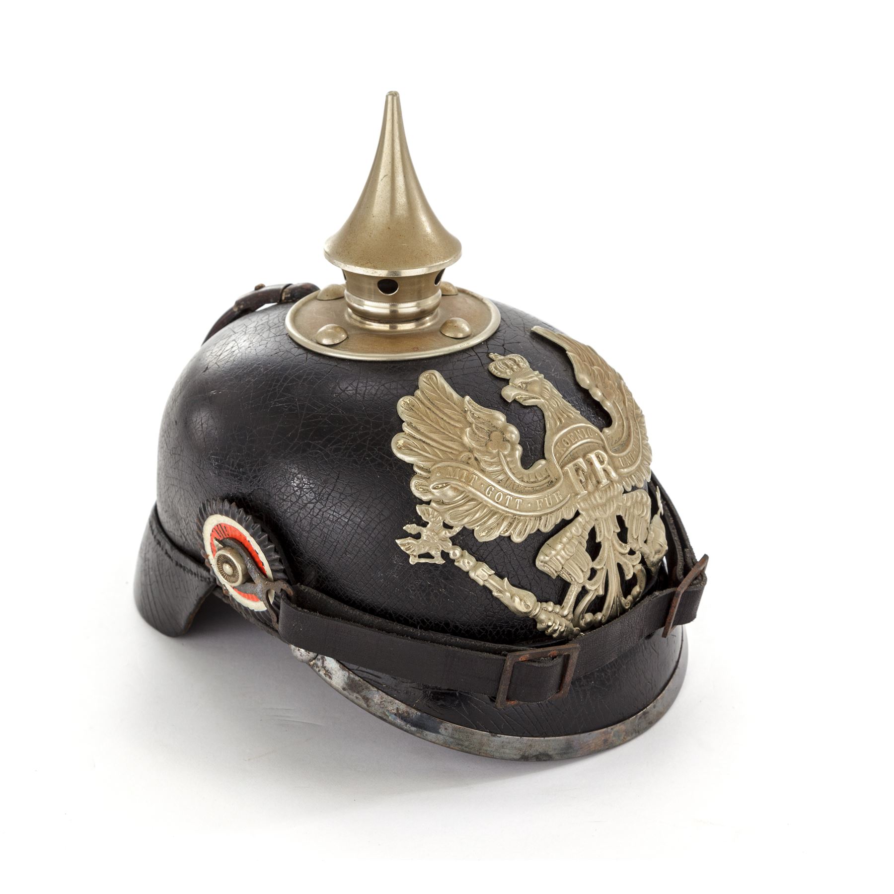 WW1 Era German/Prussian Enlisted Pioneer Pickelhaube Spiked Helmet, with silver-colored trim. Black patent leather body with front and rear visors. Metal trim on this helmet is a silver finish for Pioneer troops. Front visor edge is covered with a silver-colored band. Prussian eagle front plate is attached with metal loops and leather strips, there are no extra holes in the front body. Chinstrap is leather with metal buckles. Enlisted cockades are the tri-color German, and black and white Prussian type. Silver-colored spike base is round with round rivets for attachment. Spike is silver colored with ventilation holes around the perimeter. Silver-colored backstrap band has a sliding ventilation cover at the top. Black thin leather lining has nine fingers. There are faint regimental markings stamped into the inside of the rear visor that read ''BA. XV 1916'' and ''J.R. 18?''. This type of helmet was used from the 1890's thru WW1. Condition is good with crazing overall. Outer surface of the leather body and visors with some minor losses to the finish in the rear and sides. Lining has cracks and edgewear and is missing the leather thong tie. Silver trim shows a front visor, and backstrap fitting has a dark blue/black/silver patina. Front plate, spike base, and spike have some thinning to the bright silver finish, but do not appear to have been cleaned in some time. Leather chinstrap appears to be a newer replacement and has an aged patina to the metal buckles and attachments. Cockades have wear to the painted finish. Est.: $500-$700.