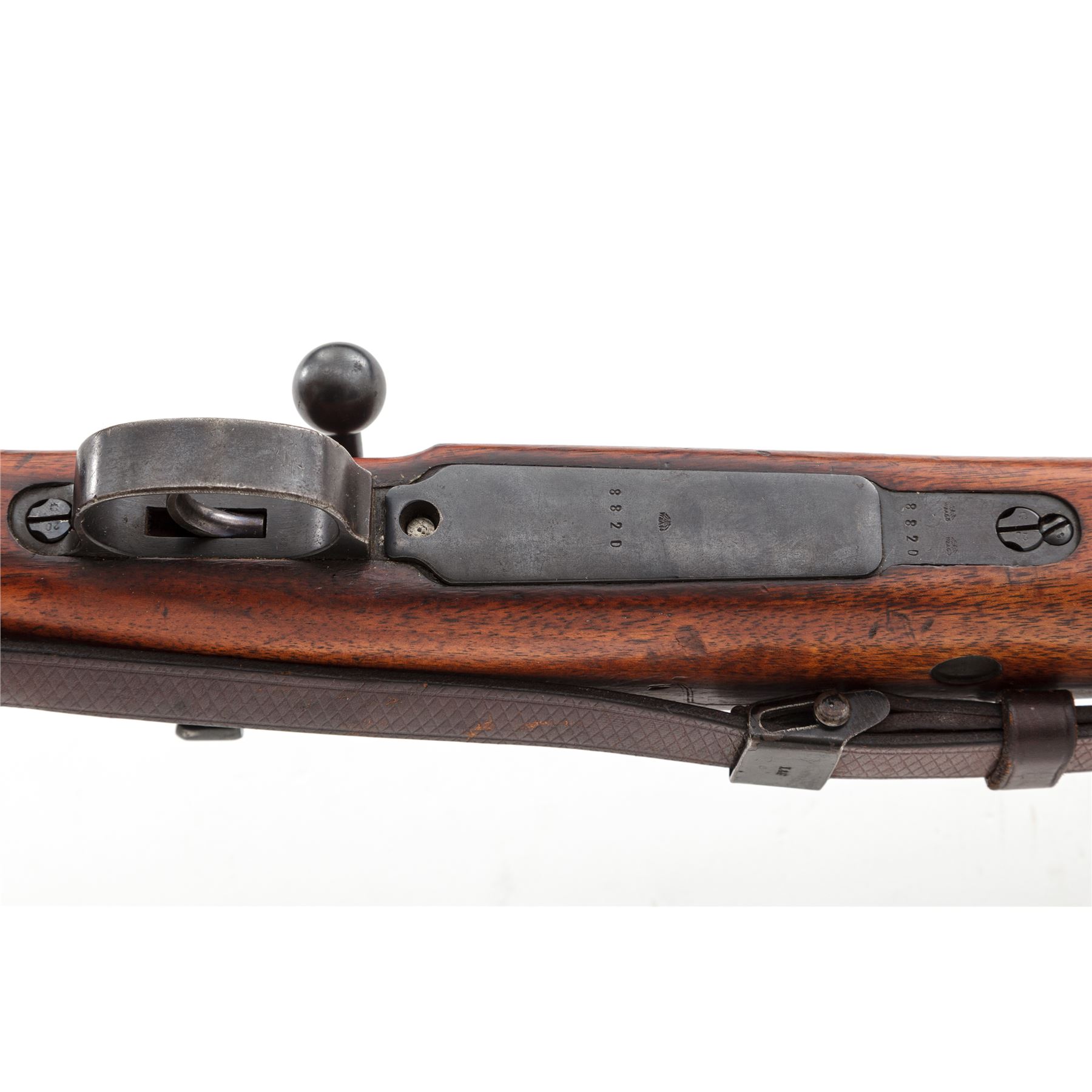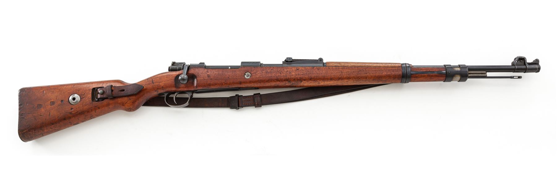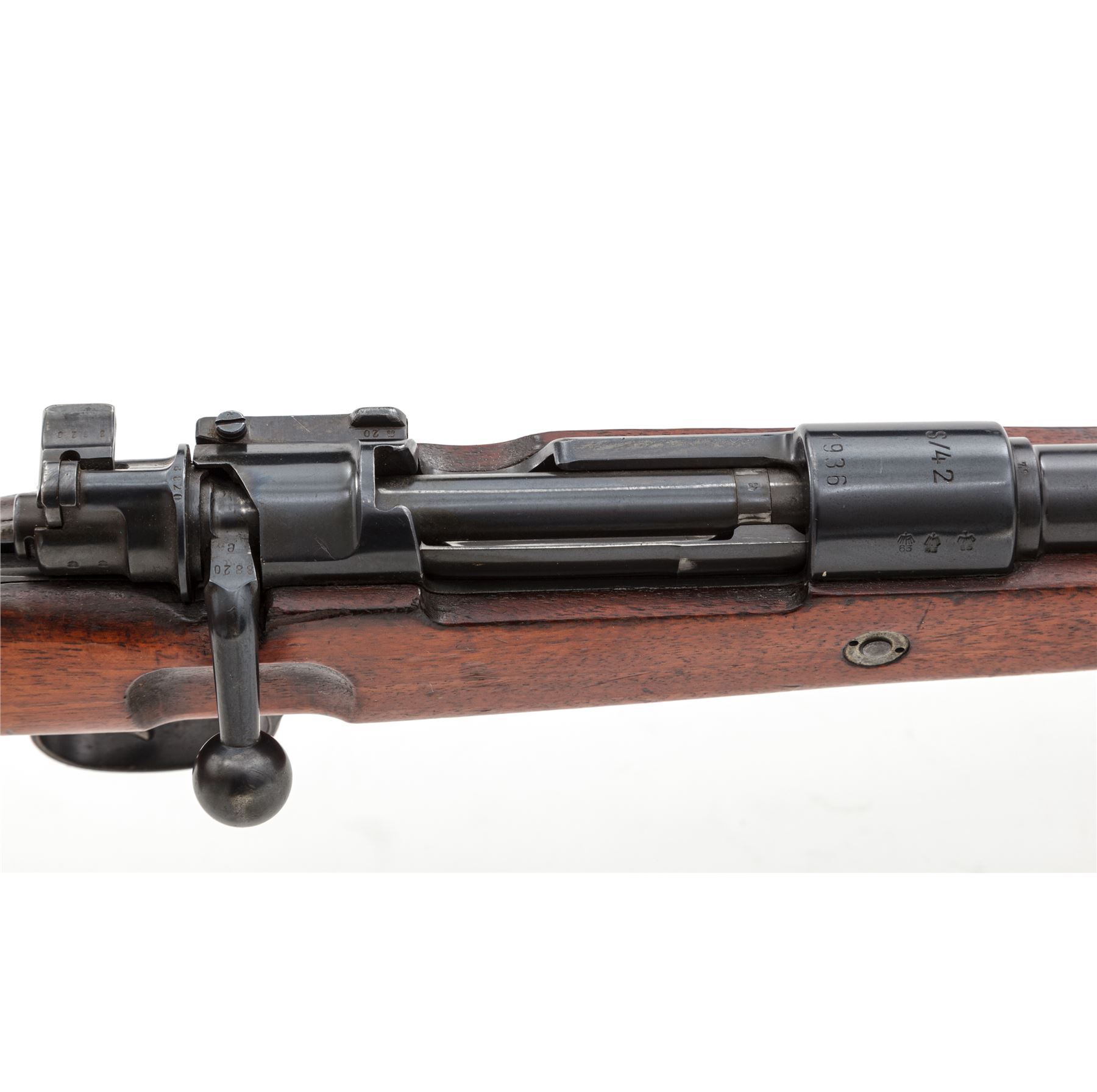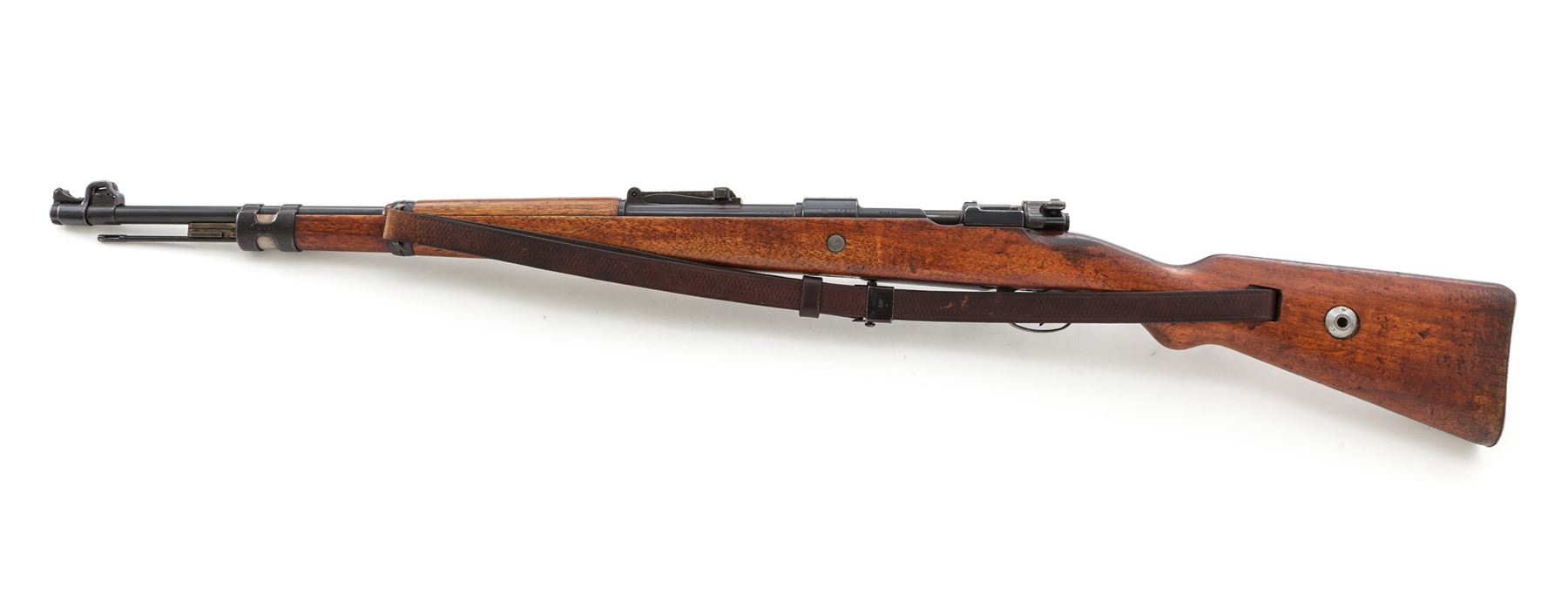 German Kar98k Mauser Bolt Action Rifle, #8820e, 8x57mm cal., 23.6'' barrel, blued finish, hardwood stock, inverted ''V'' front sight and adjustable tangent rear sight. Marked on top of receiver ring ''S/42/1936'', and on left side rail ''Mod.98''. ''WaA 63'' inspection stamps on right side and underside of buttstock. ''Eagle 63'' stamps on right side of receiver and barrel. Matching numbers except cleaning rod (#44 and Eagle 280 inspection stamp). Condition overall is about fine with metal showing over 95% of what appears to be an old re-bluing, with several of the inspection marks partially obliterated by polishing. Stock shows oil darkening behind the action, otherwise fine with an even color and light to moderate dents and scratches. Action is smooth, bright bore is excellent. No visible import stamps. Includes an ''L&F'' marked German leather sling in very good condition and a sight protector in very good condition stamped ''4387''. Est.: $900-$1,200. (C&R)