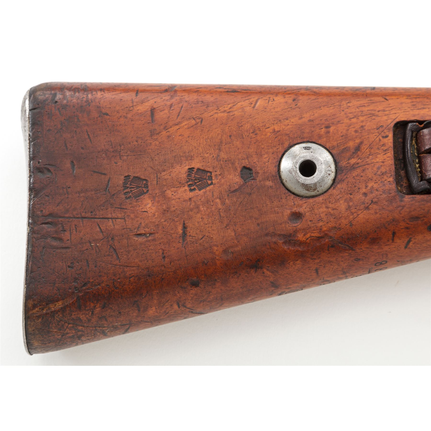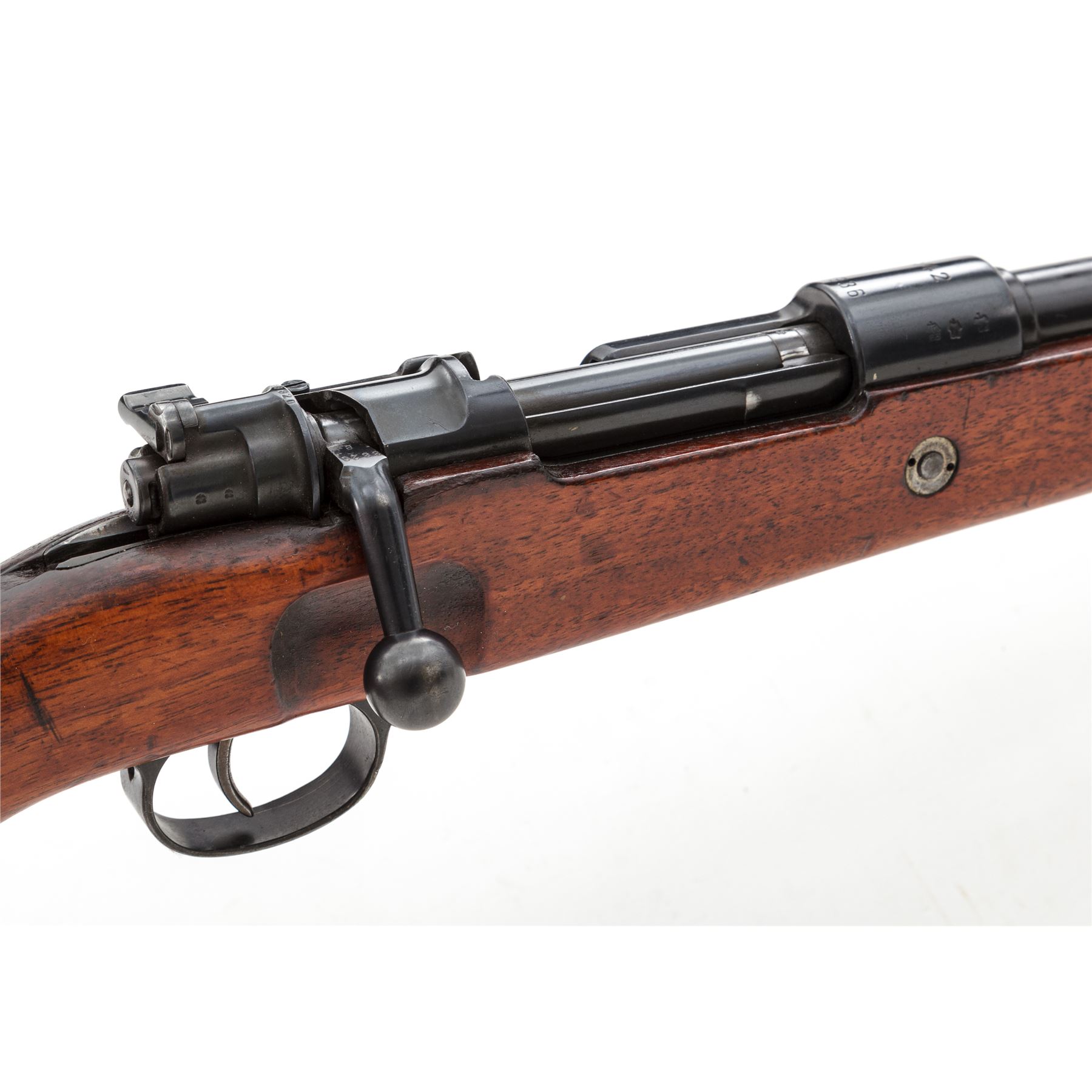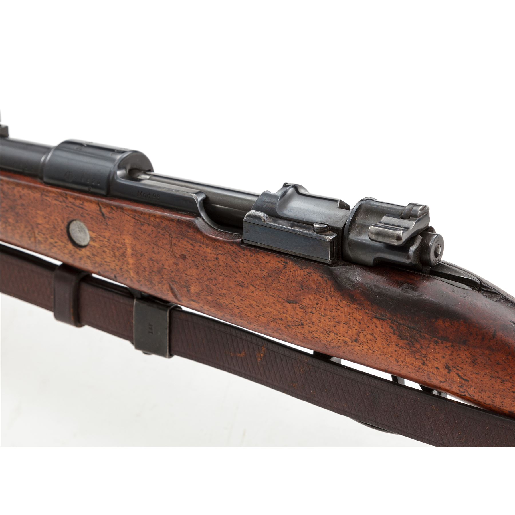 German Kar98k Mauser Bolt Action Rifle, #8820e, 8x57mm cal., 23.6'' barrel, blued finish, hardwood stock, inverted ''V'' front sight and adjustable tangent rear sight. Marked on top of receiver ring ''S/42/1936'', and on left side rail ''Mod.98''. ''WaA 63'' inspection stamps on right side and underside of buttstock. ''Eagle 63'' stamps on right side of receiver and barrel. Matching numbers except cleaning rod (#44 and Eagle 280 inspection stamp). Condition overall is about fine with metal showing over 95% of what appears to be an old re-bluing, with several of the inspection marks partially obliterated by polishing. Stock shows oil darkening behind the action, otherwise fine with an even color and light to moderate dents and scratches. Action is smooth, bright bore is excellent. No visible import stamps. Includes an ''L&F'' marked German leather sling in very good condition and a sight protector in very good condition stamped ''4387''. Est.: $900-$1,200. (C&R)