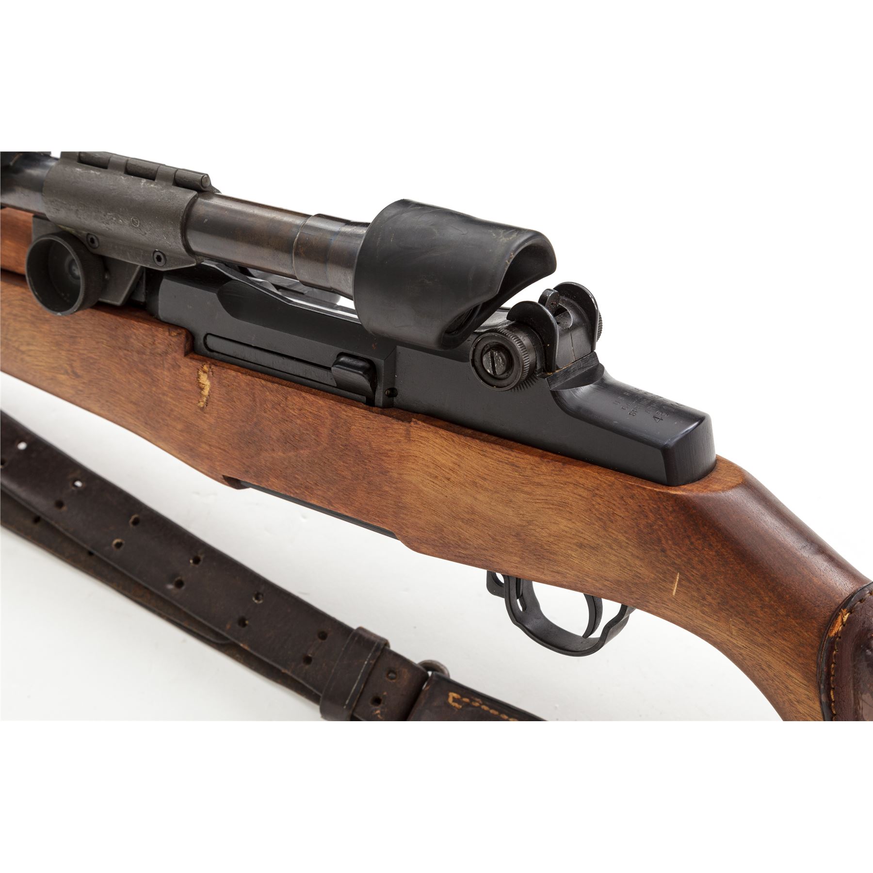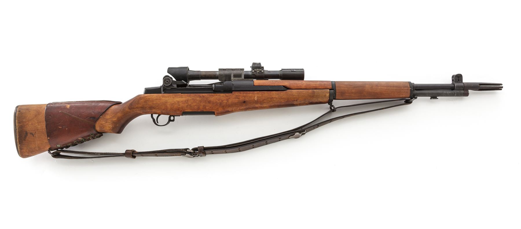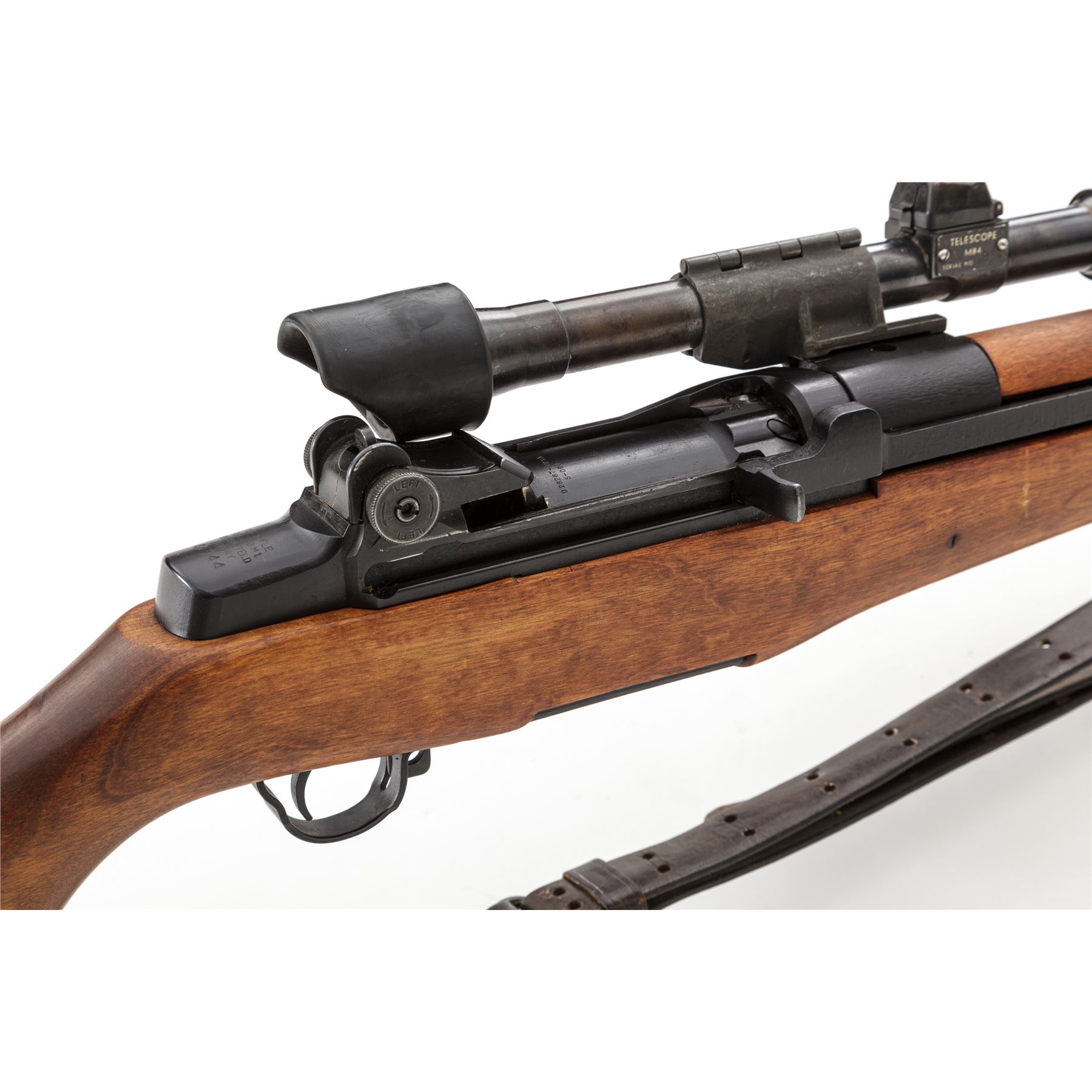 Springfield M1D Garand Semi-Automatic Sniper Rifle, with telescope, #48144, .30-06 cal., 24'' barrel, parkerized finish, walnut stock,, blade front sight with protecting ears and adjustable aperture rear sight. Marked on receiver tang ''U.S.RIFLE CAL..30 M1 SPRINGFIELD ARMORY''. Barrel marked ''S-A-3-52''. Bolt and operating rod marked ''SA''. Trigger housing marked ''WRA''. There is a M37 flash suppressor attached to the muzzle, with U.S M1907 sling, and leather cheekpiece on the buttstock faintly stamped ''2-52''. Condition overall is very good, with over 95% of the black refinish remaining on the metal and the buttplate left bright. The handguards are recent replacements, and the original finish has been removed from the very good condition stock, which has a recent gouge on the left side and overall impressions and scratches. Action is smooth, bright bore is excellent with sharp rifling. No visible import stamps. Scope mount is unmarked with a grey parkerized finsh in very good condition. Scope plate is marked ''TELESCOPE M84 SERIAL NO.10859''. Condition of the scope is very good with both knobs turning freely. Covers are dented and the finish on the tube has thinned and turned to a mottled brown patina with light rust spots. Optics are clear with one small dust speck visible. Est.: $1,800-$2,400. (C&R)