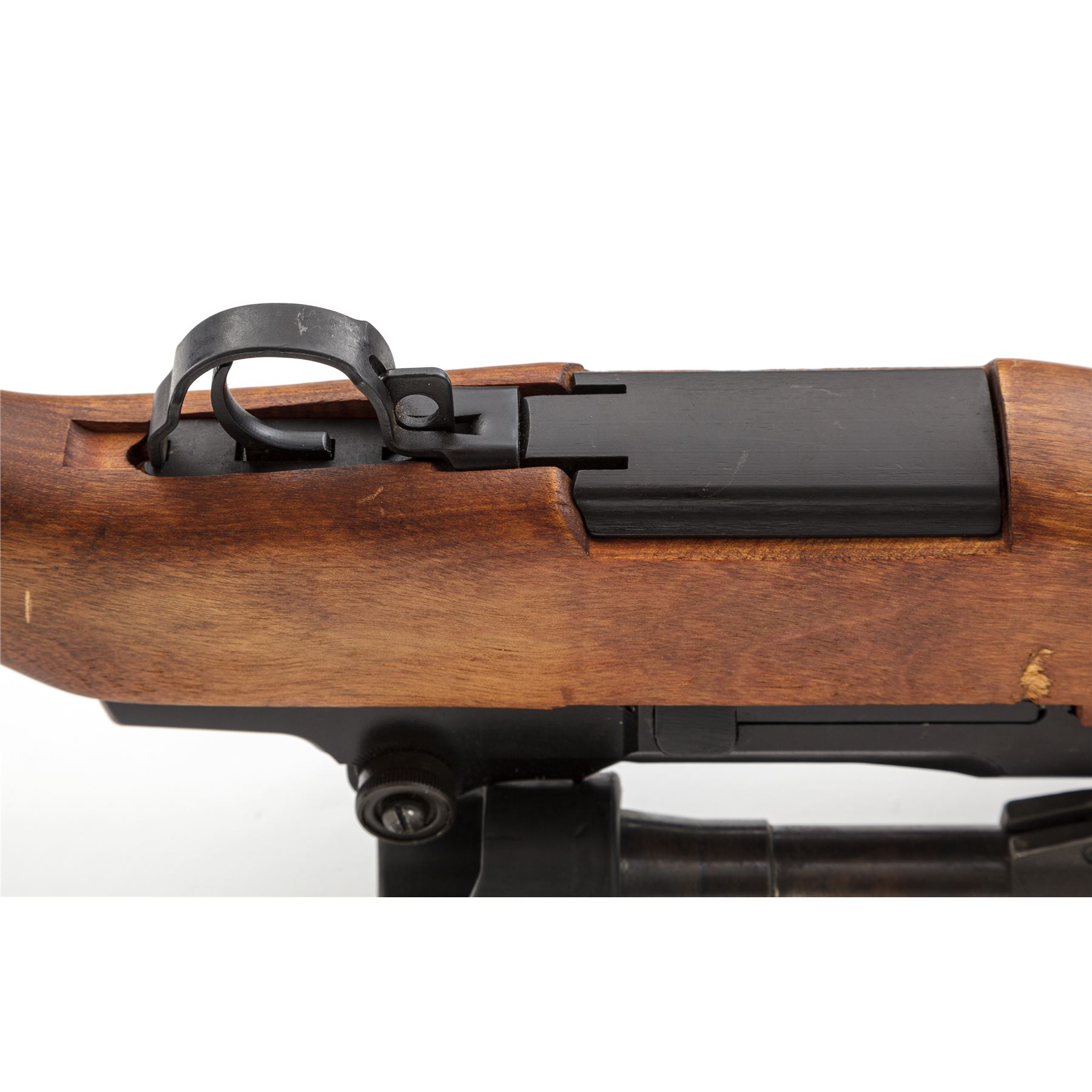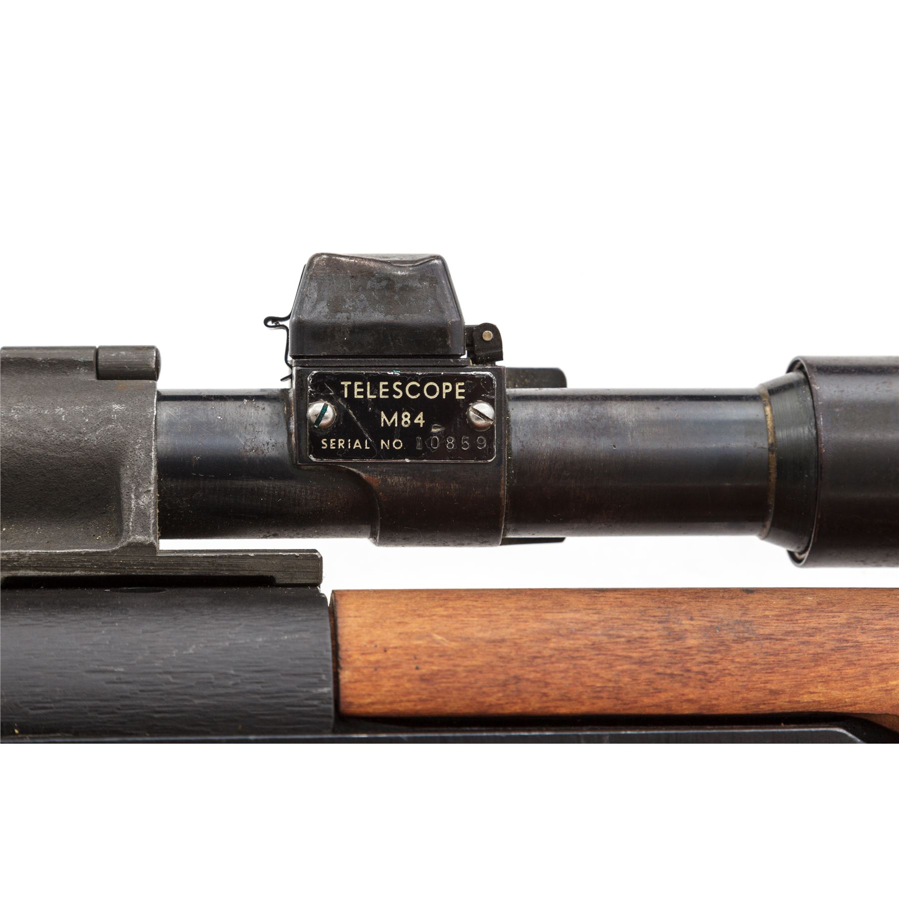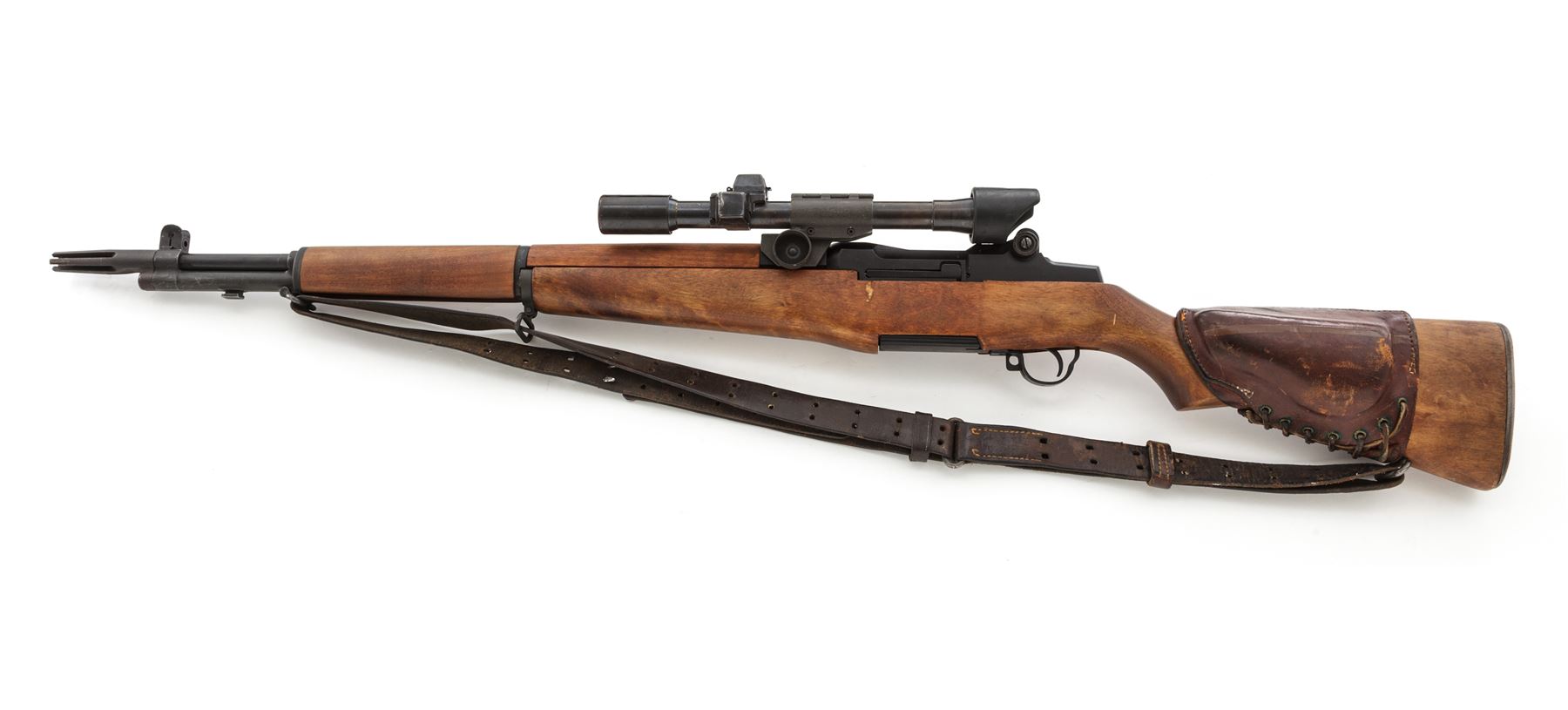 Springfield M1D Garand Semi-Automatic Sniper Rifle, with telescope, #48144, .30-06 cal., 24'' barrel, parkerized finish, walnut stock,, blade front sight with protecting ears and adjustable aperture rear sight. Marked on receiver tang ''U.S.RIFLE CAL..30 M1 SPRINGFIELD ARMORY''. Barrel marked ''S-A-3-52''. Bolt and operating rod marked ''SA''. Trigger housing marked ''WRA''. There is a M37 flash suppressor attached to the muzzle, with U.S M1907 sling, and leather cheekpiece on the buttstock faintly stamped ''2-52''. Condition overall is very good, with over 95% of the black refinish remaining on the metal and the buttplate left bright. The handguards are recent replacements, and the original finish has been removed from the very good condition stock, which has a recent gouge on the left side and overall impressions and scratches. Action is smooth, bright bore is excellent with sharp rifling. No visible import stamps. Scope mount is unmarked with a grey parkerized finsh in very good condition. Scope plate is marked ''TELESCOPE M84 SERIAL NO.10859''. Condition of the scope is very good with both knobs turning freely. Covers are dented and the finish on the tube has thinned and turned to a mottled brown patina with light rust spots. Optics are clear with one small dust speck visible. Est.: $1,800-$2,400. (C&R)