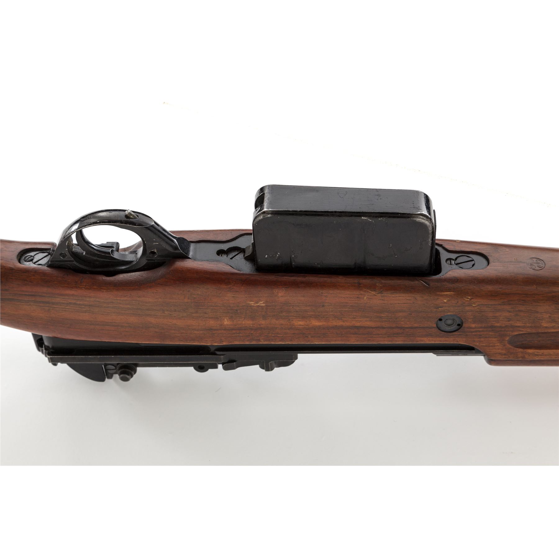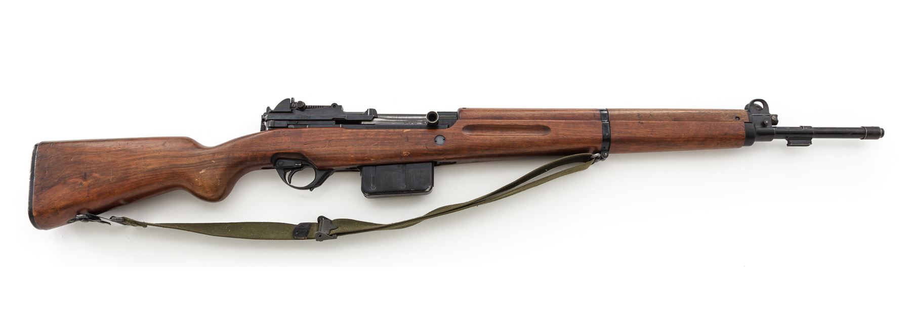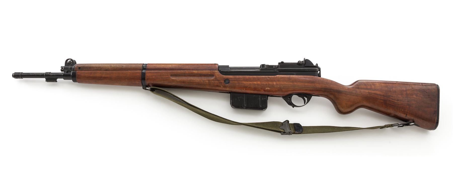 Luxembourg Contract FN49 Semi-Automatic Rifle, #5764, .30-06 cal., 23'' barrel, black painted finish, walnut stock, blade front sight with protecting ears and adjustable sliding ramp rear sight. Marked on top of receiver ''AL'' (Armee Luxembourg), and on right side ''FABRIQUE NATIONALE D'ARMES DE GUERRE_HERSTAL BELGIQUE''. Stamped stock cartouche forward of triggerguard. Bolt and bolt carrier serial numbers match. Number on stock is mismatched. Condition overall is very good with approx. 80% finish remaining on the metal with areas of scratches, especially on the barrel. Wood has overall light to moderate handling marks. Action is smooth, bright bore is excellent. No visible import marks. Includes a green cotton sling marked ''MRT JAN.1953'' in excellent condition. Est.: $1,000-$1,500. (C&R)