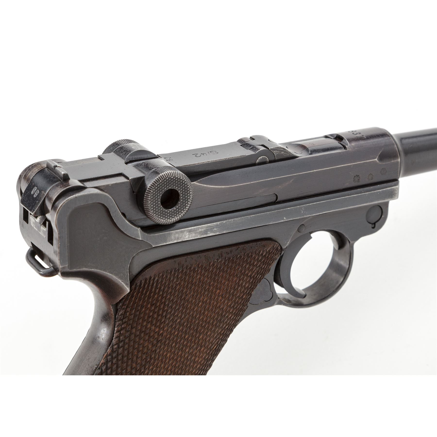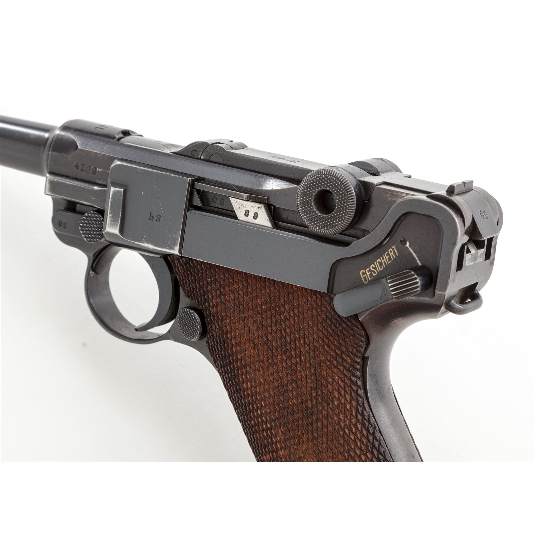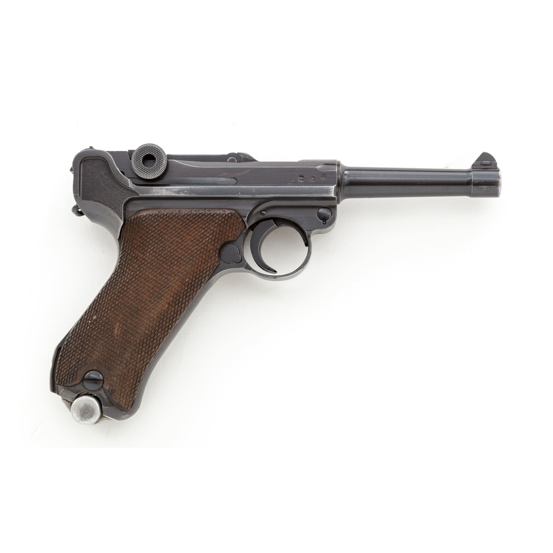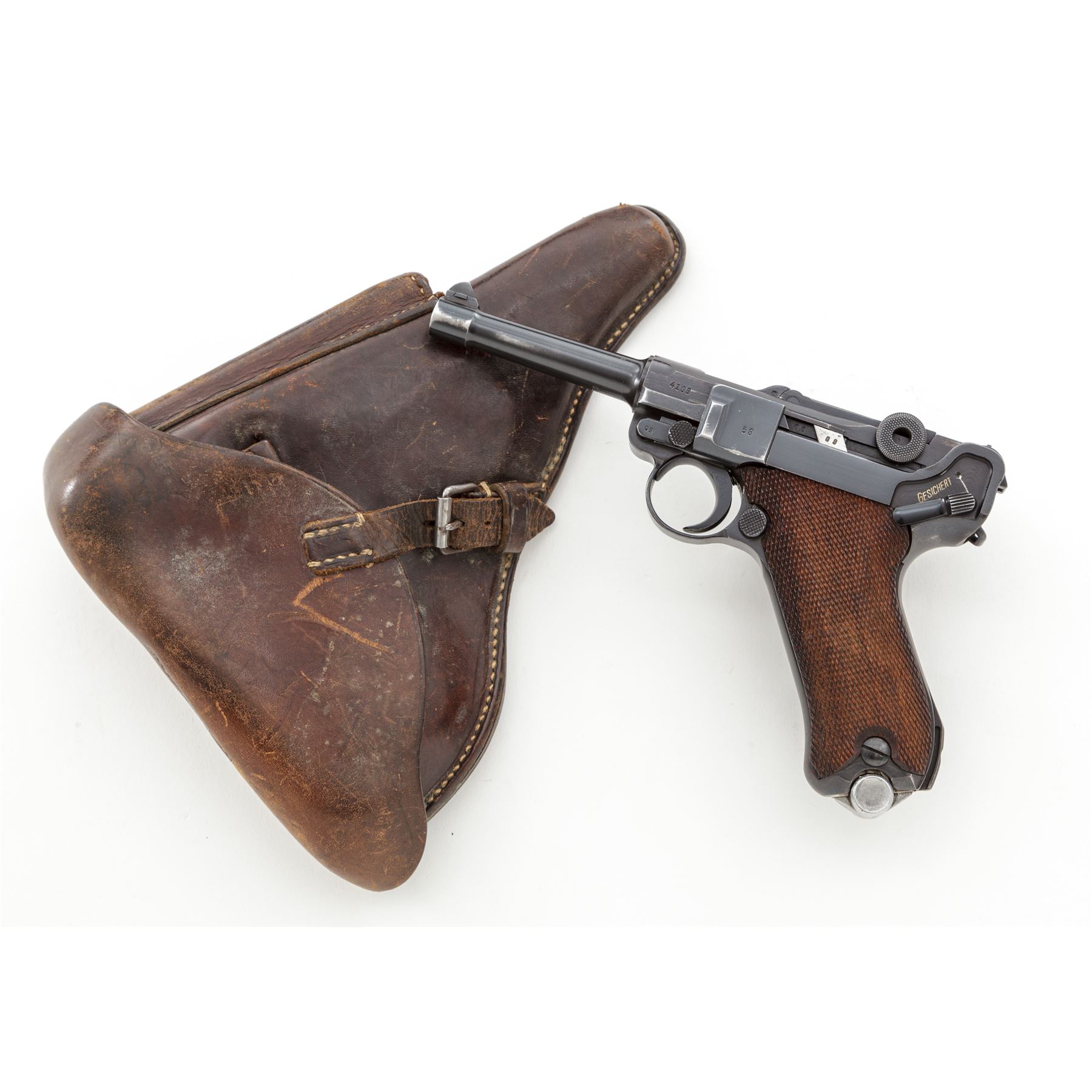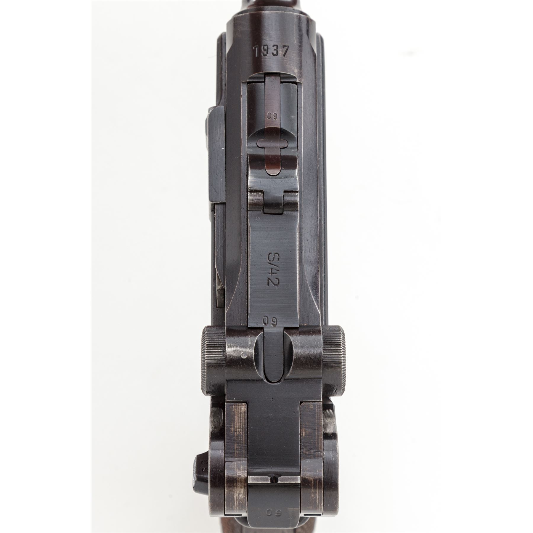 German P.08 Mauser Luger (1937), with brown 1937 dated holster, two mags, and combination tool, #4109x, 9mm, 4'' barrel, blue finish, factory checkered walnut grips, with one mismatched nickel-plated aluminum based magazine. Chamber dated 1937, toggle marked ''S/42'', thumb safety marked ''Gesichert'', ''Geladen'' to extractor. All visible matching serial numbers, except sideplate and magazines. Condition is excellent retaining approx. 92% thinning blue, with losses to lower portion of barrel and highpoints of mismatched sideplate. Front and backstrap have thinned to approx. 60% of their original finish. Grips with minor flattening and oil darkening near edges. Good action, mirror bright bore. Holster with light to moderate general scuffing and thinning to brown dye; nice tight white stitching. Est.: $800-$1,200. (C&R)
