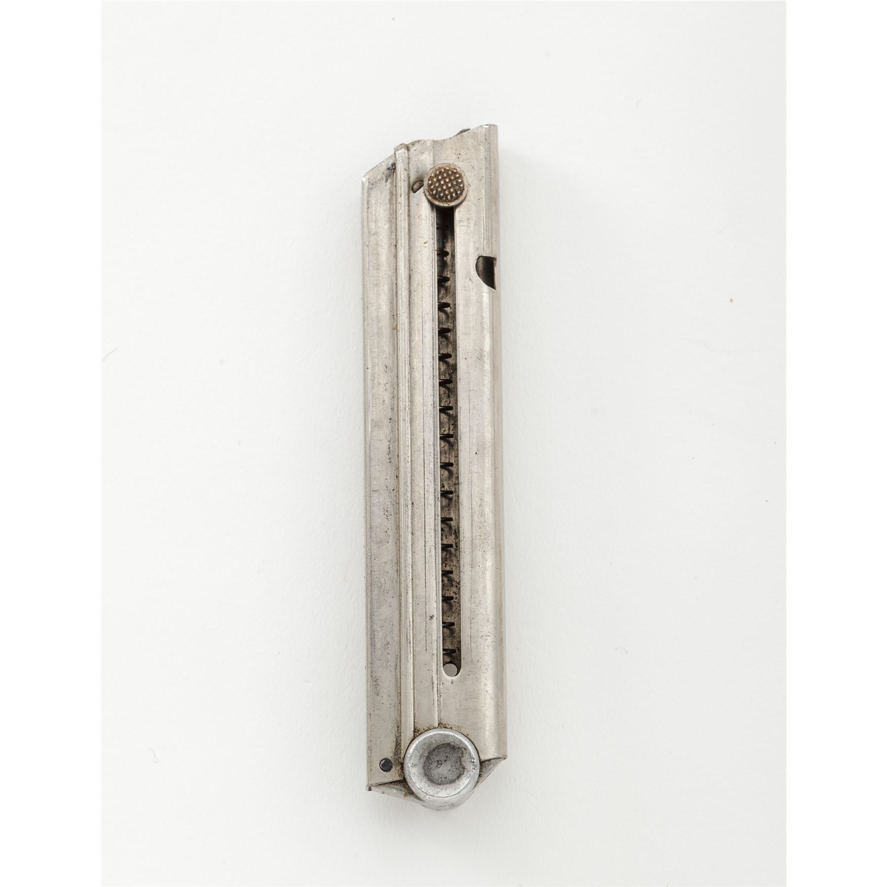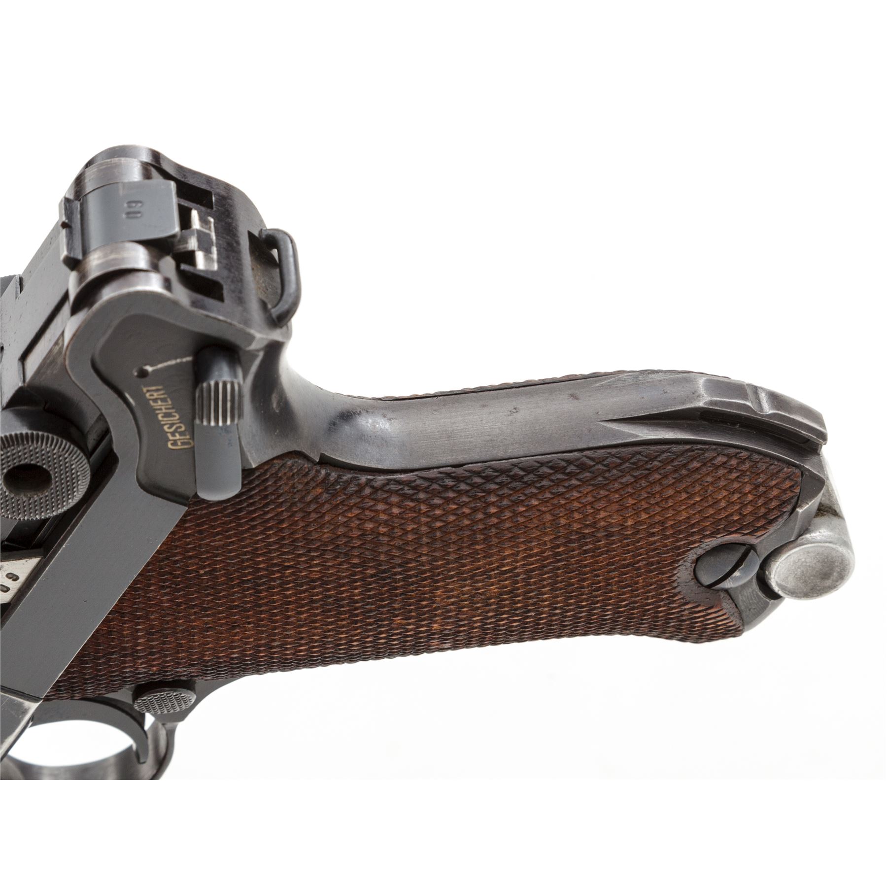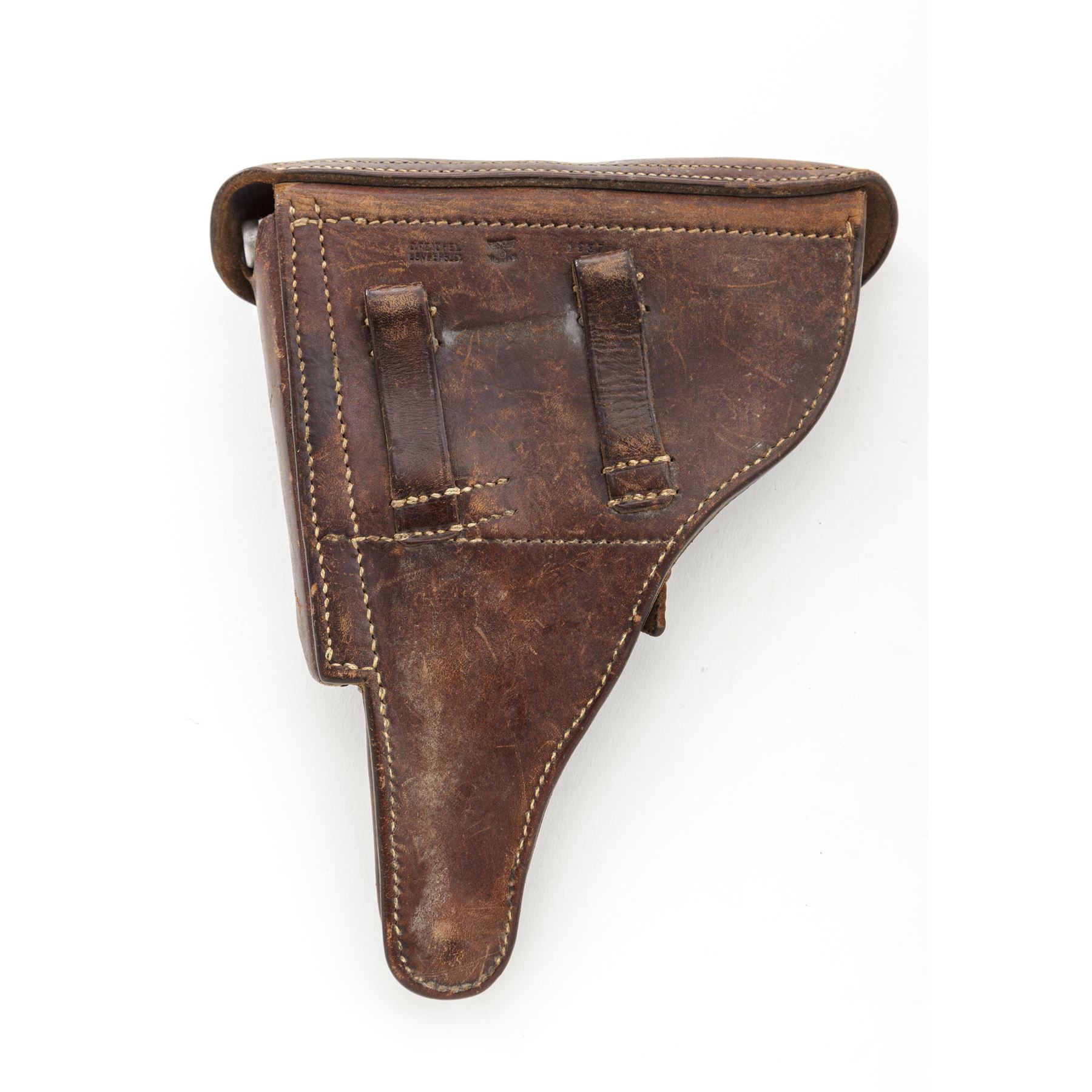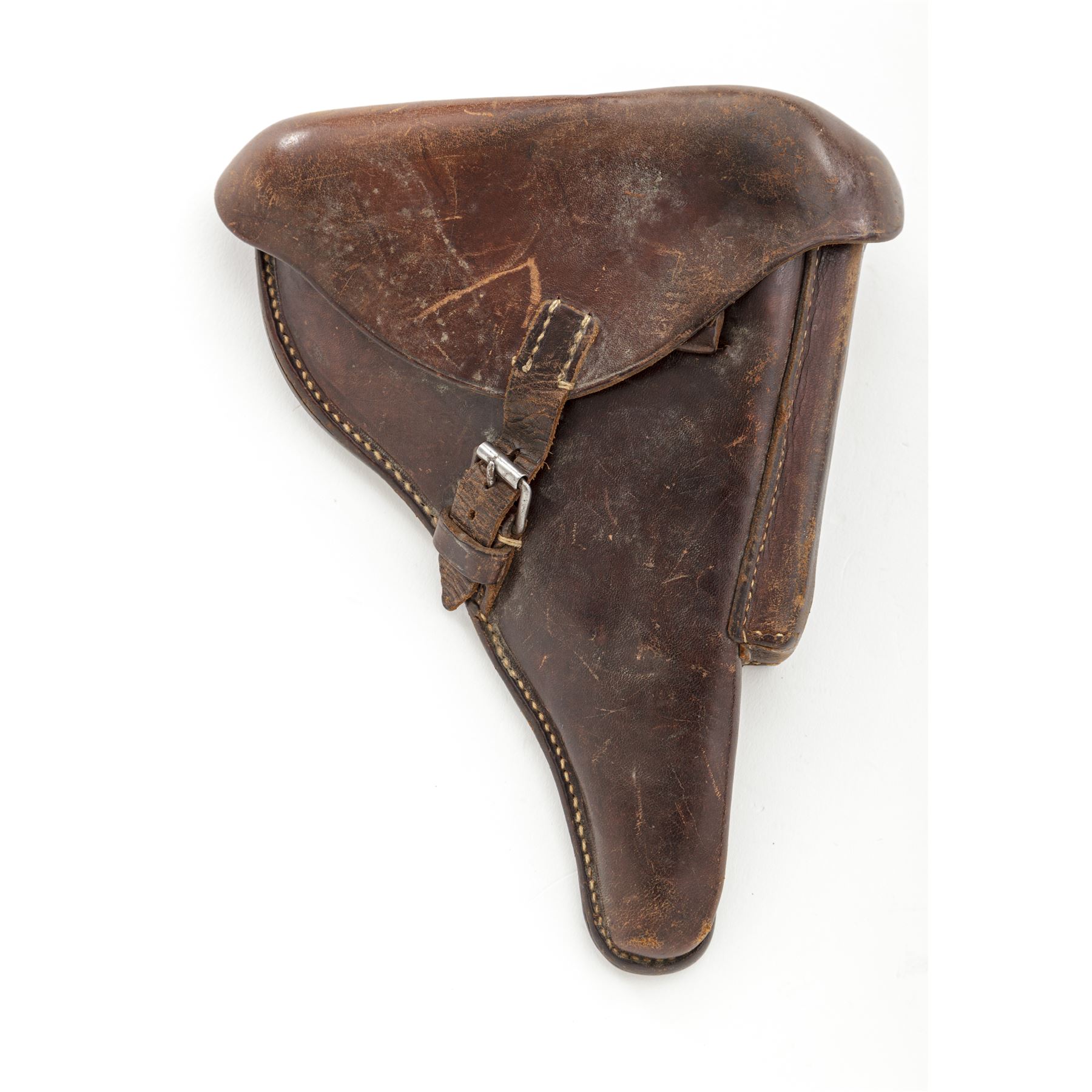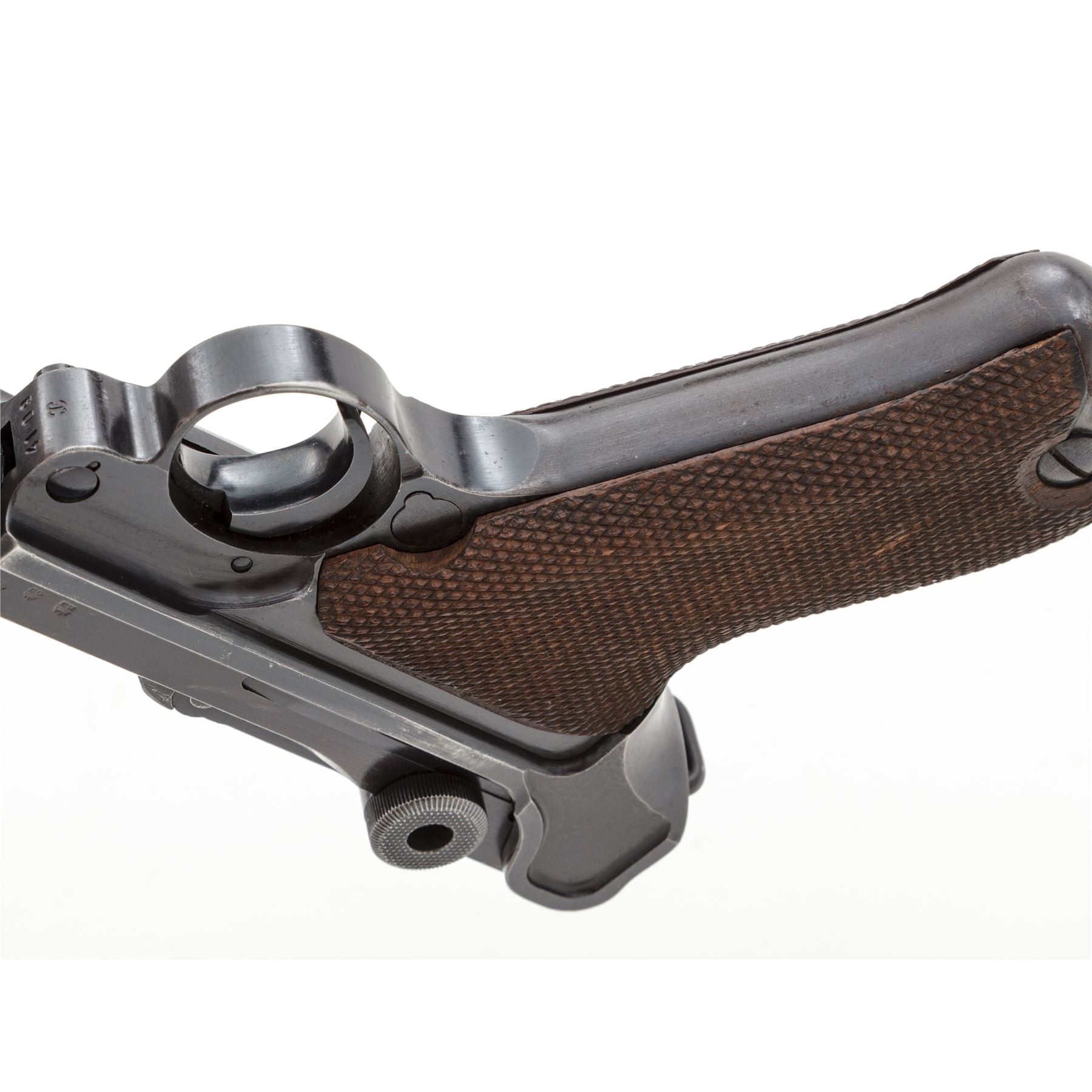 German P.08 Mauser Luger (1937), with brown 1937 dated holster, two mags, and combination tool, #4109x, 9mm, 4'' barrel, blue finish, factory checkered walnut grips, with one mismatched nickel-plated aluminum based magazine. Chamber dated 1937, toggle marked ''S/42'', thumb safety marked ''Gesichert'', ''Geladen'' to extractor. All visible matching serial numbers, except sideplate and magazines. Condition is excellent retaining approx. 92% thinning blue, with losses to lower portion of barrel and highpoints of mismatched sideplate. Front and backstrap have thinned to approx. 60% of their original finish. Grips with minor flattening and oil darkening near edges. Good action, mirror bright bore. Holster with light to moderate general scuffing and thinning to brown dye; nice tight white stitching. Est.: $800-$1,200. (C&R)