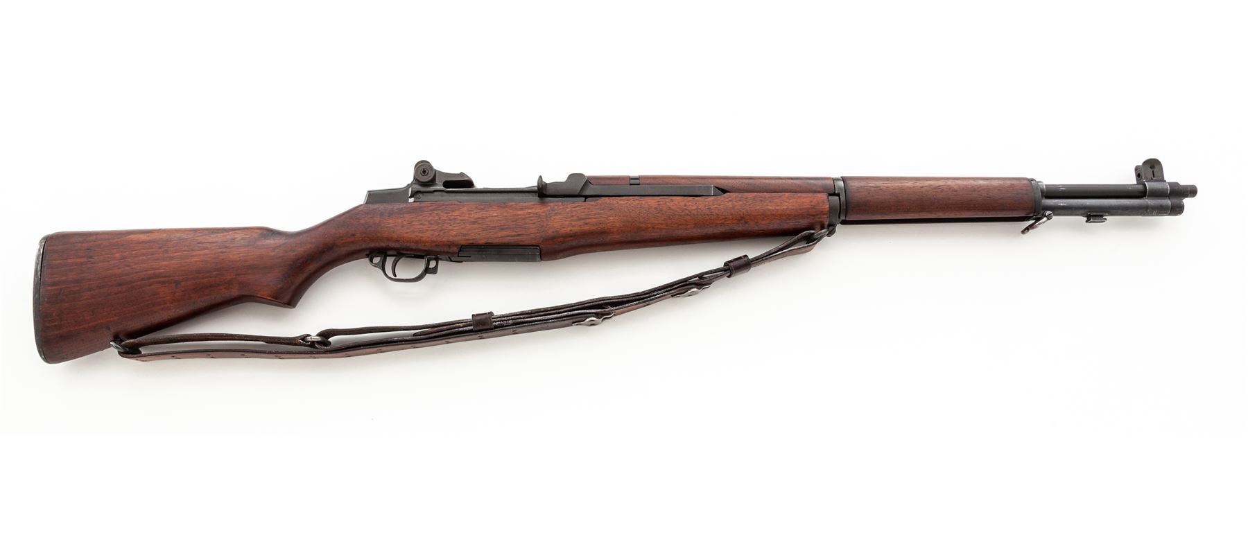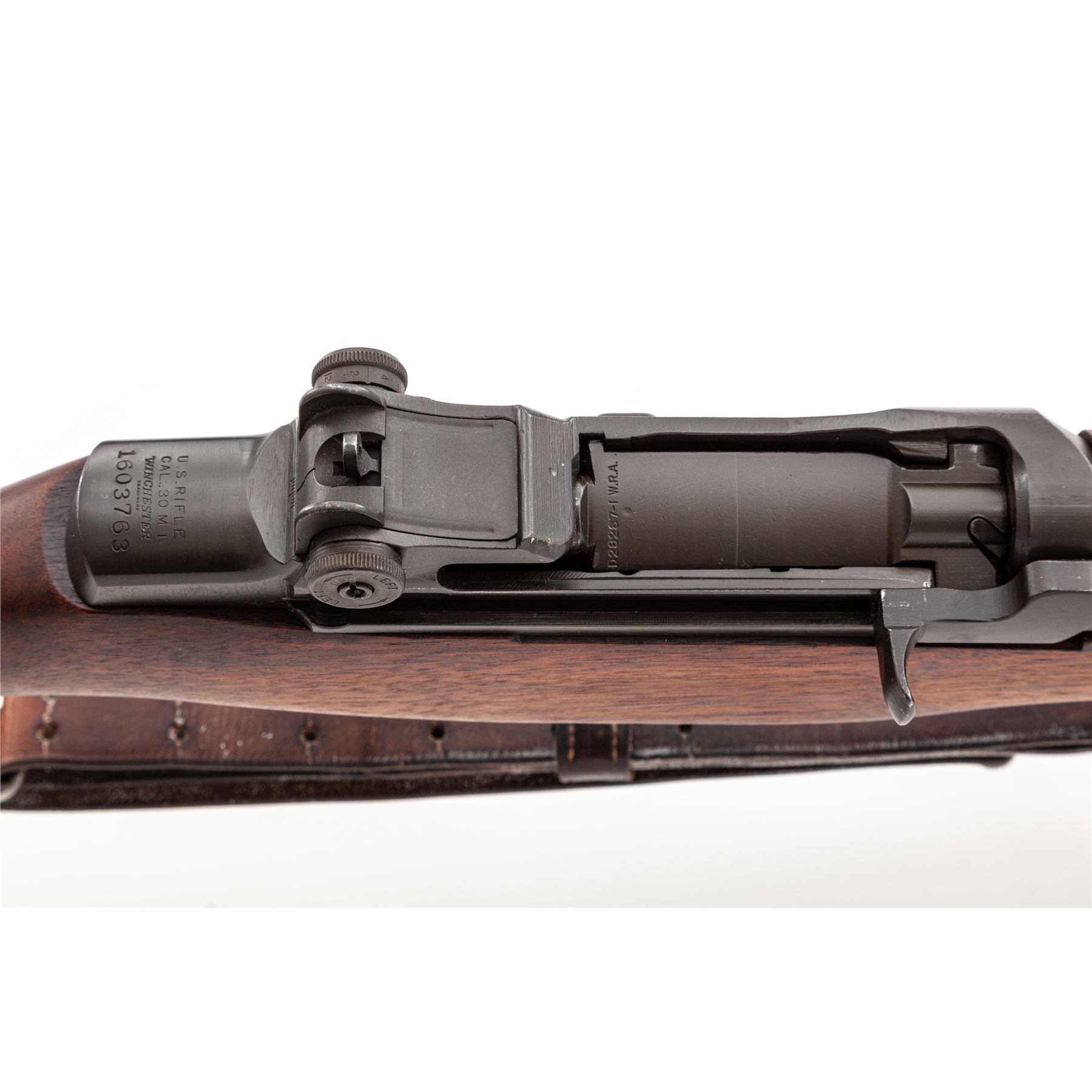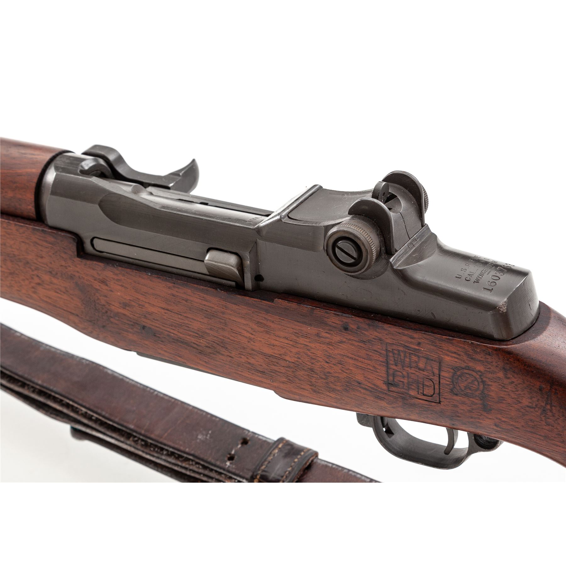 Winchester M1 Garand Semi-Automatic Rifle, #1603763, .30-06 cal., 24'' barrel, parkerized finish, walnut stock, blade front sight with protecting ears and adjustable aperture rear sight. Marked on receiver tang ''U.S.RIFLE CAL. .30 M1 WINCHESTER''. Barrel stamped with circled ''Winchester Proof'' stamp. Operating rod, bolt, trigger housing, hammer, and triggerguard all marked ''WRA''. Left side of stock is stamped with a boxed ''WRA GHD'' cartouche and a crossed cannons ''Ordnance wheel'' stamp. There is a ''circle P'' firing proof on underside of wrist. Condition overall is excellent with over 95% of the refinish remaining on the metal. Wood is excellent with an even color and light handling marks. Action is smooth, bore is excellent with sharp rifling. Includes a U.S.M-10 cleaning kit and grease pots in the butt trap, and a U.S.G.I. M-1907 leather sling stamped ''BOYT 44'' in good condition. Est.: $1,200-$1,800. (C&R)