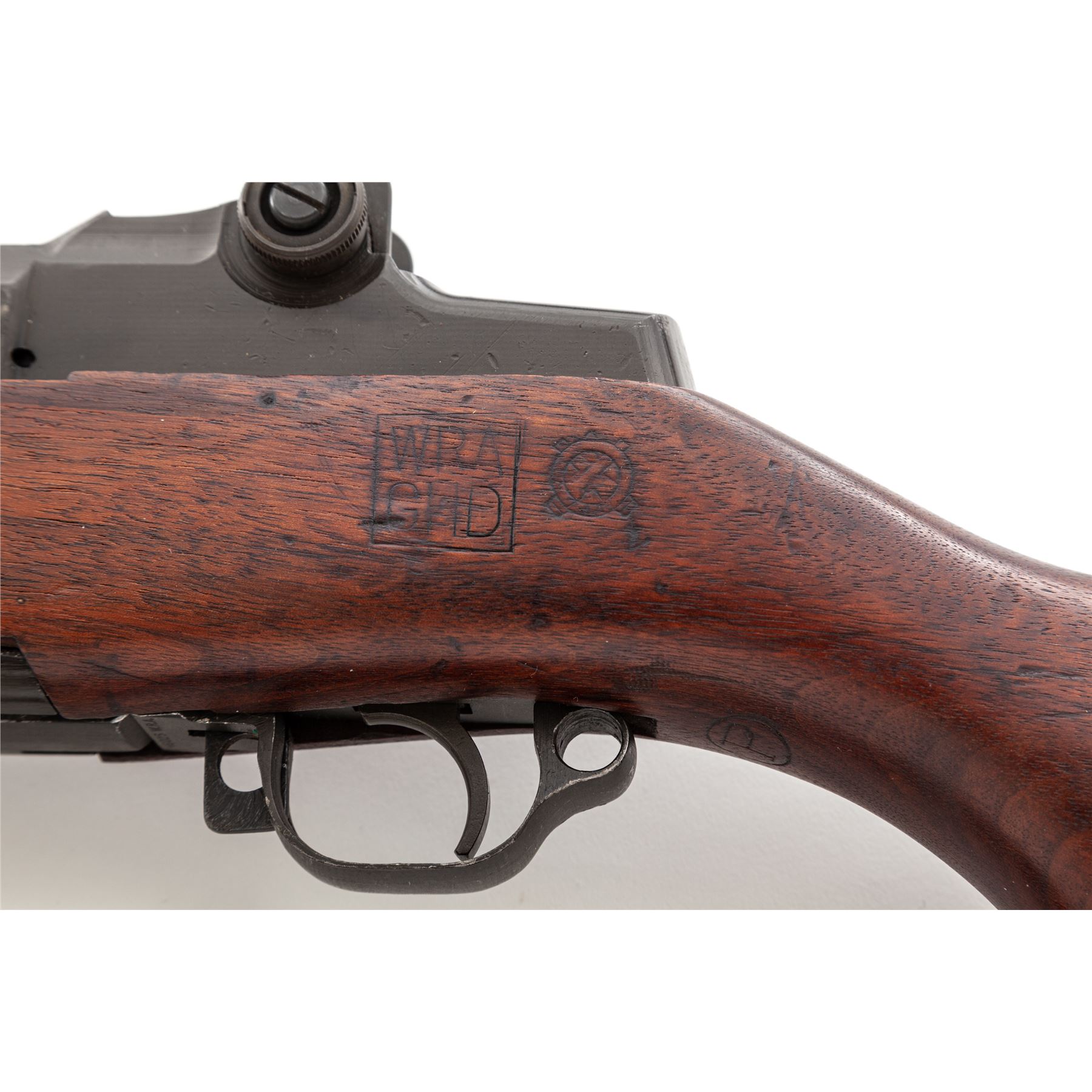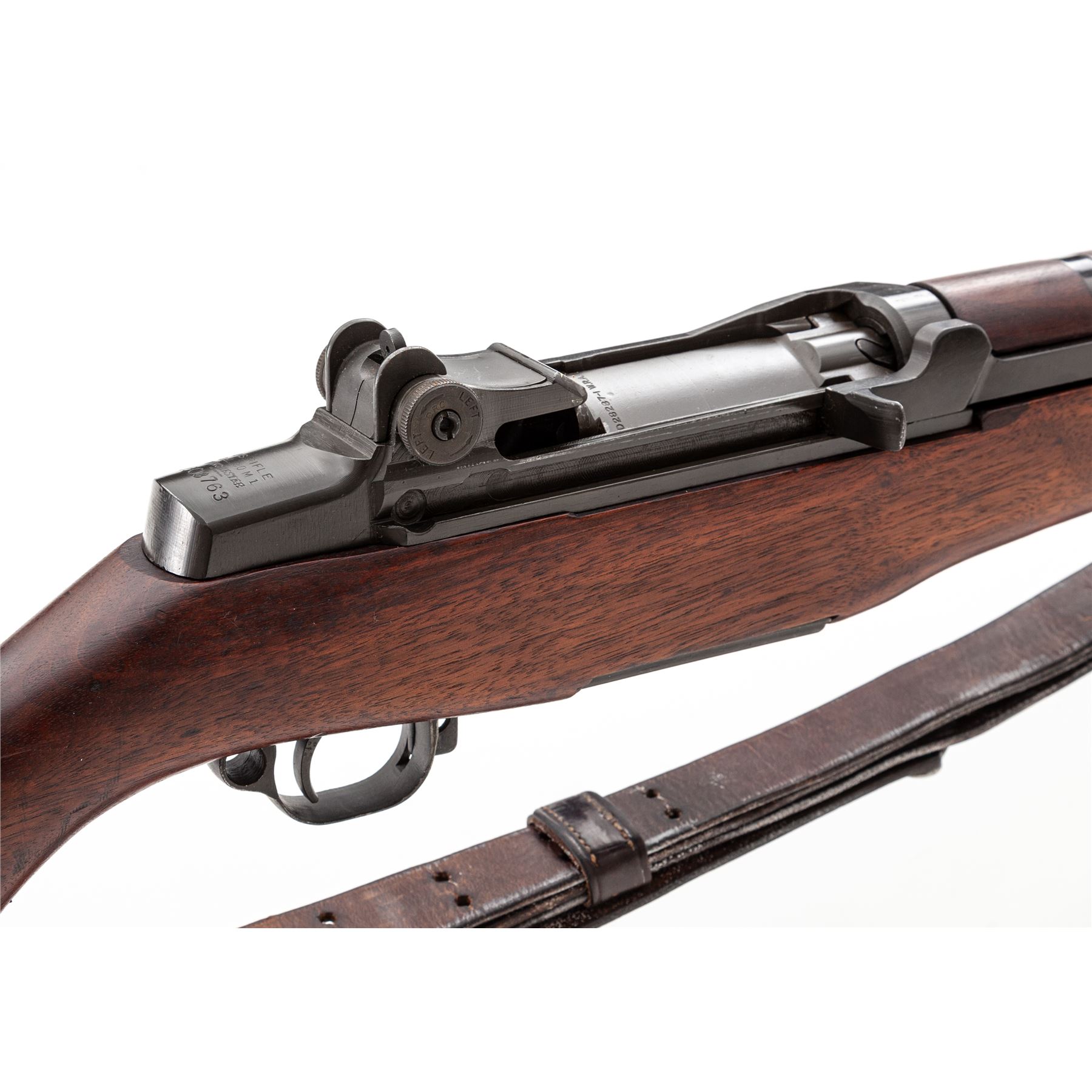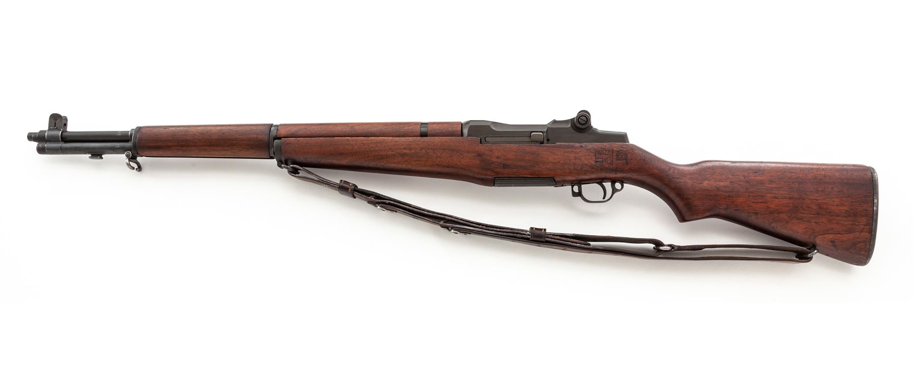 Winchester M1 Garand Semi-Automatic Rifle, #1603763, .30-06 cal., 24'' barrel, parkerized finish, walnut stock, blade front sight with protecting ears and adjustable aperture rear sight. Marked on receiver tang ''U.S.RIFLE CAL. .30 M1 WINCHESTER''. Barrel stamped with circled ''Winchester Proof'' stamp. Operating rod, bolt, trigger housing, hammer, and triggerguard all marked ''WRA''. Left side of stock is stamped with a boxed ''WRA GHD'' cartouche and a crossed cannons ''Ordnance wheel'' stamp. There is a ''circle P'' firing proof on underside of wrist. Condition overall is excellent with over 95% of the refinish remaining on the metal. Wood is excellent with an even color and light handling marks. Action is smooth, bore is excellent with sharp rifling. Includes a U.S.M-10 cleaning kit and grease pots in the butt trap, and a U.S.G.I. M-1907 leather sling stamped ''BOYT 44'' in good condition. Est.: $1,200-$1,800. (C&R)