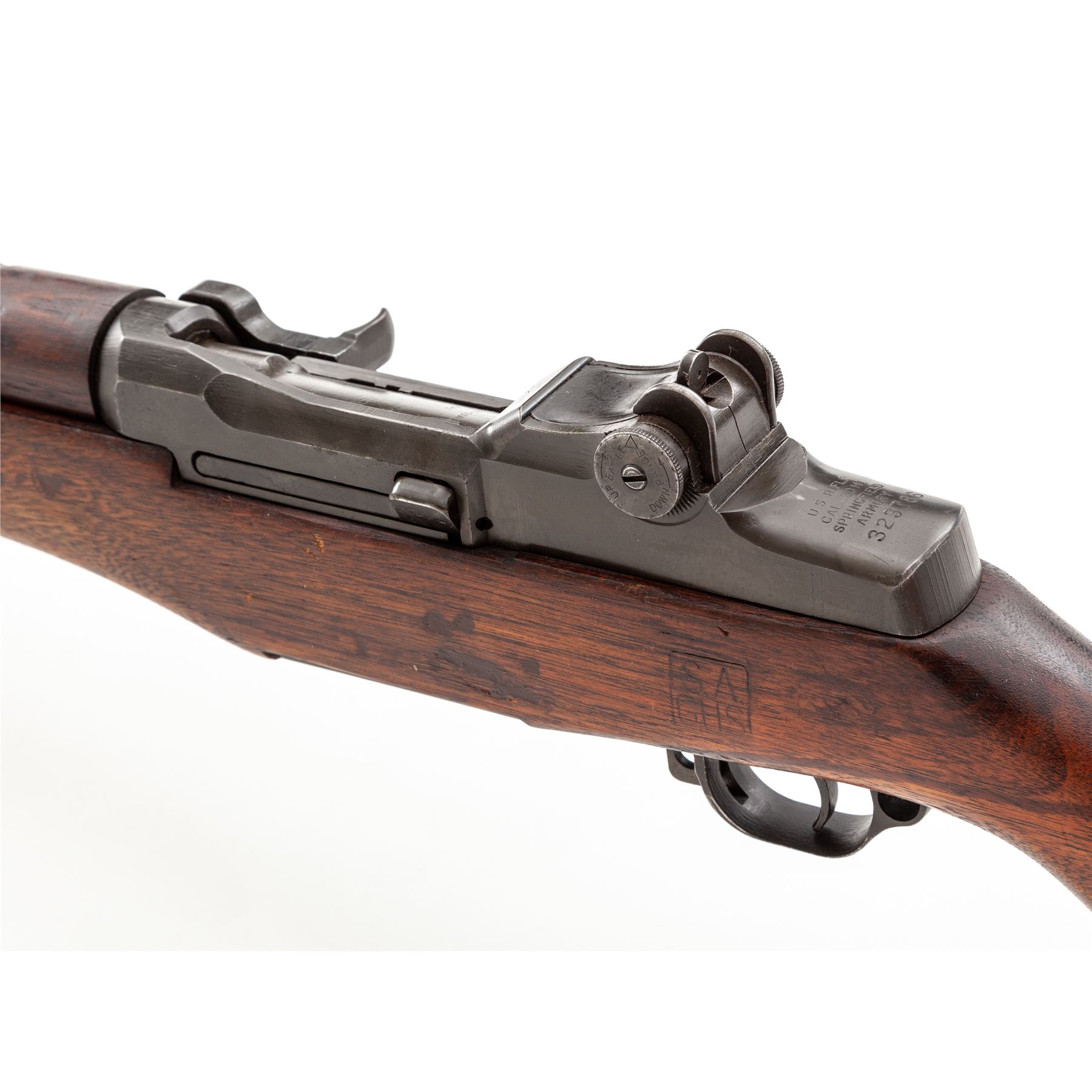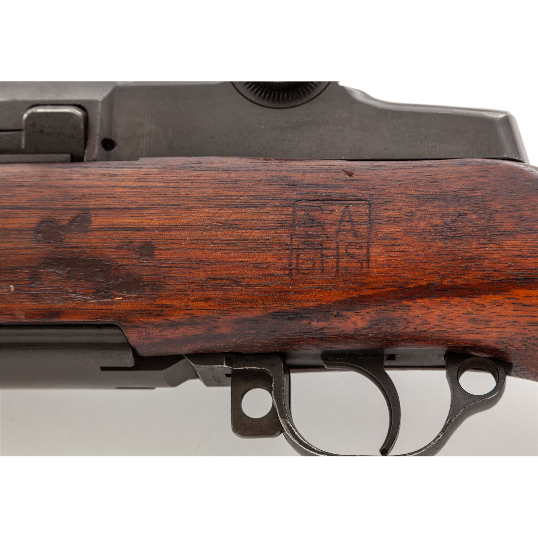 Lend Lease Springfield M1 Garand Semi-Automatic Rifle, #323786, .30-06 cal., 24'' barrel, parkerized finish, walnut stock, blade front sight with protecting ears and early ''flush nut'' rear sight. Marked on receiver tang ''U.S.RIFLE CAL. .30 M1 SPRINGFIELD ARMORY''. Barrel is marked ''S-A 8-41''. British Birmingham export proofmarks are stamped below the barrel date. Bolt, trigger housing, operating rod, triggerguard, and hammer are all marked ''SA''. Stock is stamped on the left side with a boxed ''S.A. GHS'' cartouche (Gilbert H Stewart) next to a faint Ordnance Dept. ''wheel cartouche''. There is a ''circle P'' firing proof on underside of wrist. Gas cylinder lock screw is early solid type. Condition overall is very good with approx. 85% finish remaining on the metal with most of the finish loss to the gas cylinder. Stock has several areas where wood putty was used to fill impressions on left side of forend, otherwise, wood has an even color and light handling marks. Action is smooth, bright bore is excellent with sharp rifling. Est.: $2,000-$2,500. (C&R)